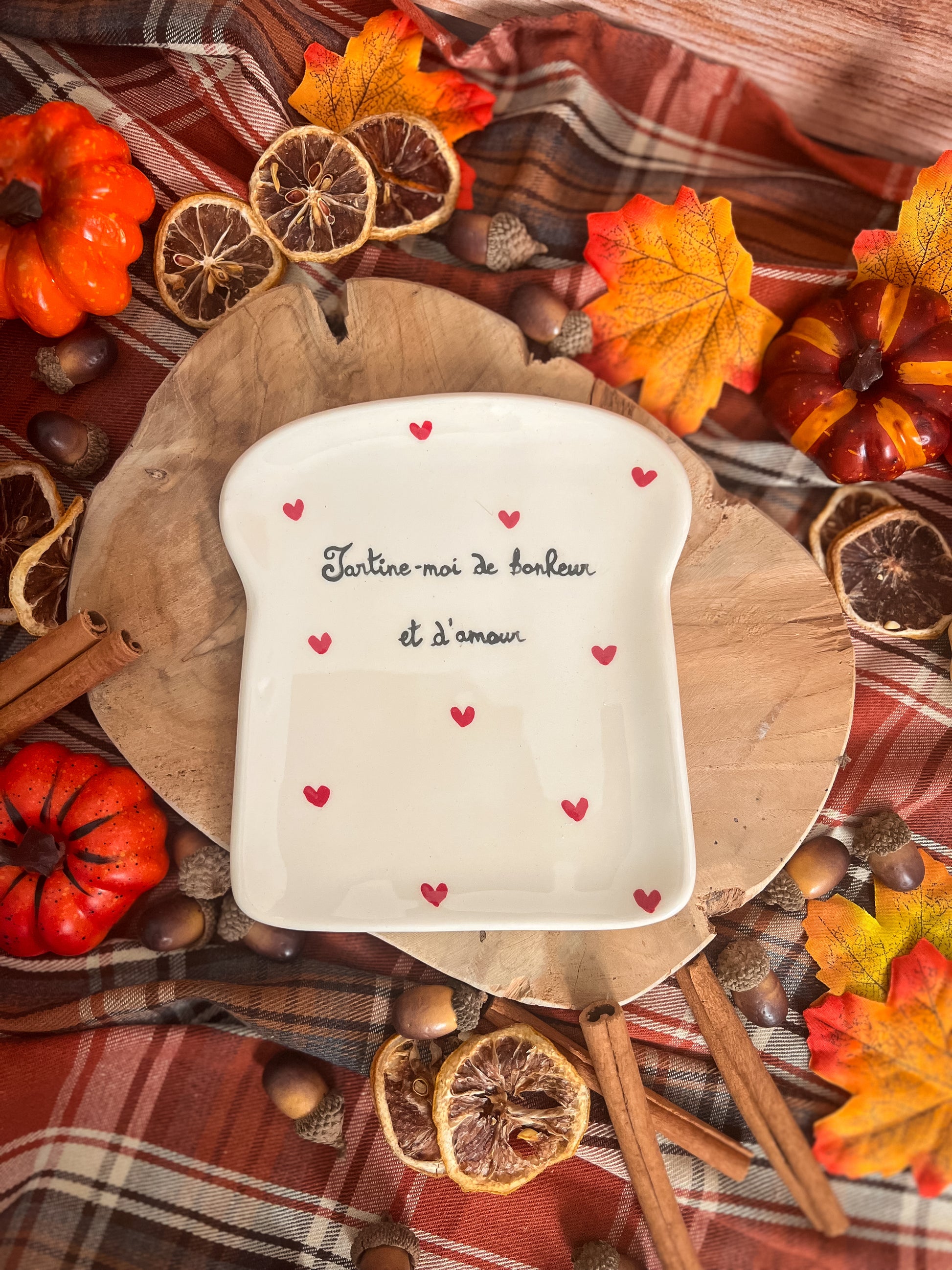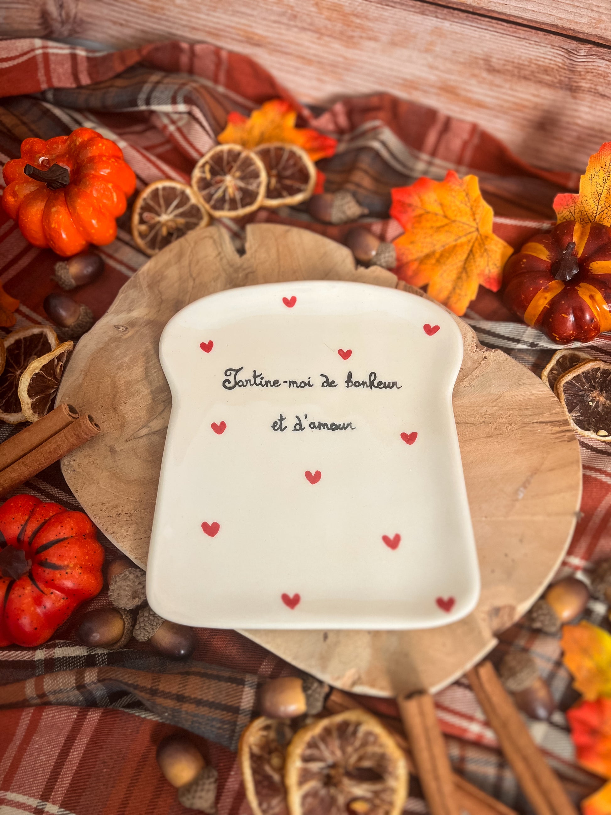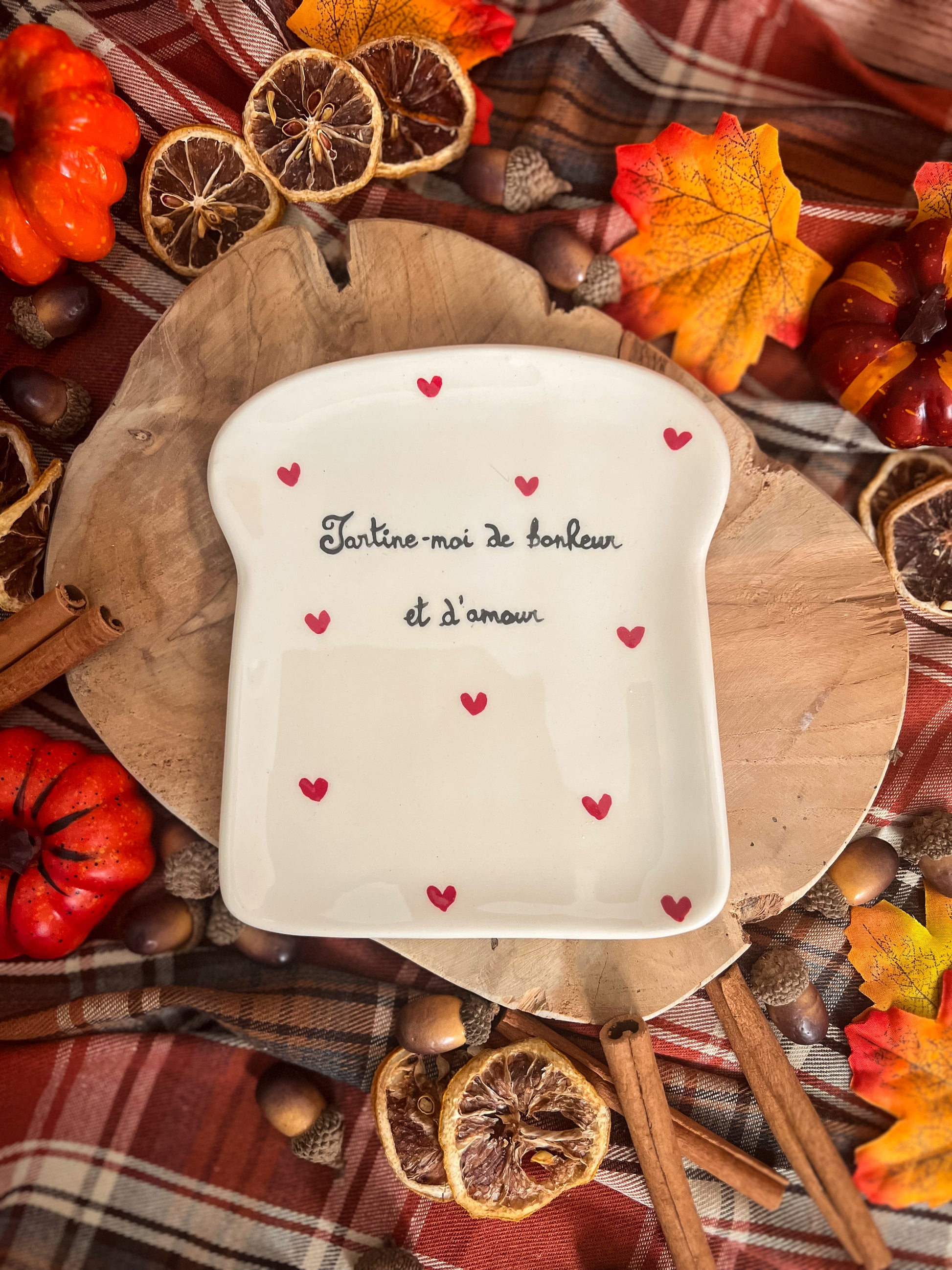 Inscription: « Tartine-moi de bonheur et d’amour » et motifs petits cœurs rouges ♥️