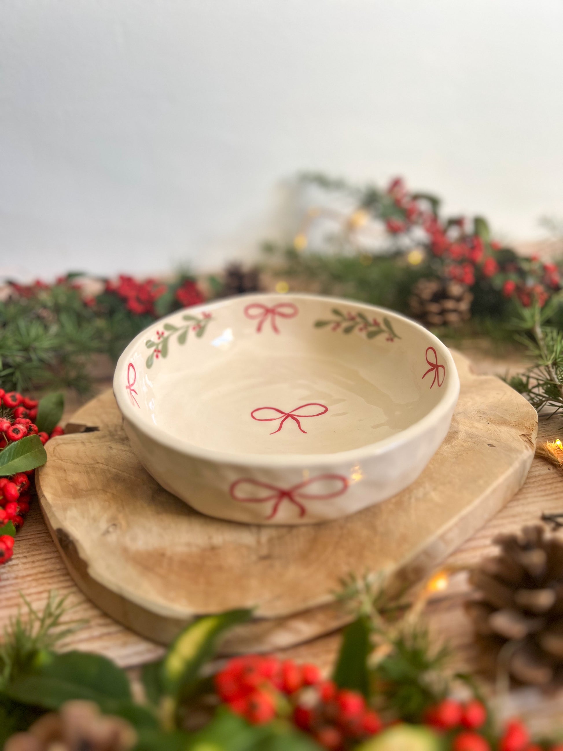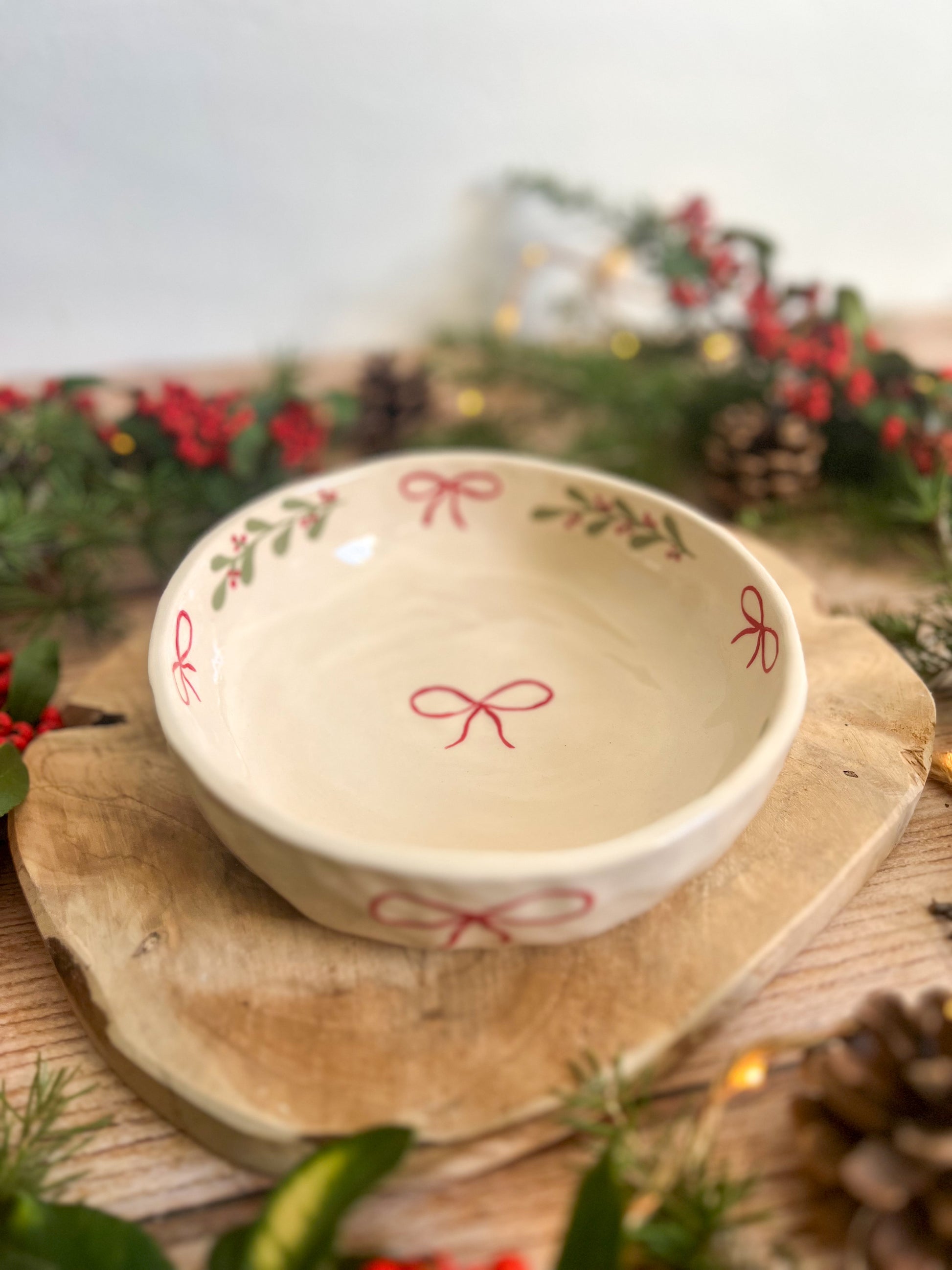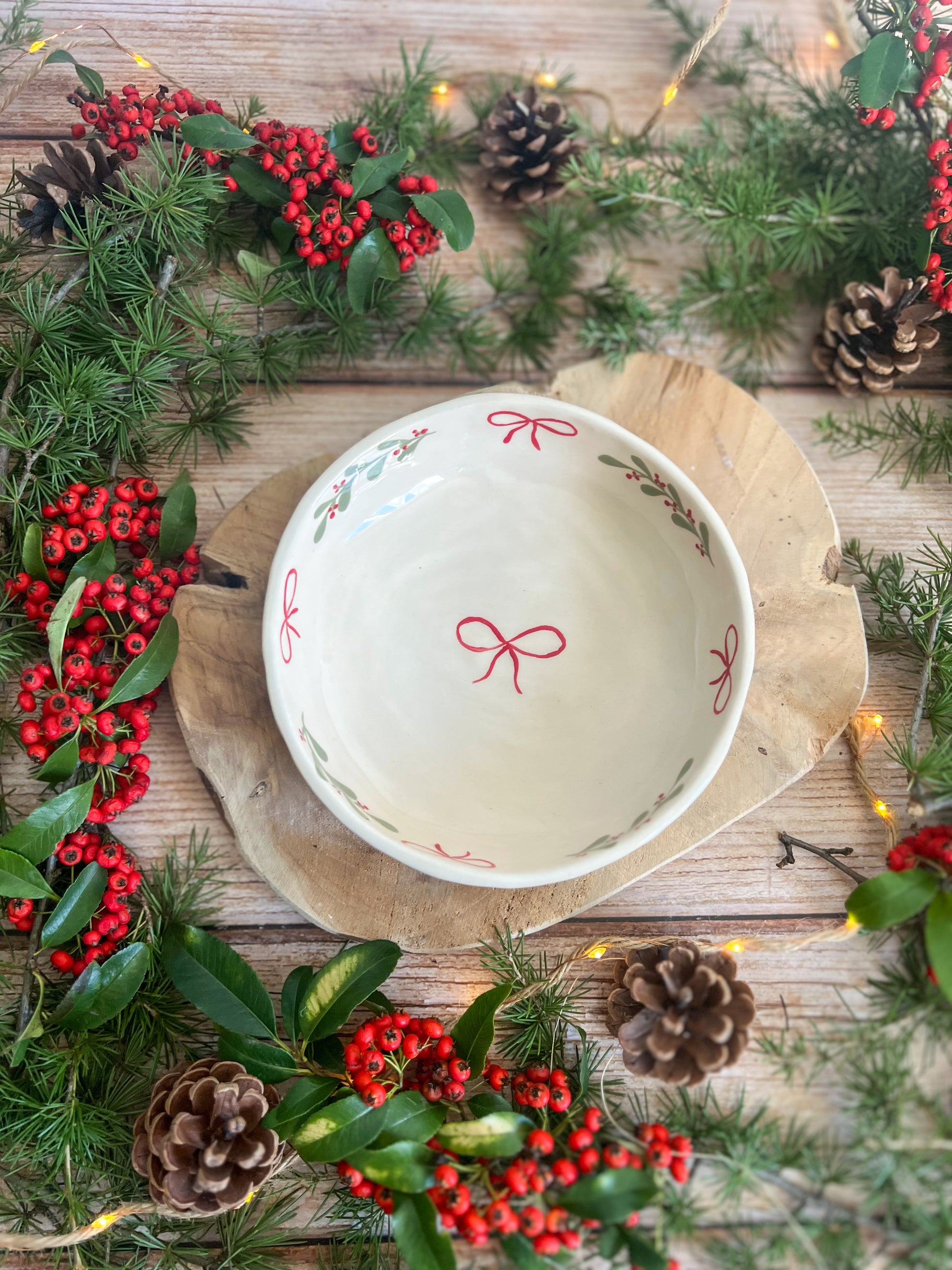 Bol bas décoré de petits nœuds rouges et de baies délicates, peintes à la main dans une ambiance hivernale et chaleureuse 🎀