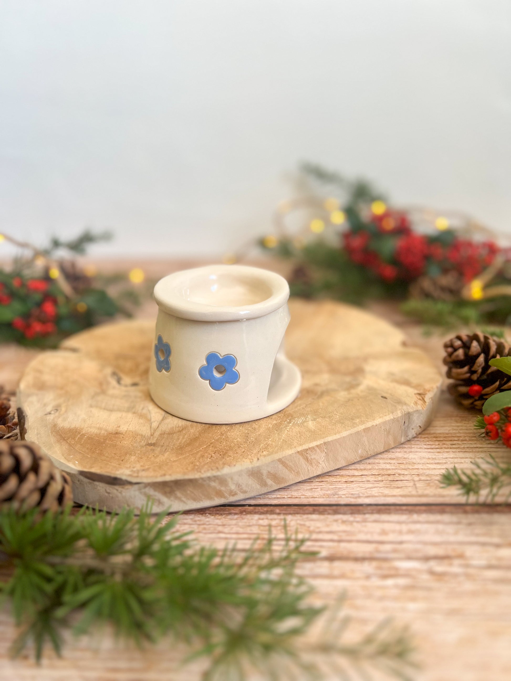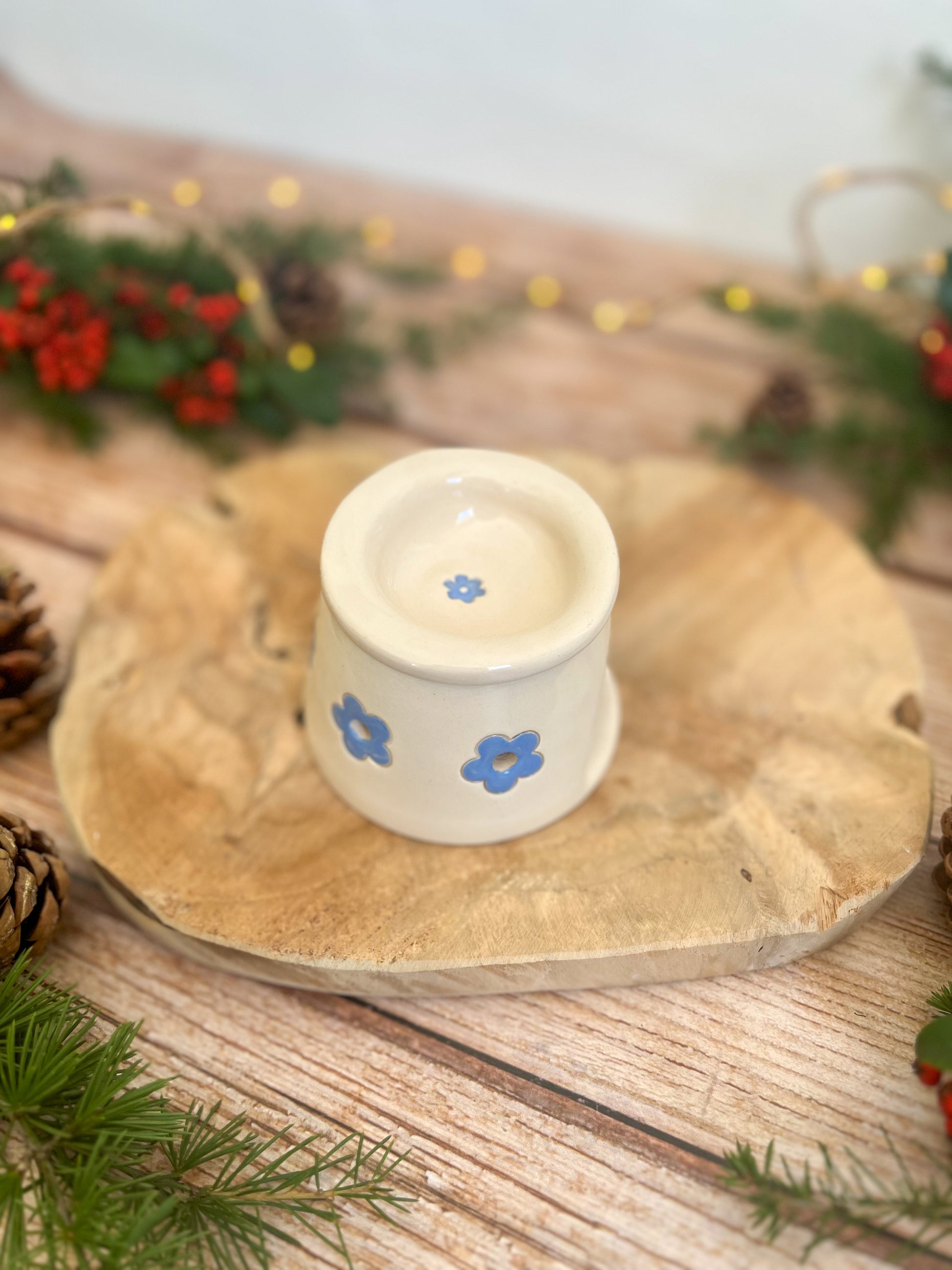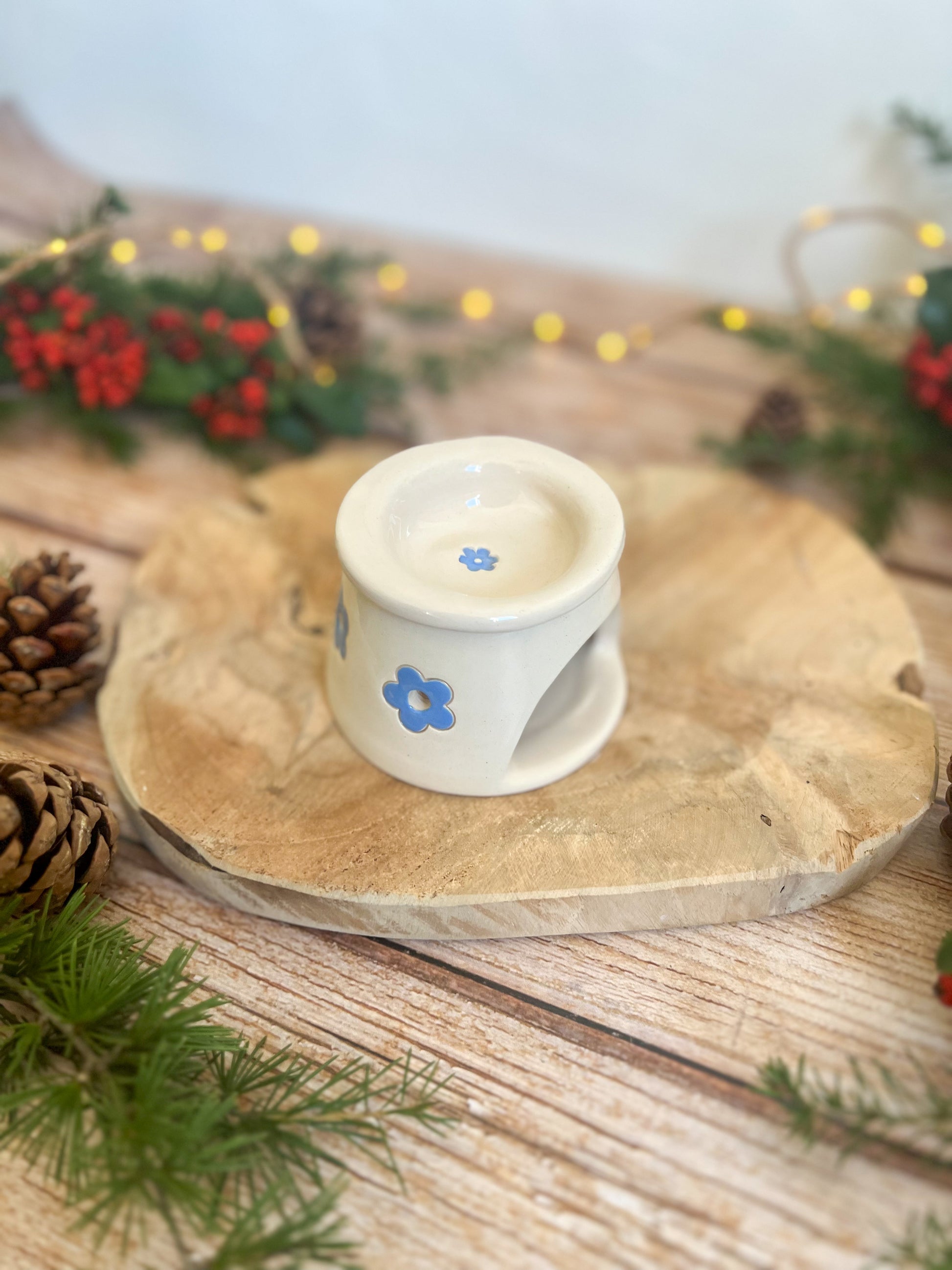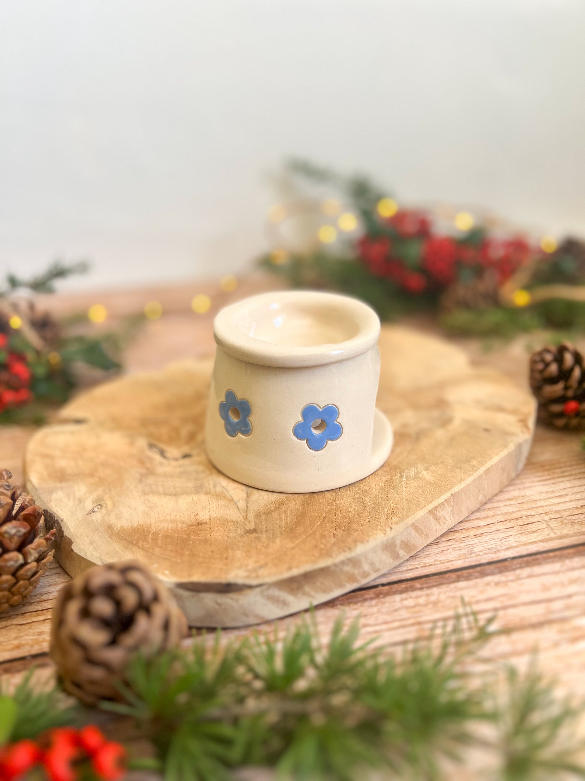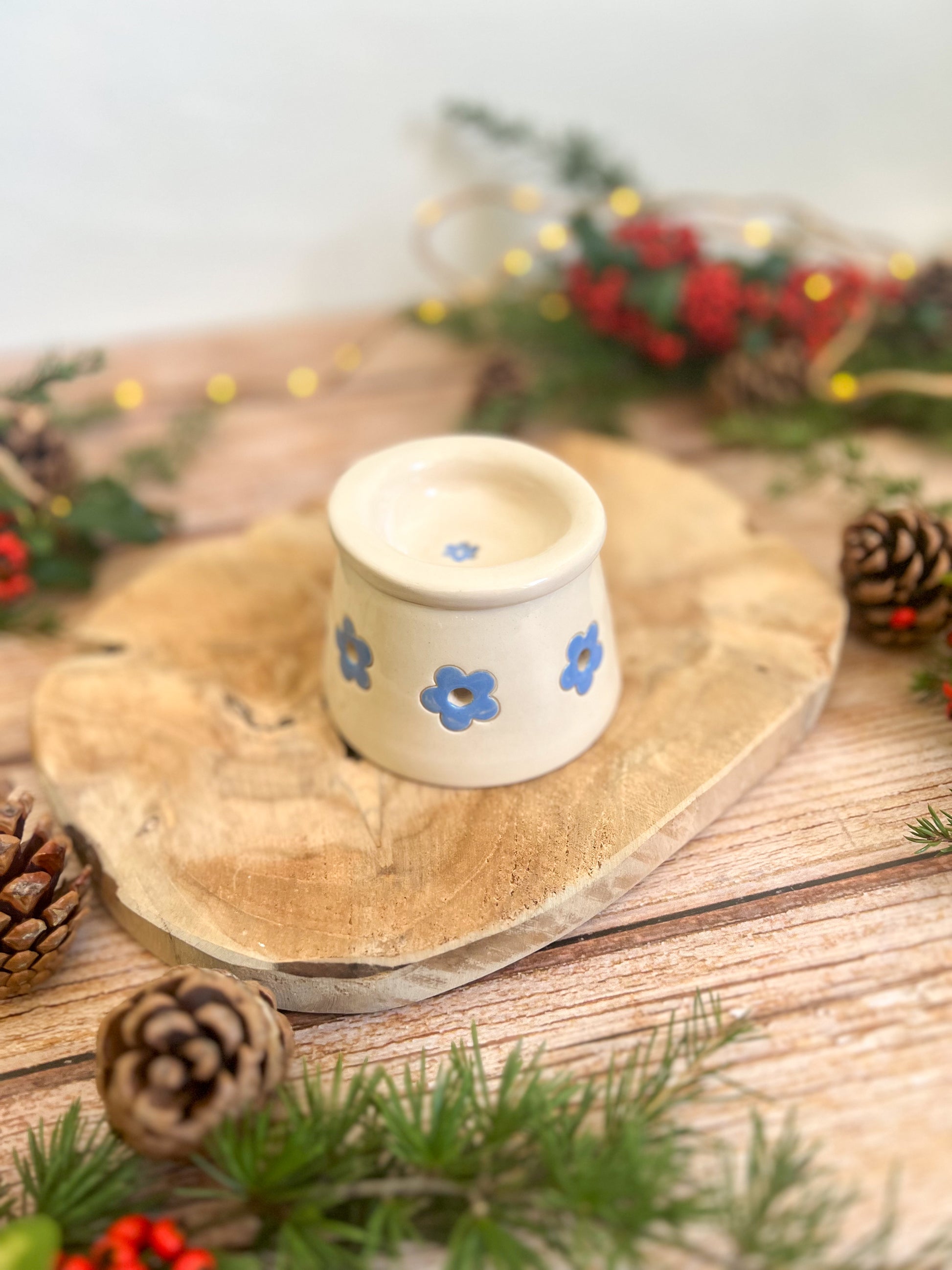 - Le haut : délicatement orné d’une fleur tamponnée et peinte, il accueille votre cire parfumée ou vos huiles essentielles.