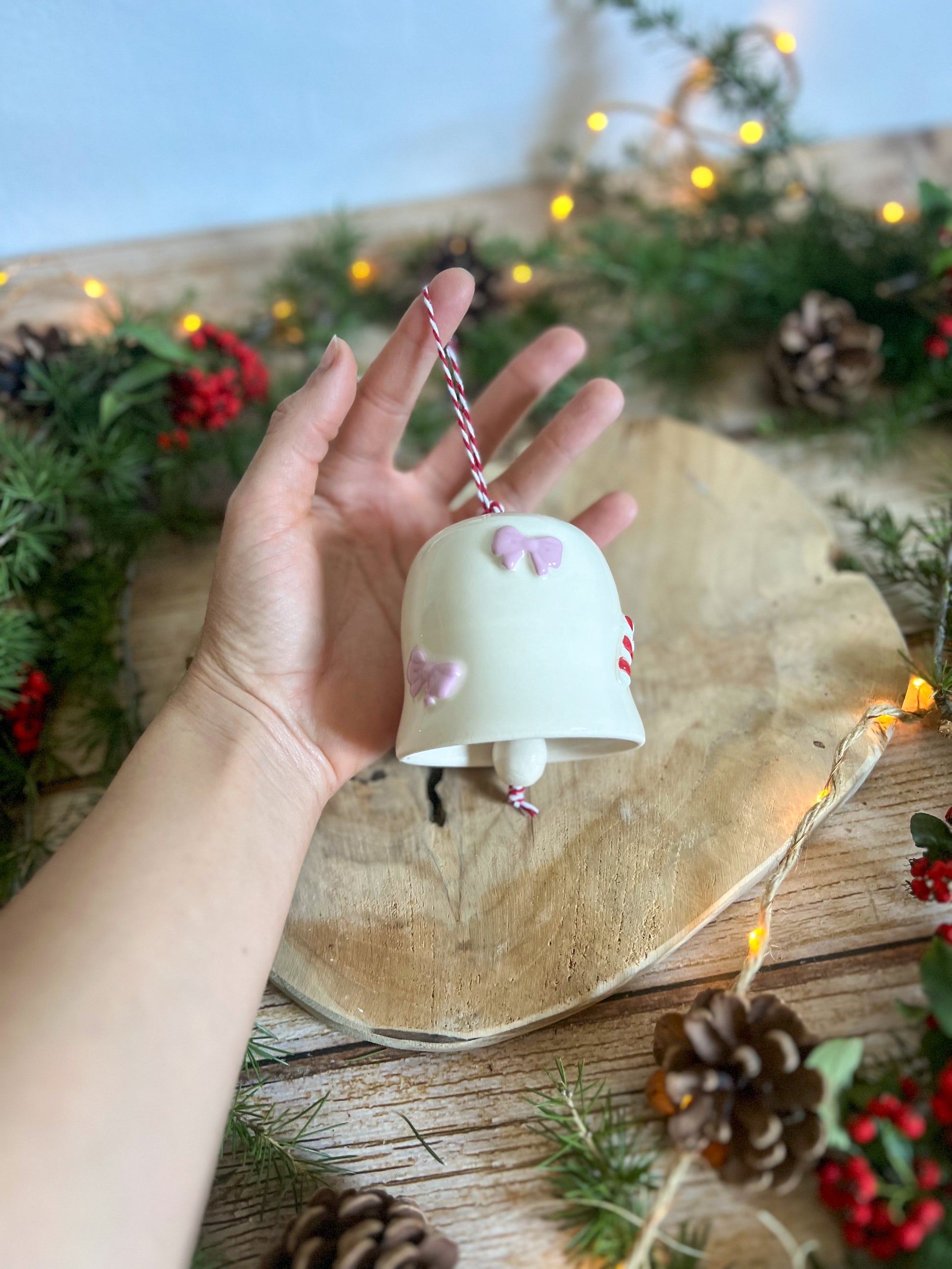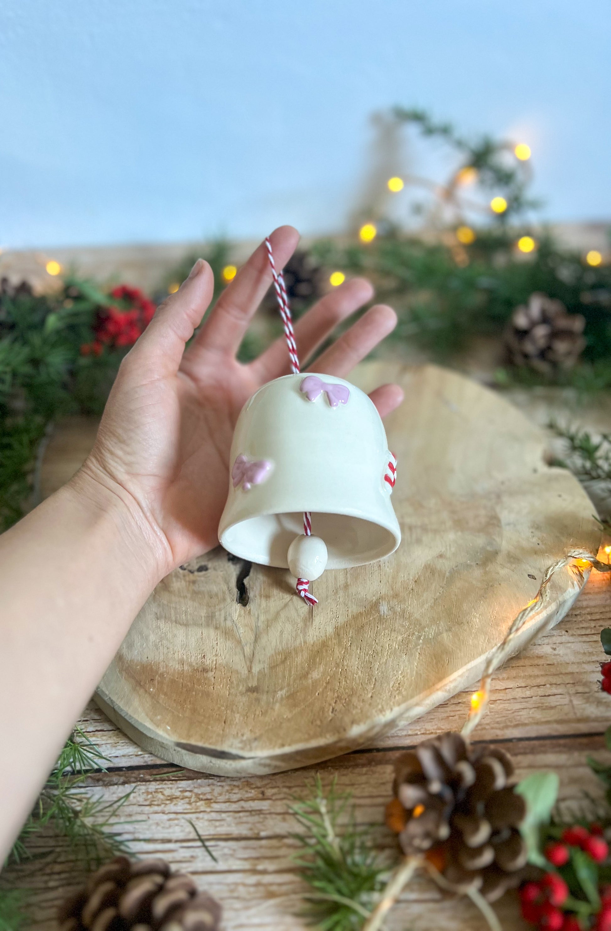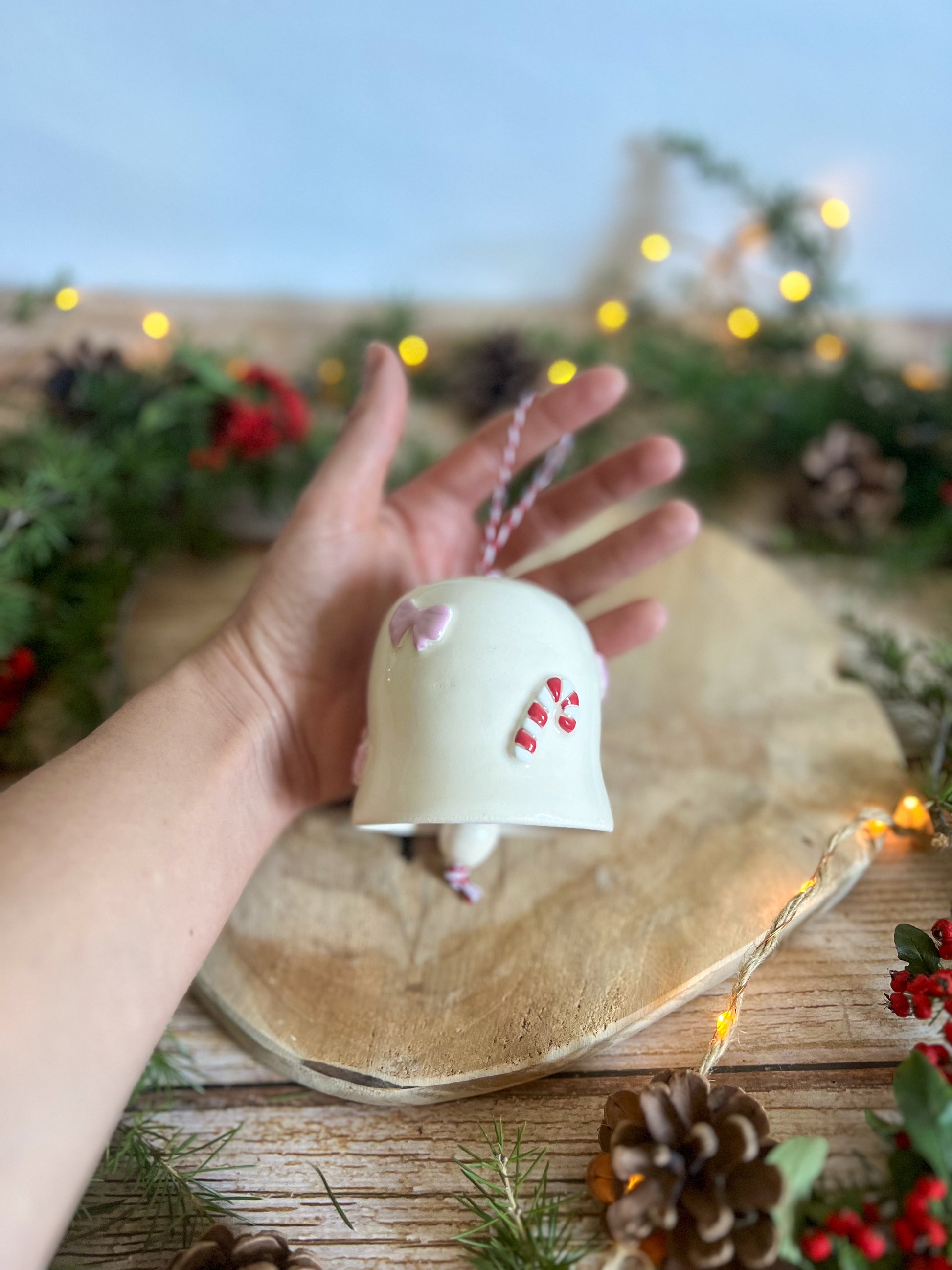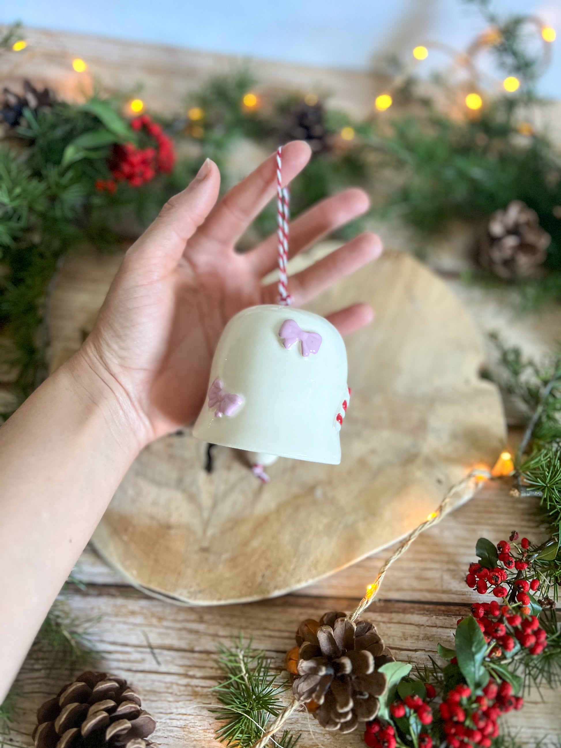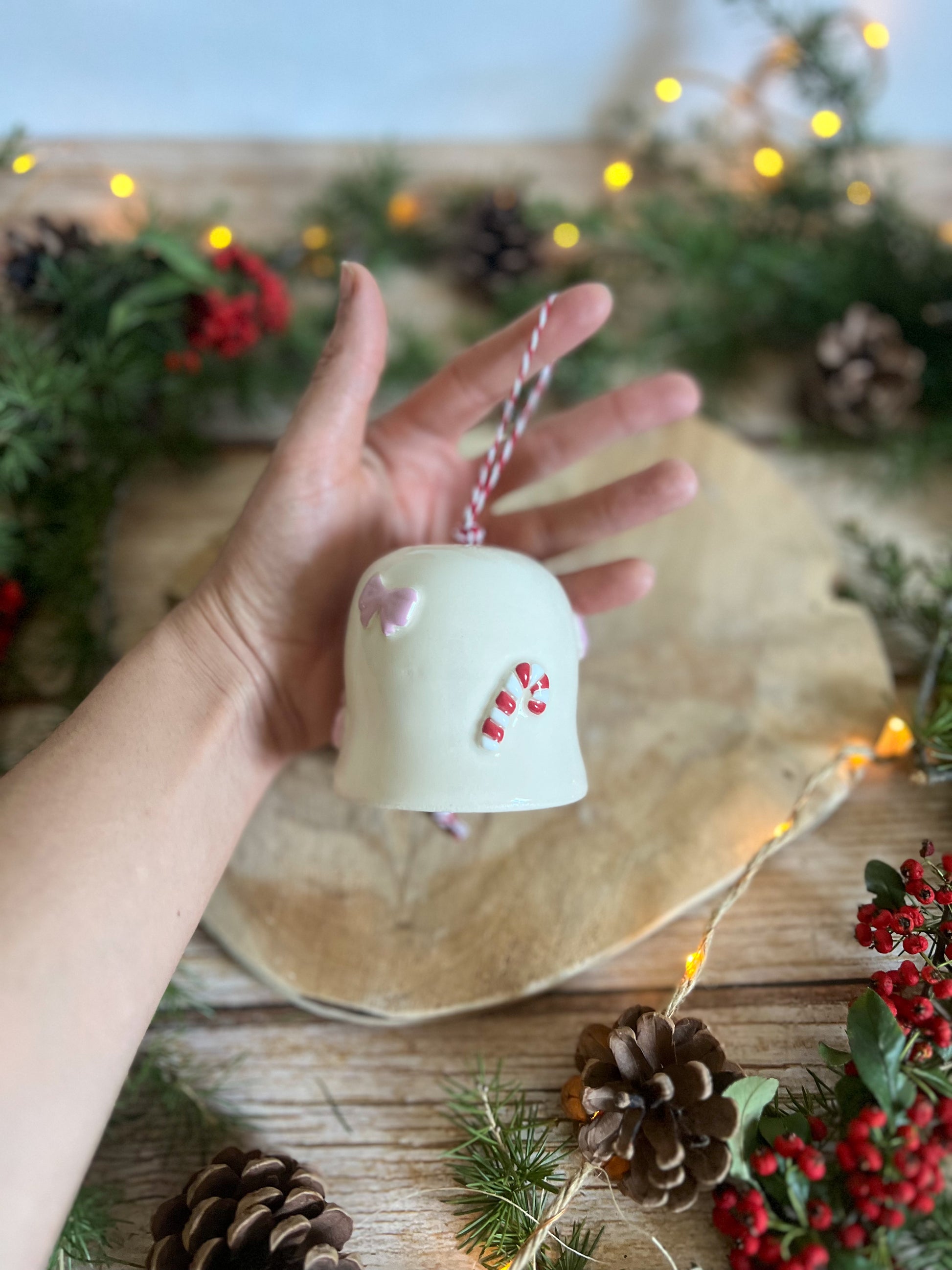 Cloche de Noël décorée de petits motifs sucre d’orge et de nœuds roses peints à la main 🍭🎀