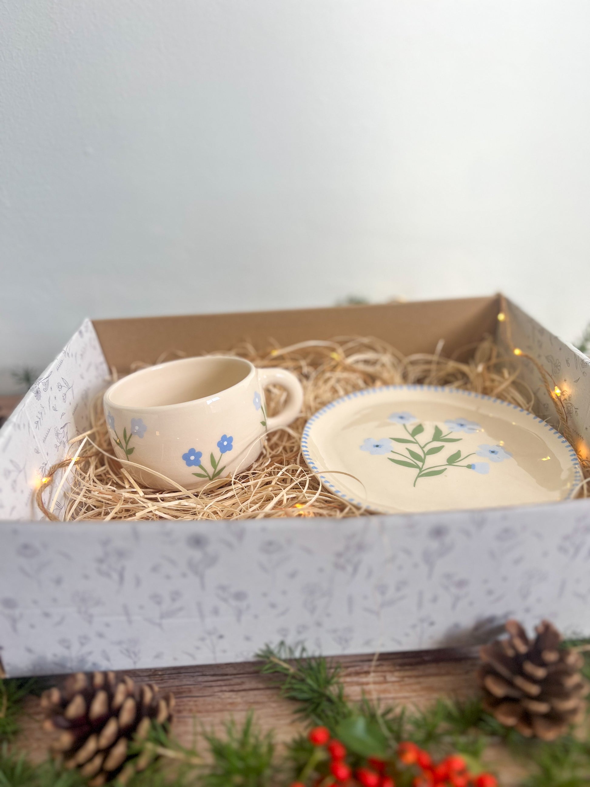 Coffret composé d’une tasse décorée de petites fleurs et de son assiette à dessert assortie 🌸