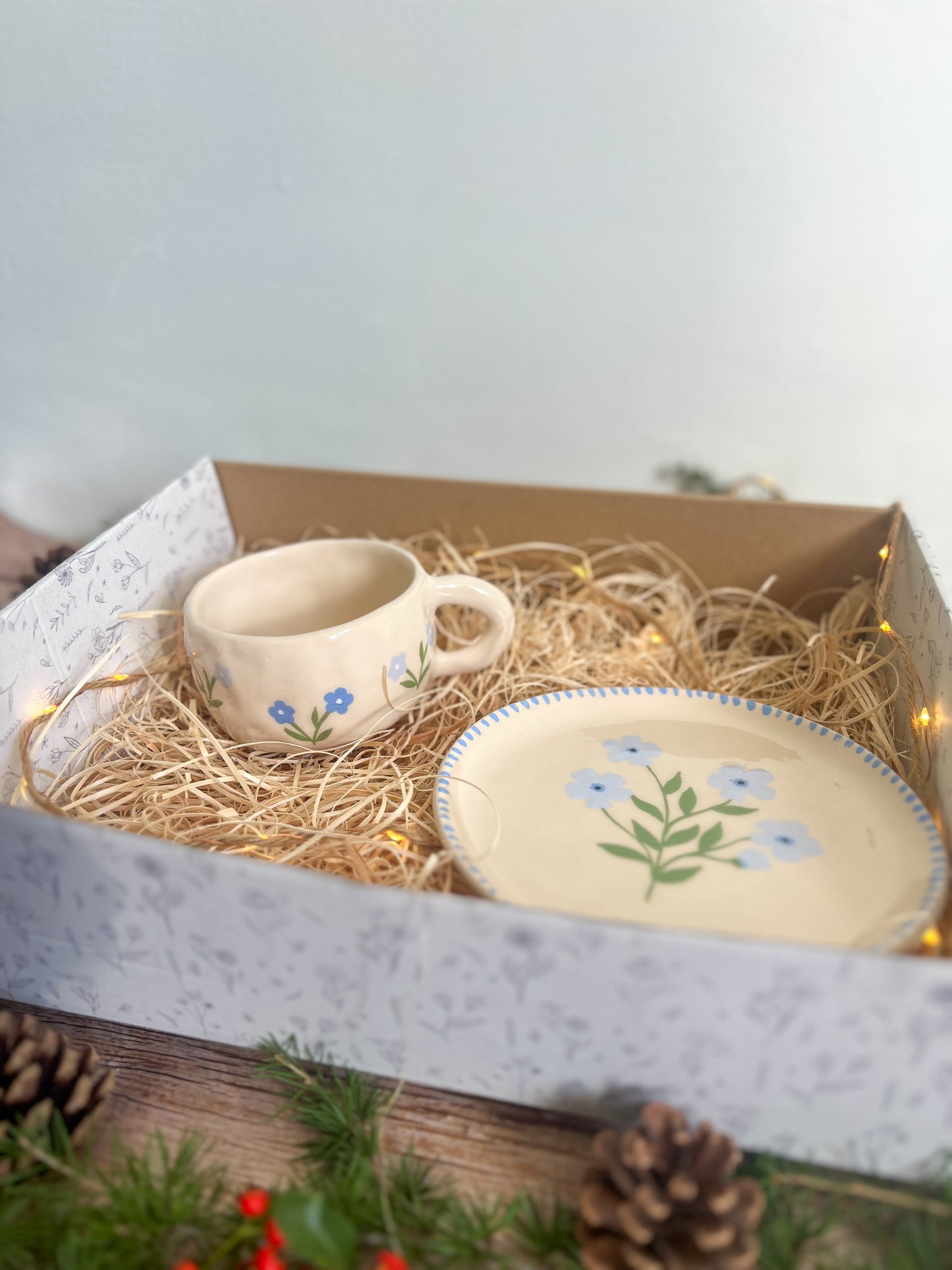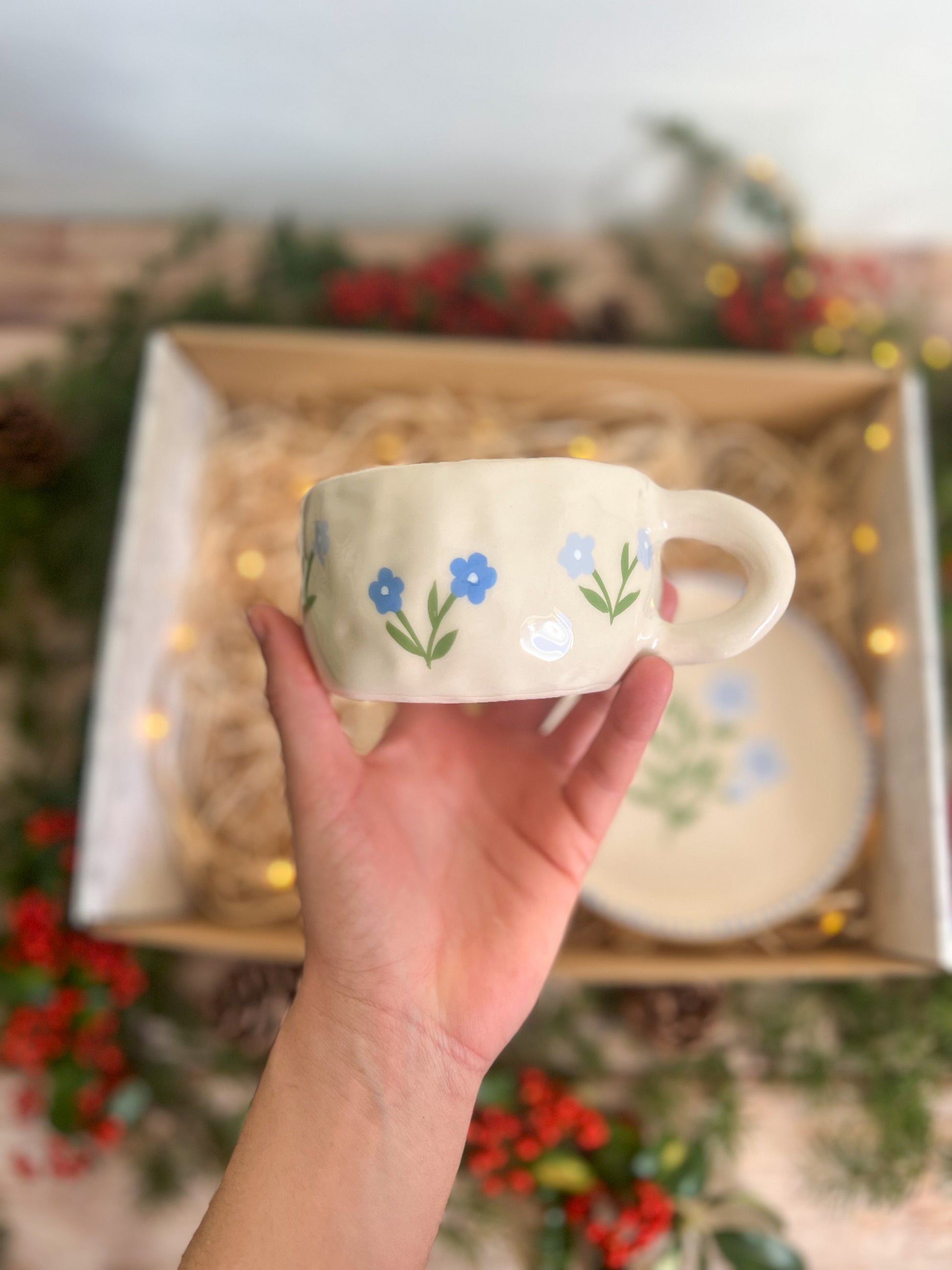 Coffret composé d’une tasse décorée de petites fleurs et de son assiette à dessert assortie 🌸