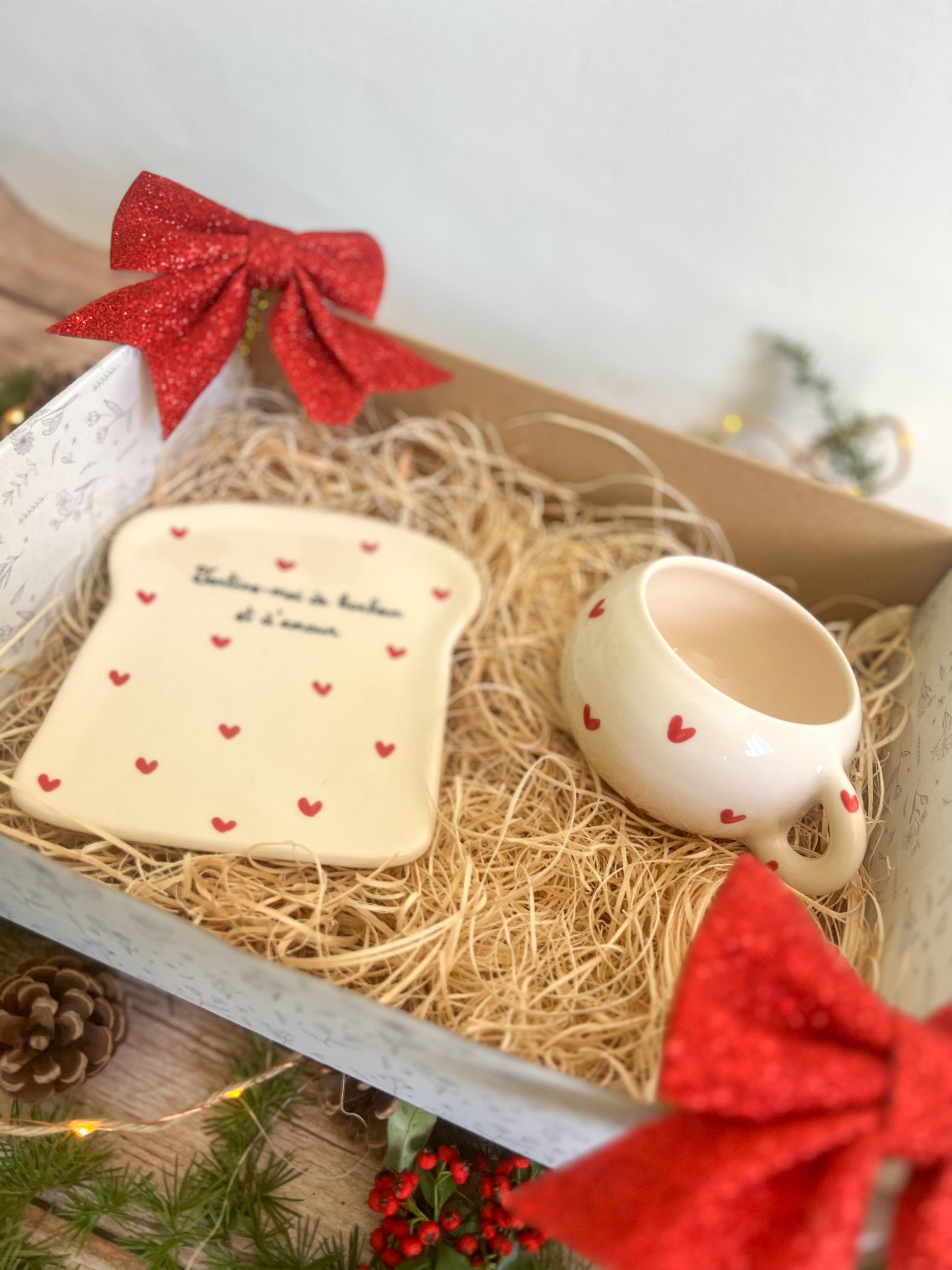 Un coffret tout doux pour Noël, composé d’une assiette à tartine avec l’inscription “tartine-moi de bonheur et d’amour” et de la tasse assortie, d'une capacité de 300ml, décorées de petits cœurs rouges tout doux, peint à la main ✨