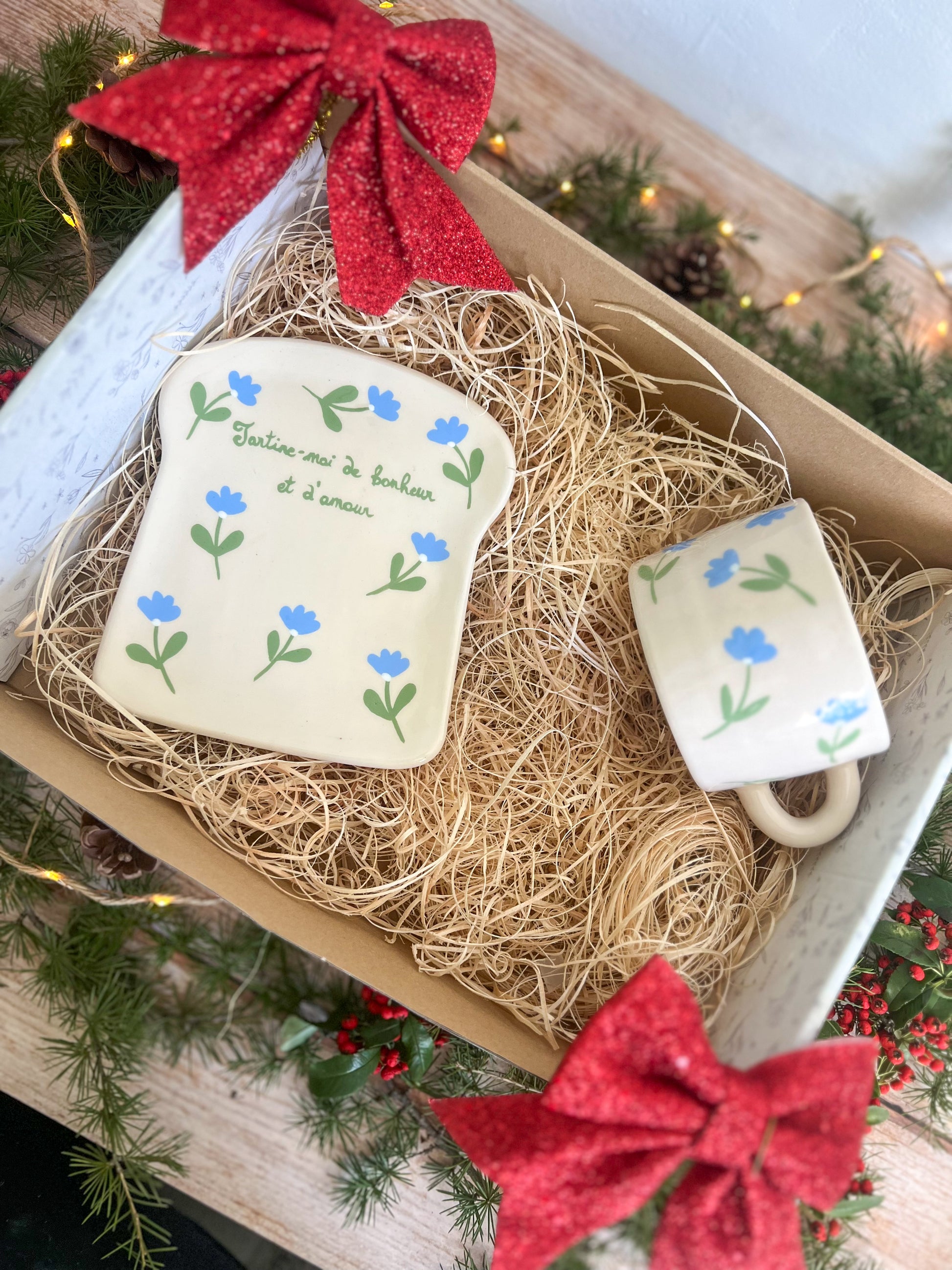 Un coffret tout doux pour Noël, composé d’une assiette à tartine avec l’inscription “tartine-moi de bonheur et d’amour” et de la tasse assortie, d'une capacité de 400ml, décorées de motif fleuris peint à la main ✨