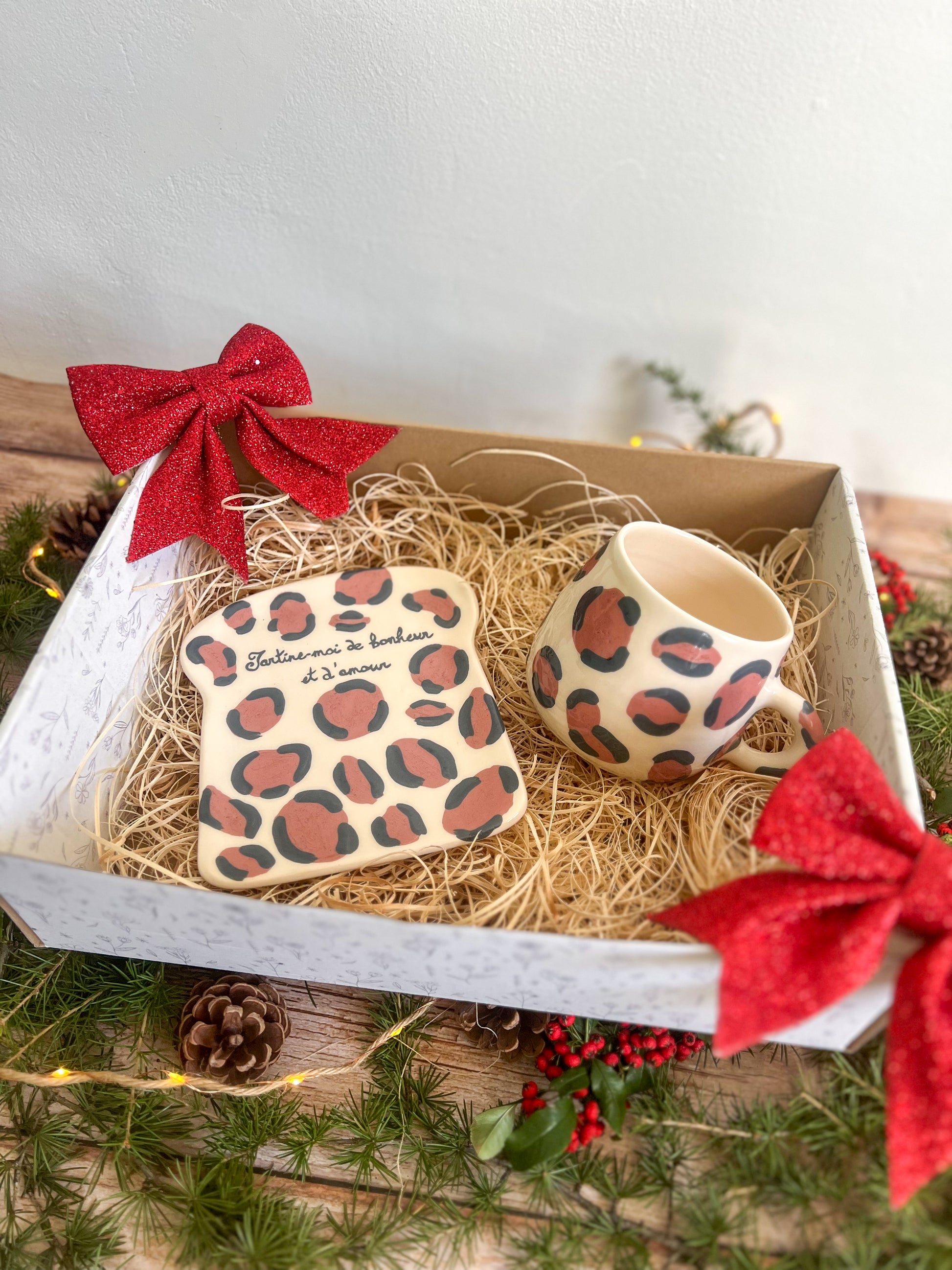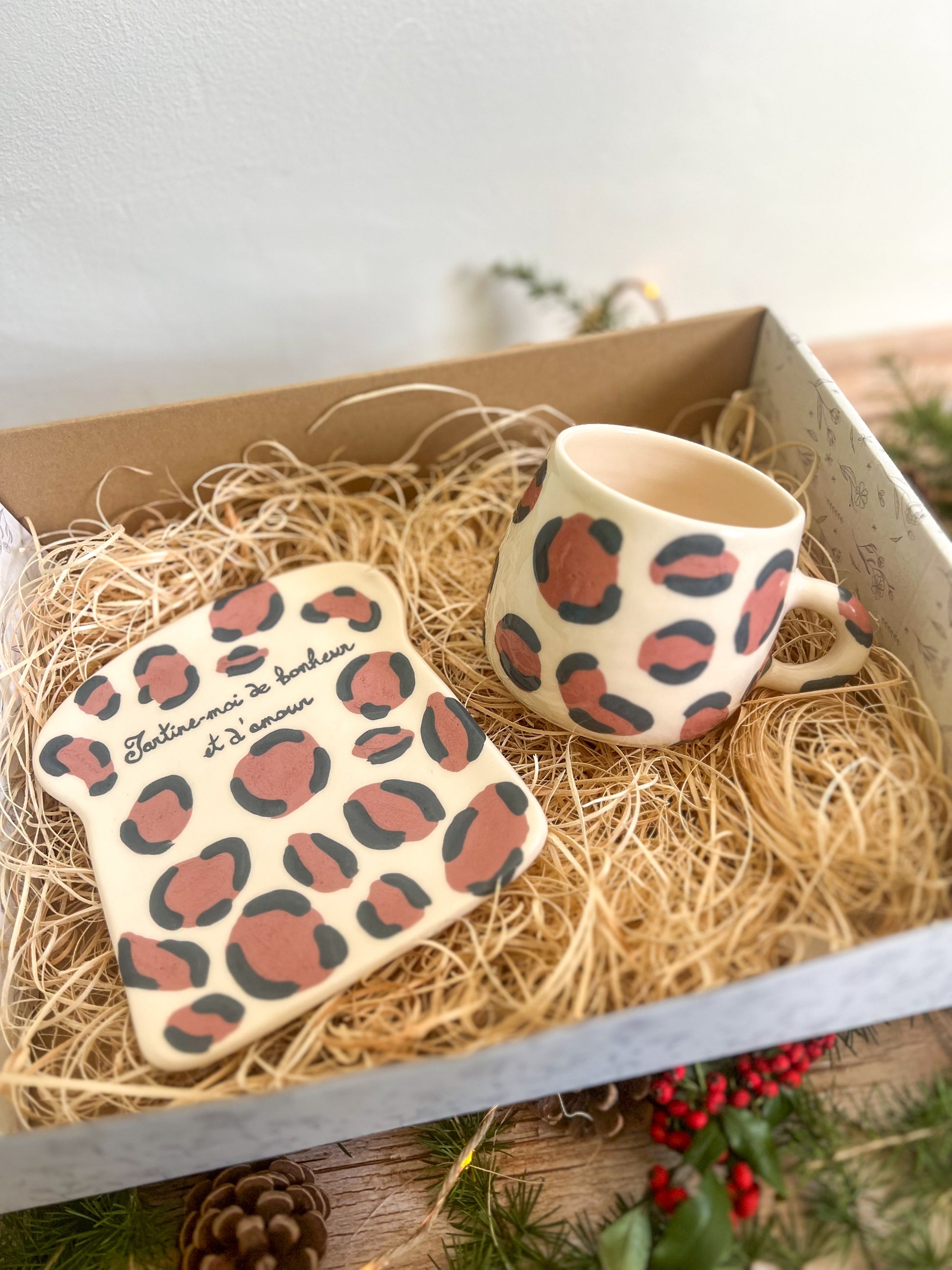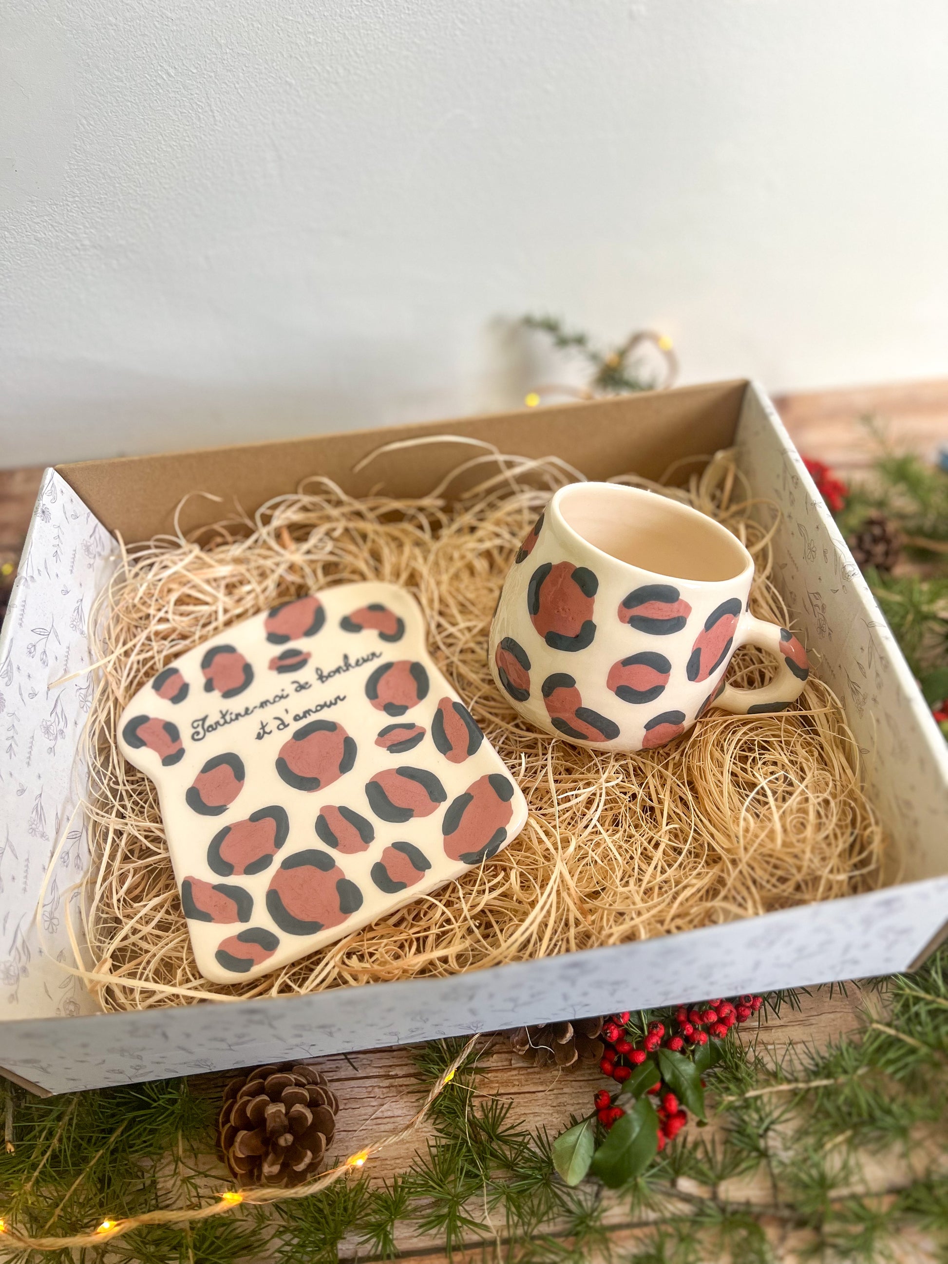 Un coffret tout doux pour Noël, composé d’une assiette à tartine avec l’inscription “tartine-moi de bonheur et d’amour” et de la tasse assortie, d'une capacité de 400ml, décorées de motif léopard peint à la main 🐆✨
