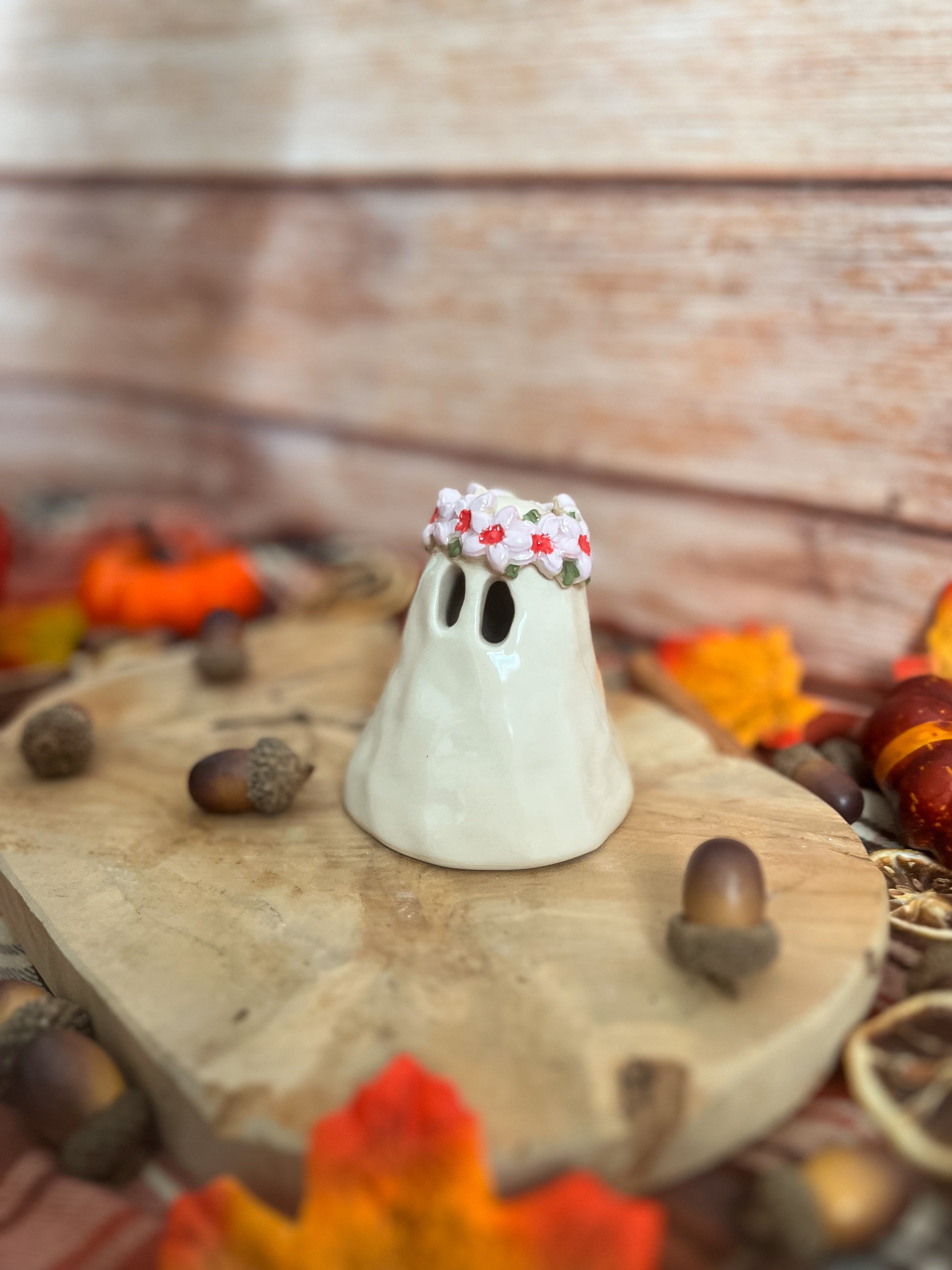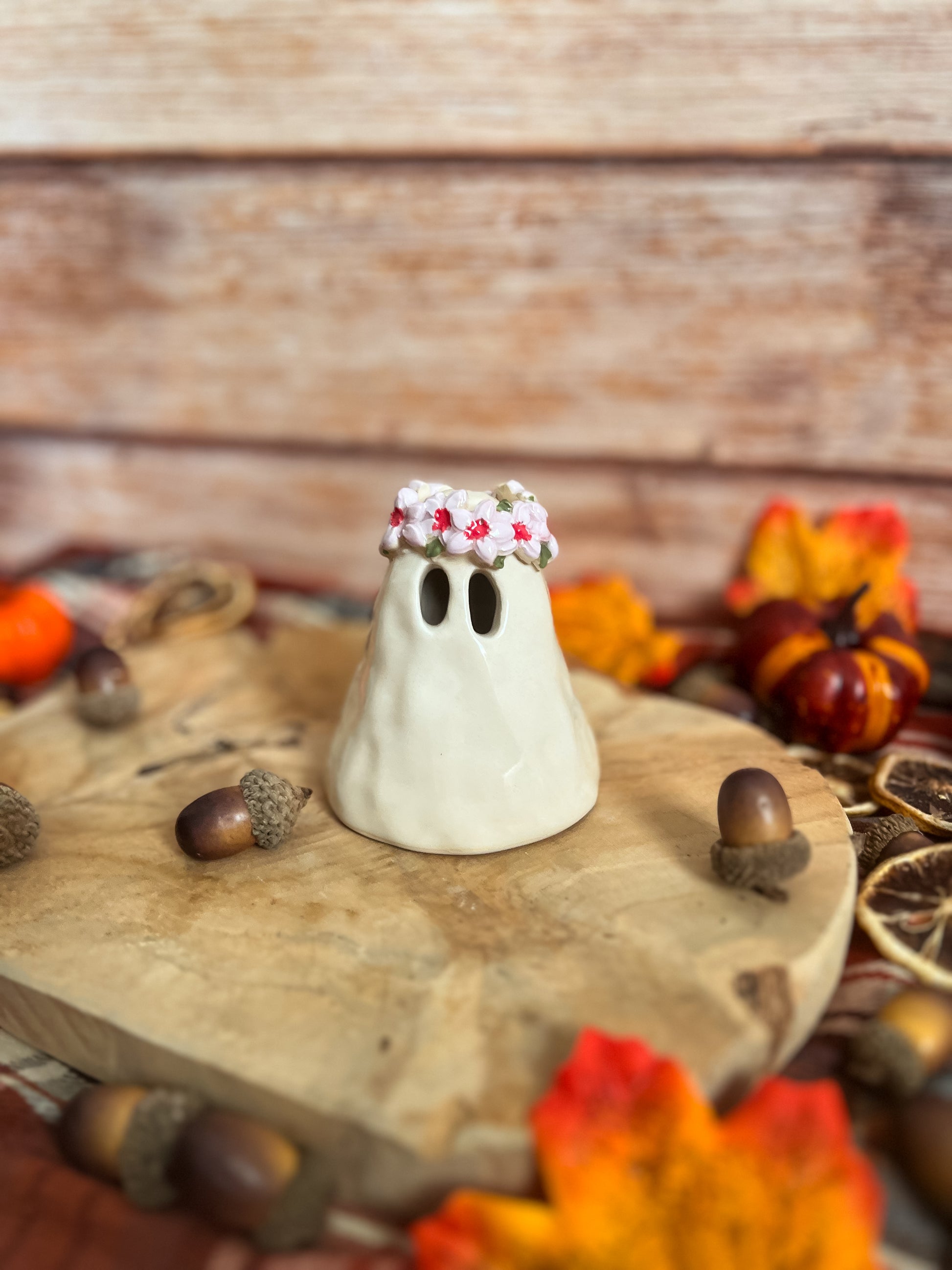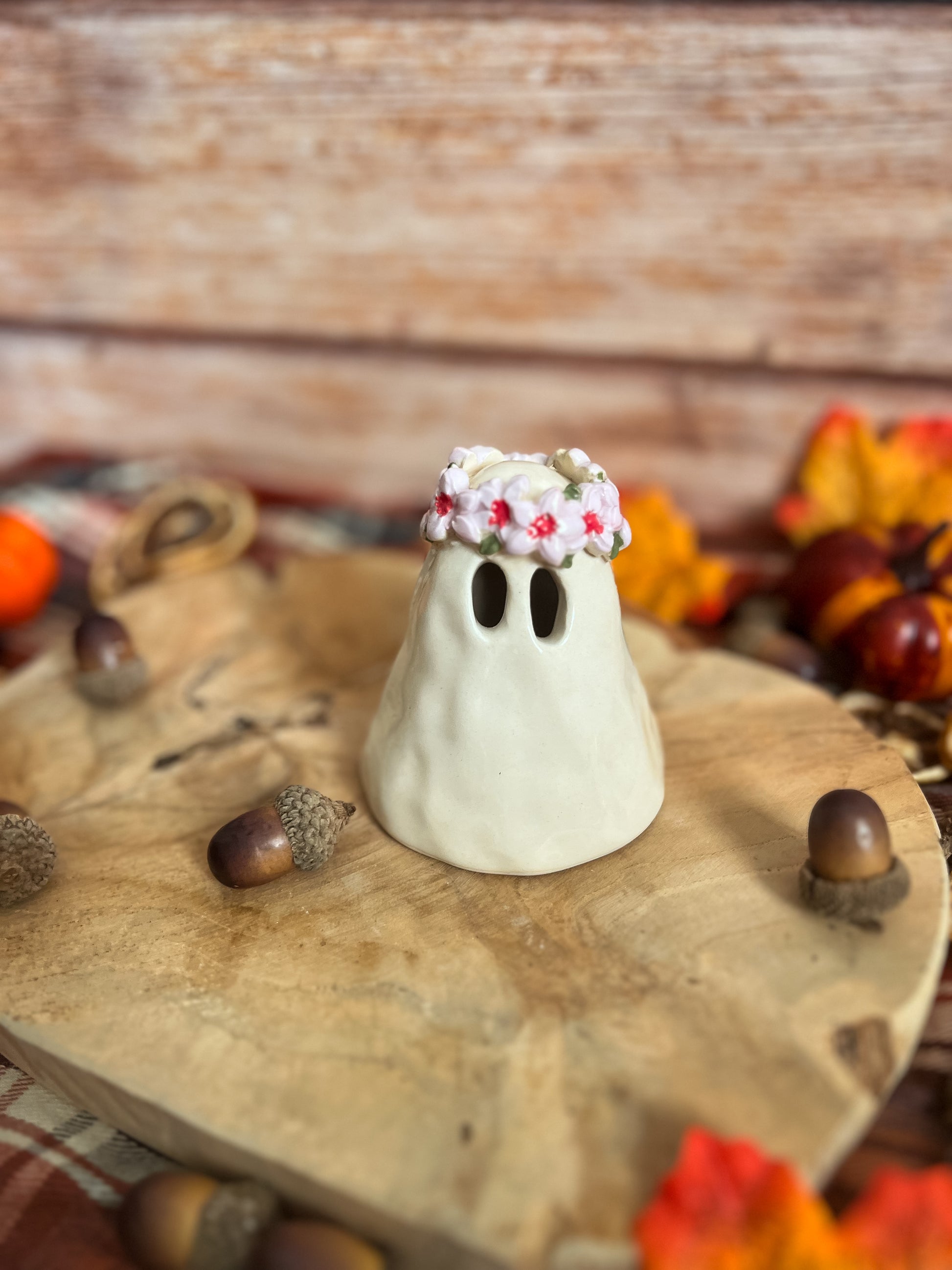 Photophore fantôme en céramique, décoré d’une couronne de fleurs. 🌸
