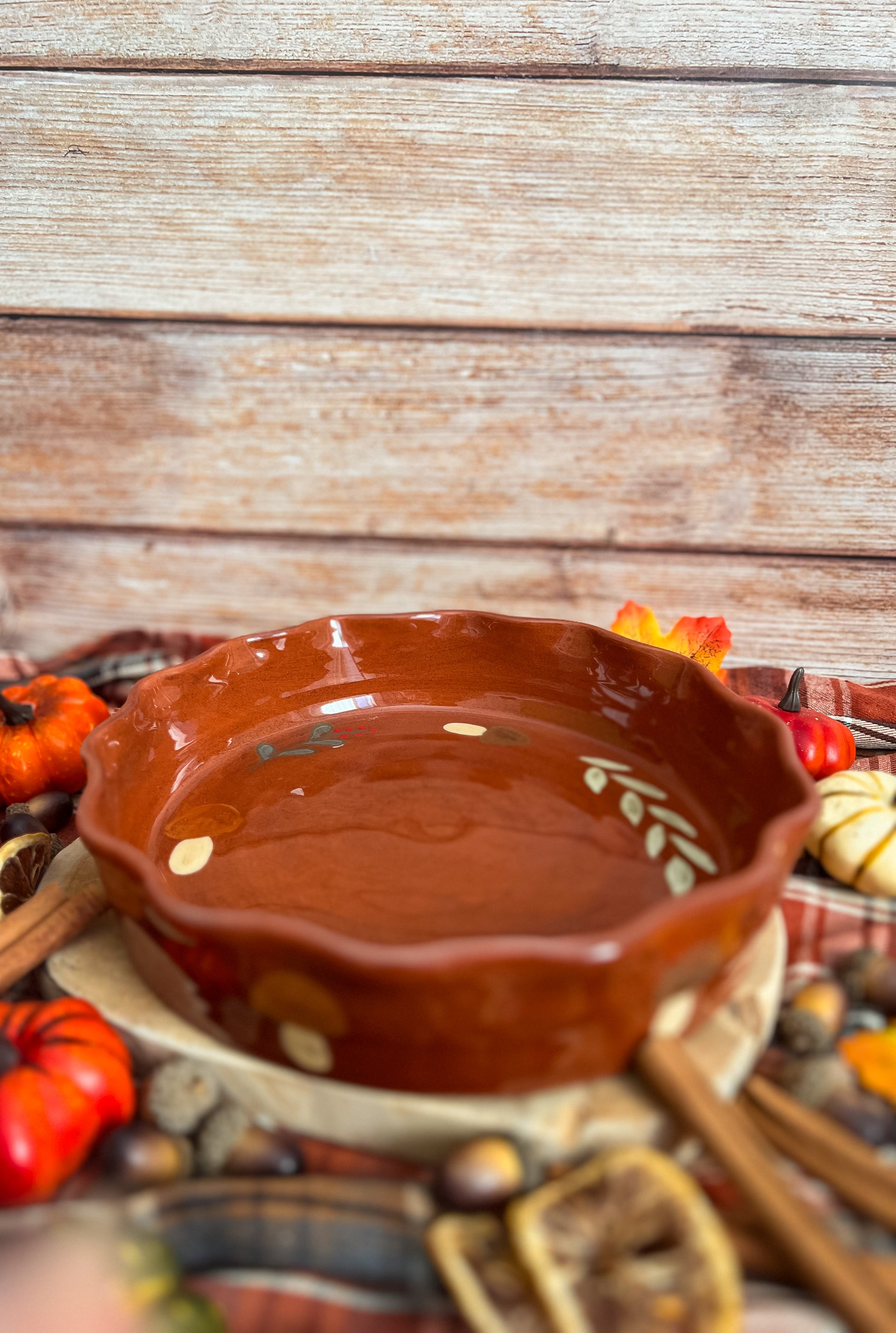 Un grand plat artisanal en terre terracotta, idéal pour les gratins, les plats de saison ou même comme pièce de présentation à table.