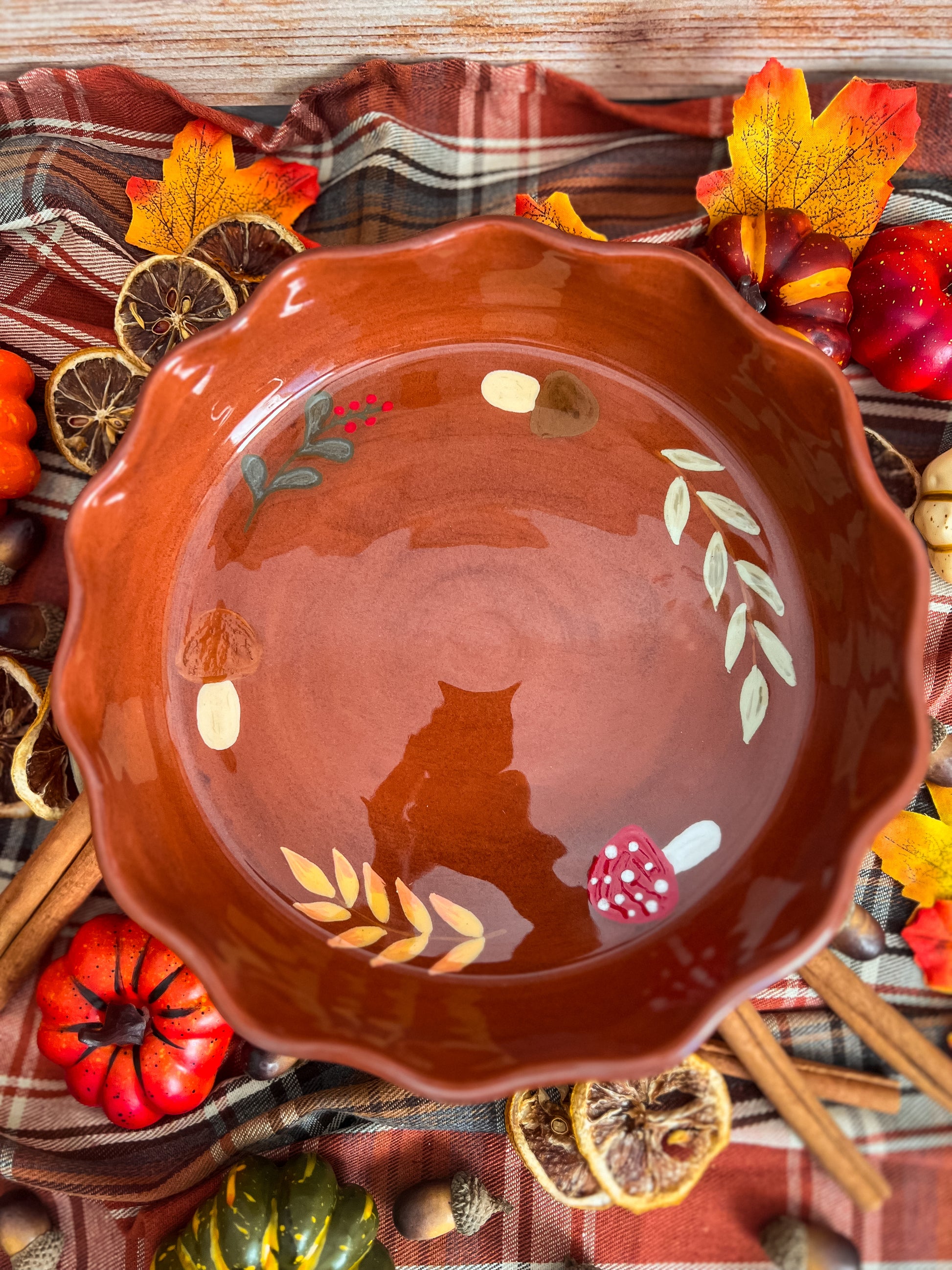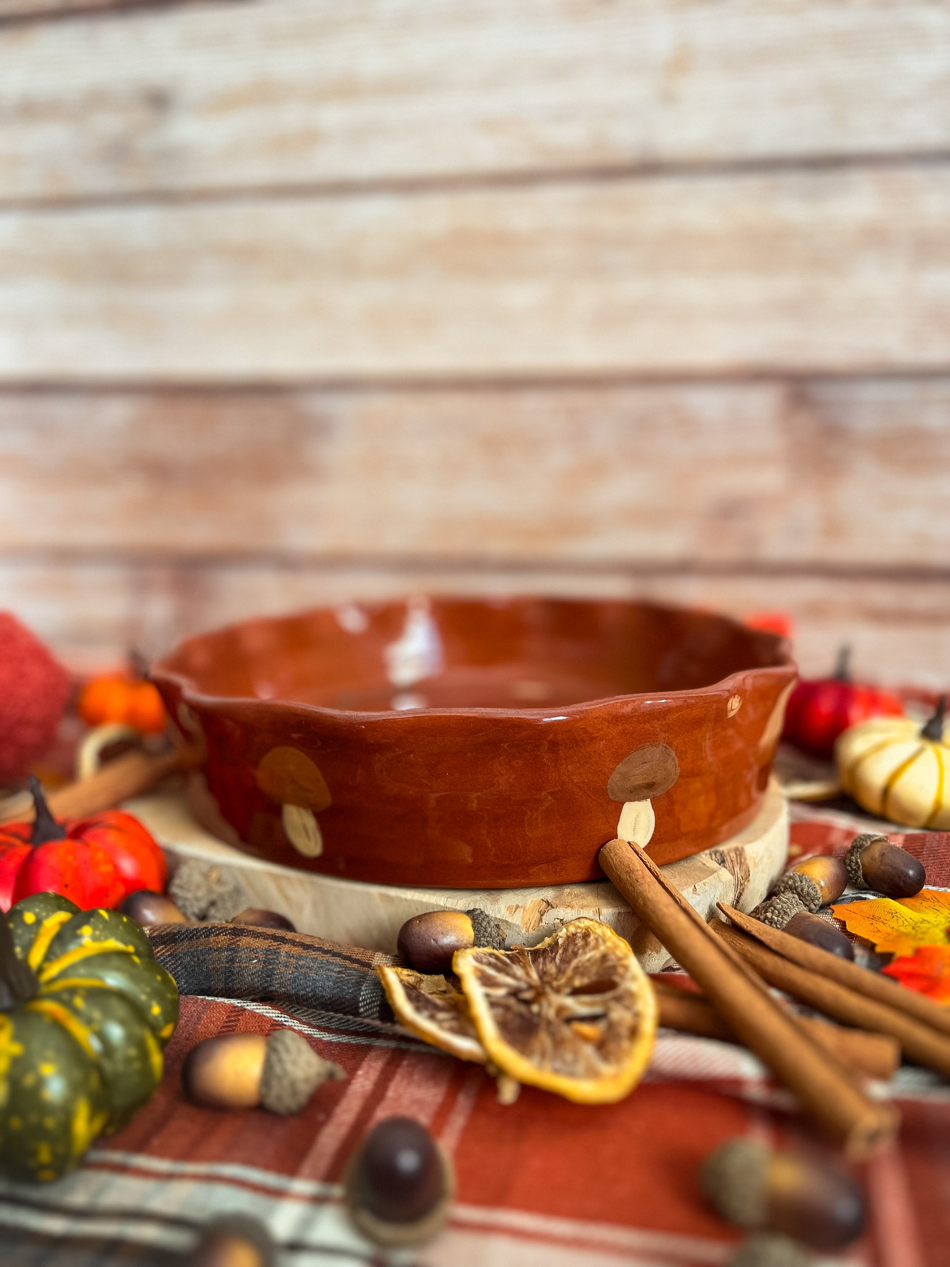 Ses bords ondulés lui apportent une touche élégante et généreuse, tandis que les champignons et feuilles d’automne peints à la main décorent la surface pour rappeler la douceur de la saison 🍂🍄.
