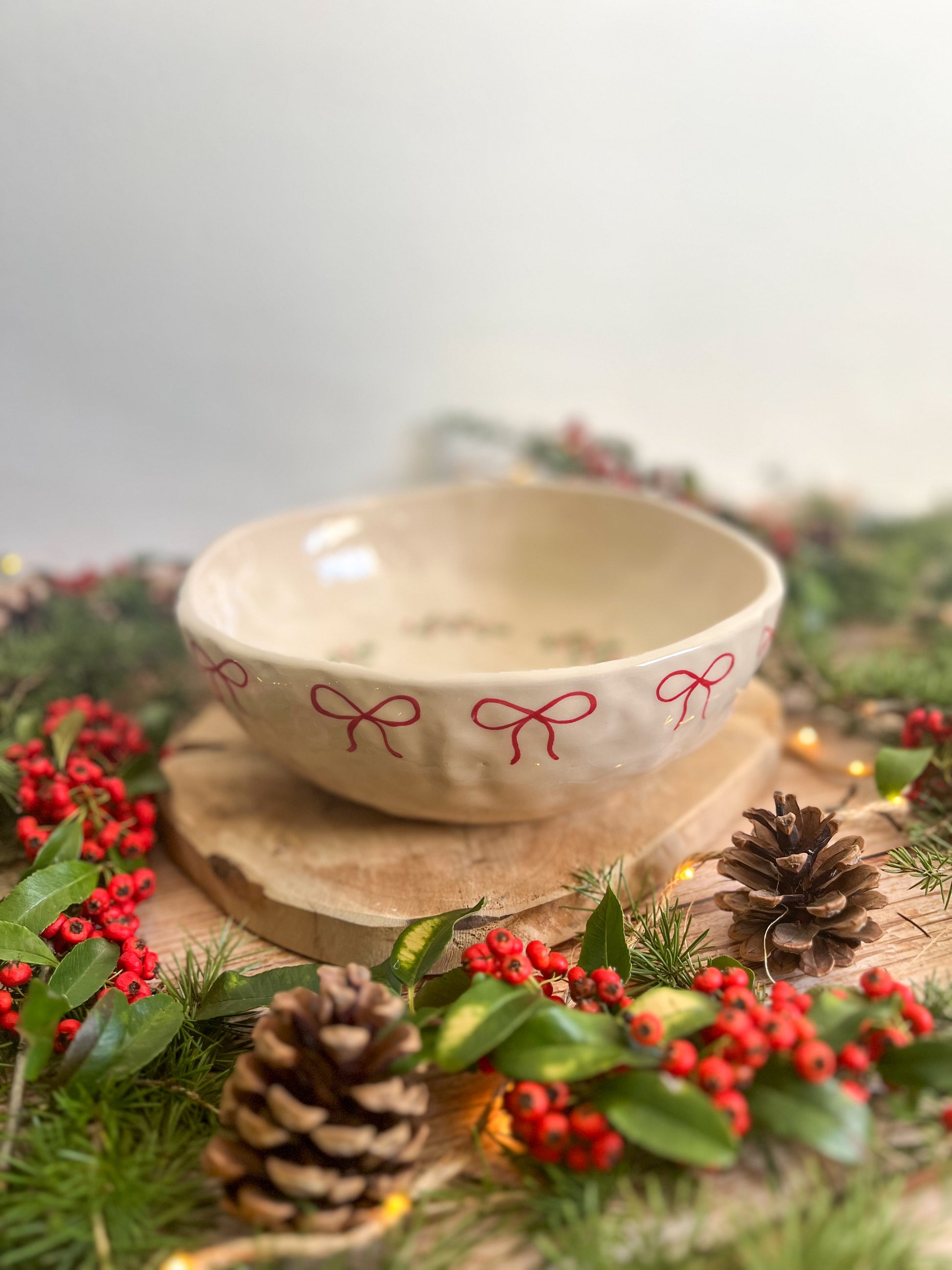 Grand saladier décoré de petits nœuds rouges et de baies d’hiver, peints à la main dans des tons doux et chaleureux 🎀