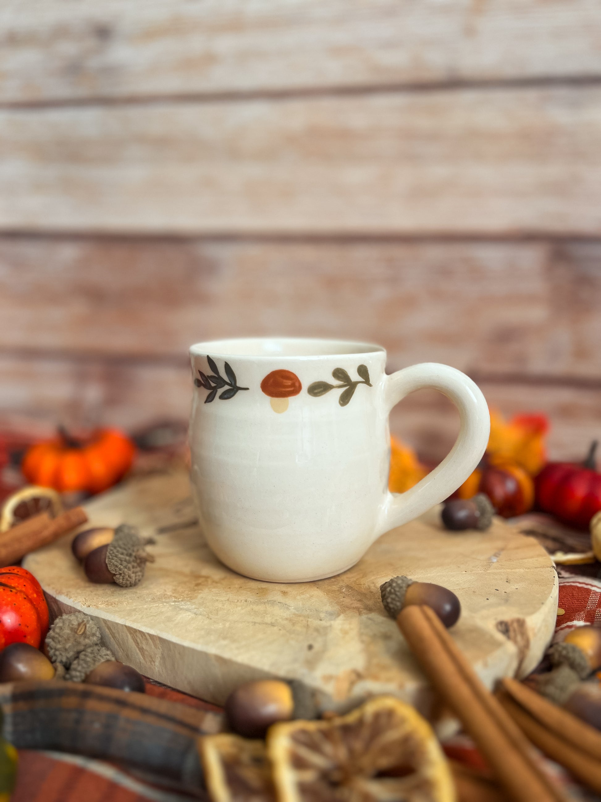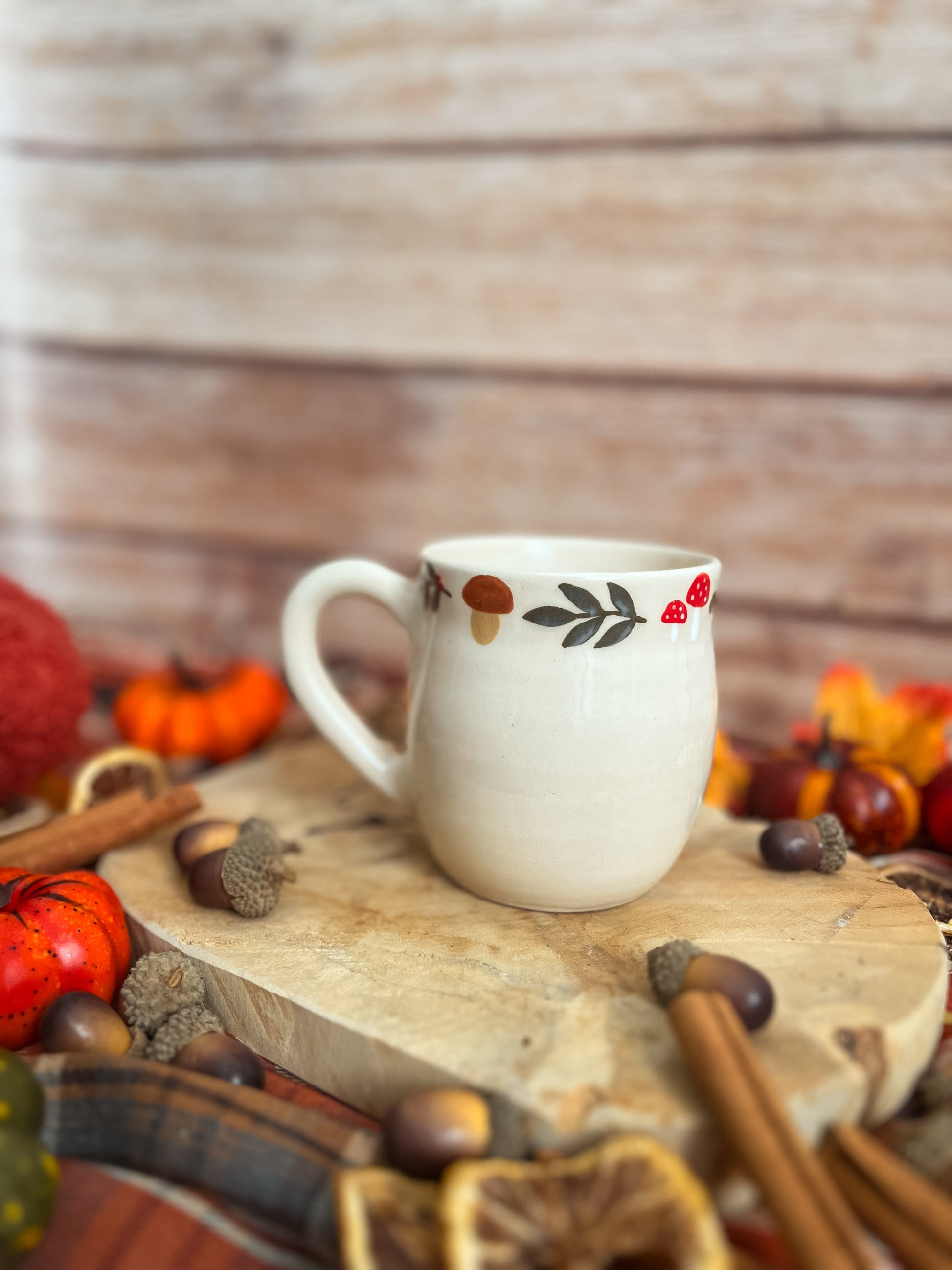 Une délicate couronne d’automne, ornée de petits champignons et de feuilles peintes à la main, habille le haut de la tasse. 🍂🍄