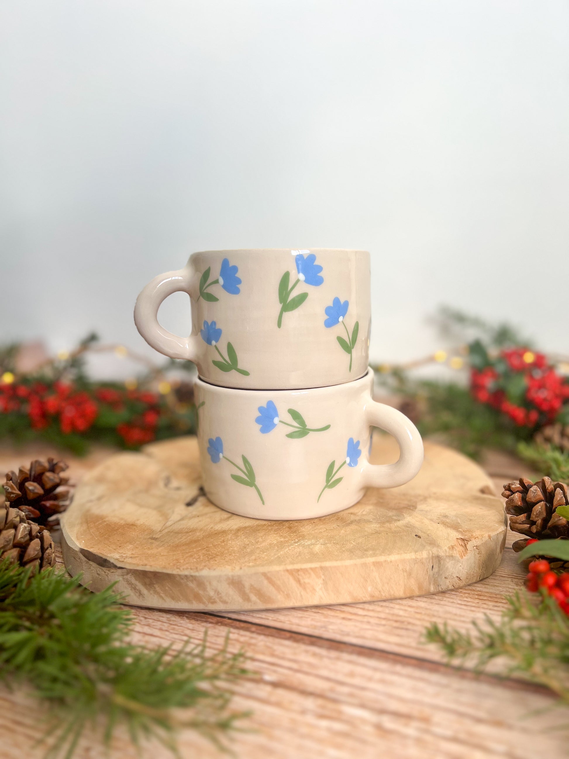 Mug décoré de fleurs bleues peintes à la main, dans une ambiance poétique et tout en douceur 🌸
