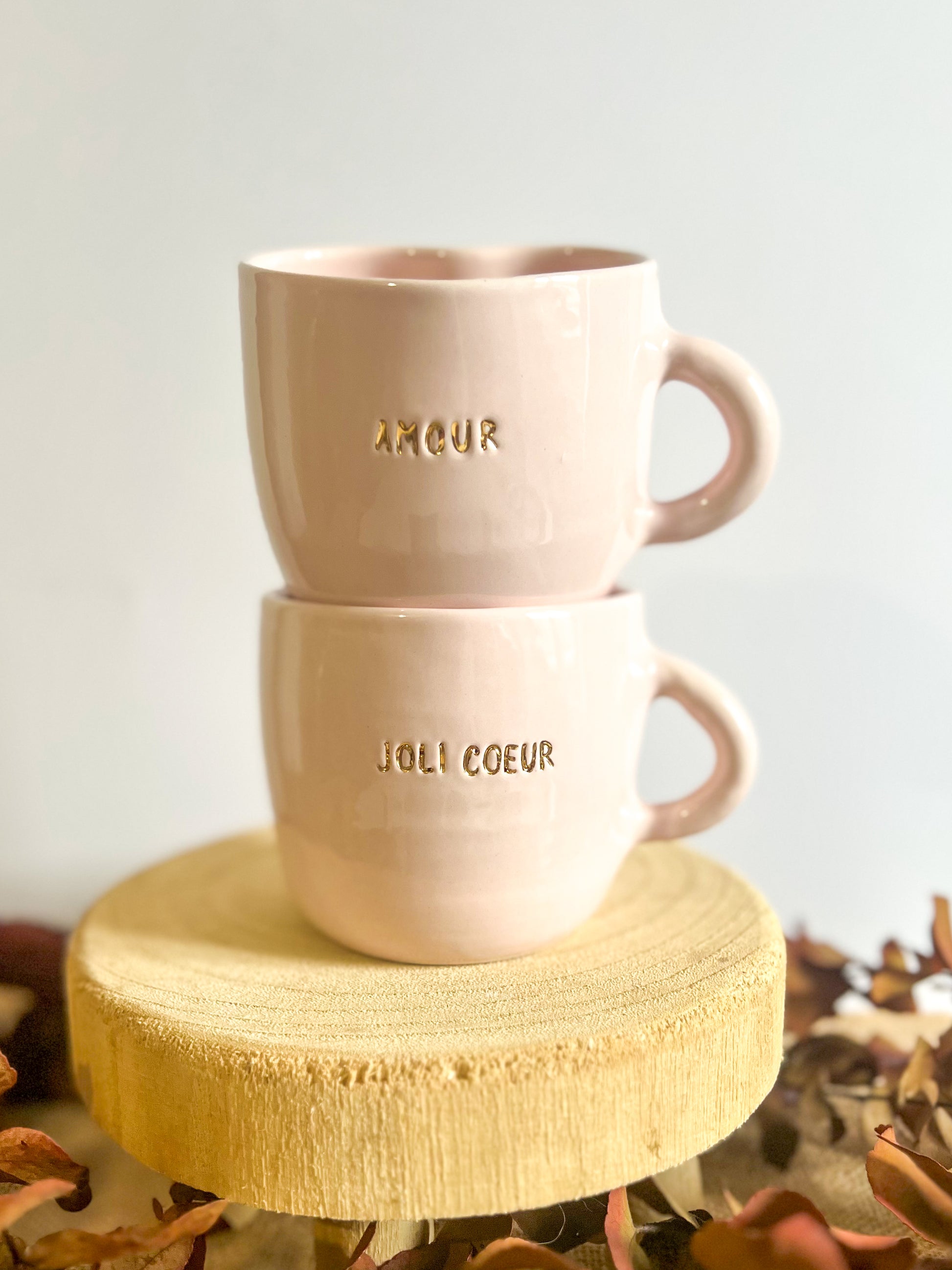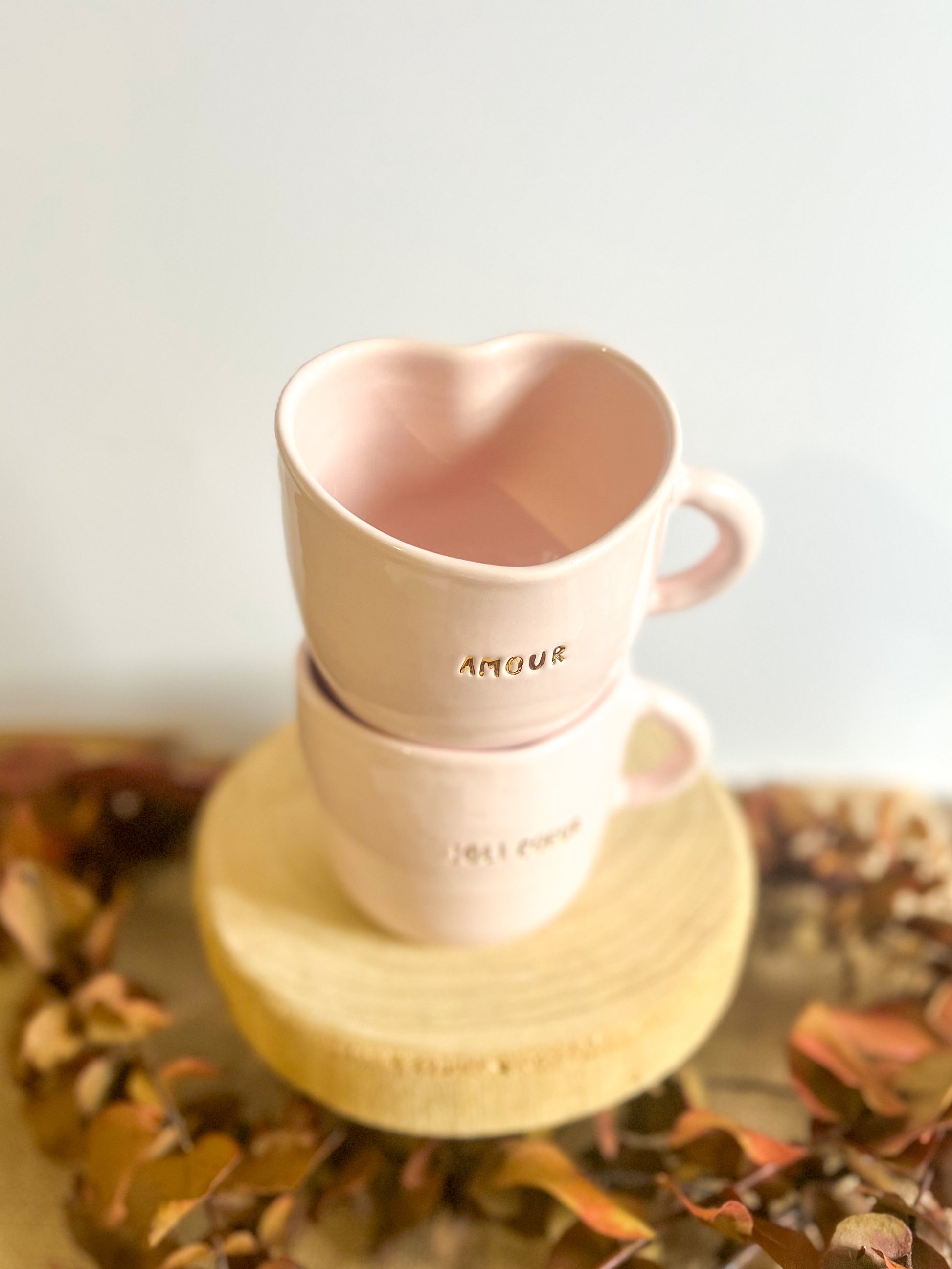 Ce mug en faïence, façonné à la main et entièrement émaillé en rose, est orné de petits mots doux « Joli Cœur » ou « Amour » en or. 💕