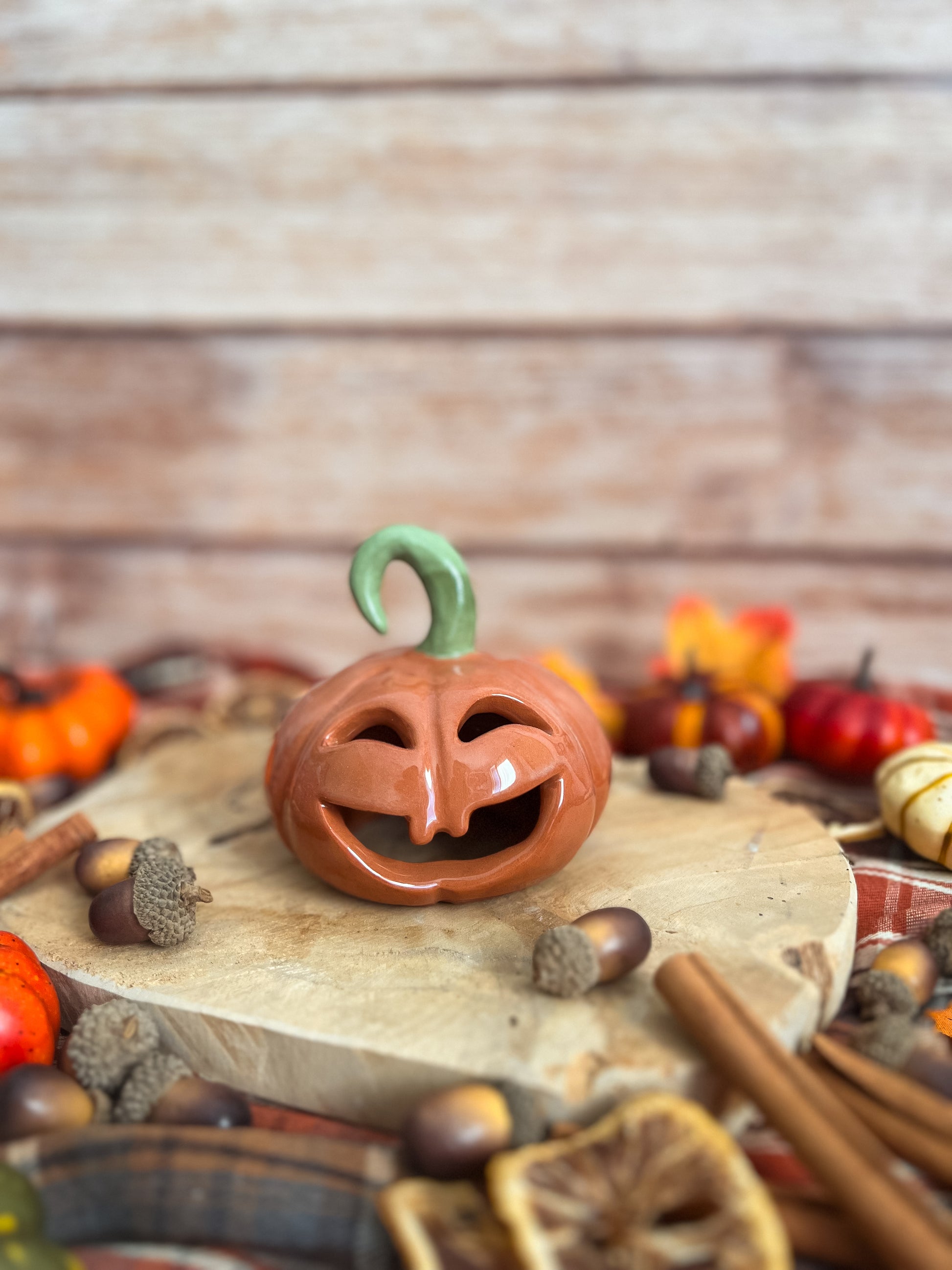 Sa petite tige est peinte en vert, et la lumière d’une bougie chauffe-plat s’échappe par ses yeux et sa bouche, créant une ambiance chaleureuse et automnale.