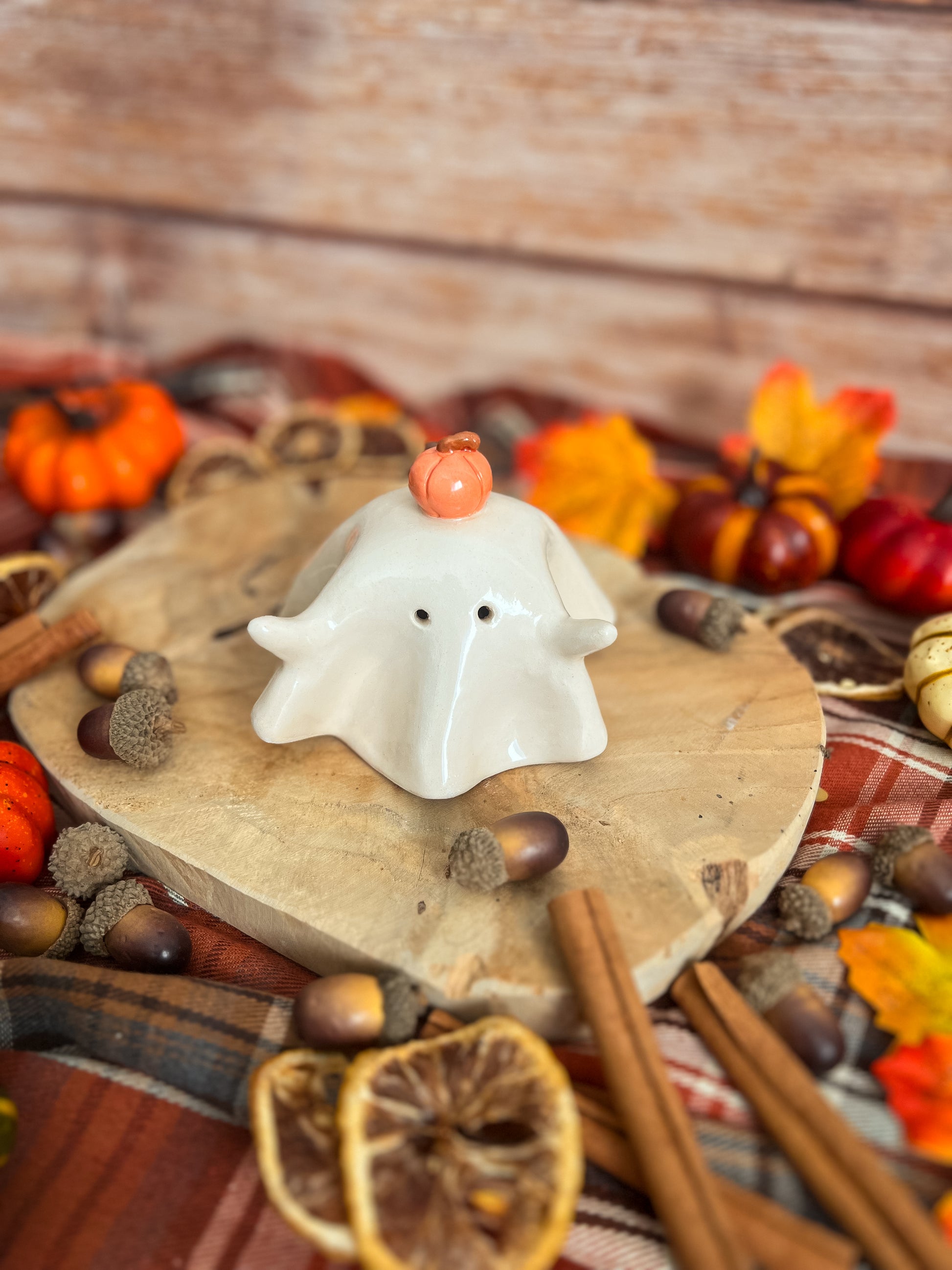 Photophore fantôme en céramique, décoré d’une citrouille sur sa tête. 🎃