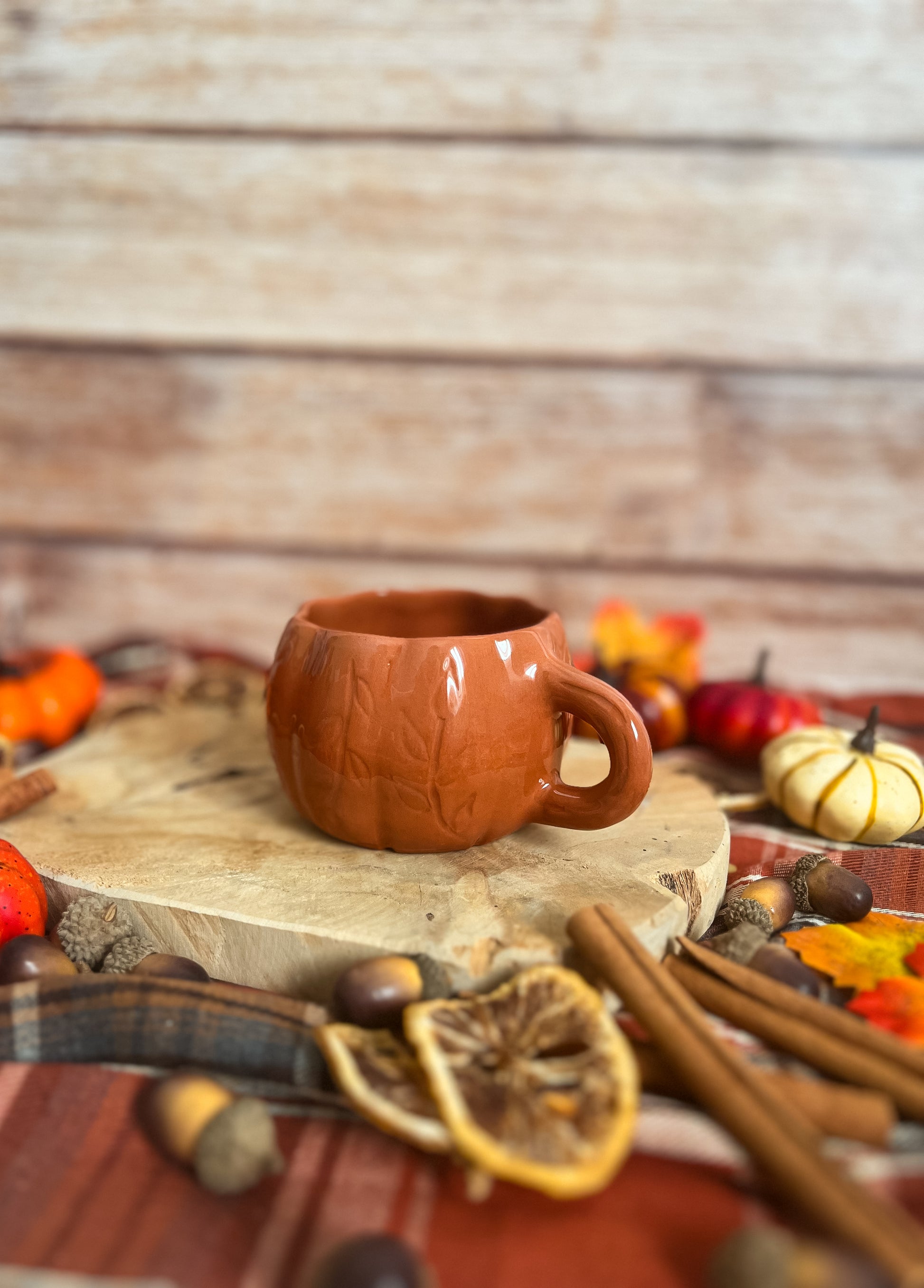 Une tasse façonnée en terre terracotta aux tons marron doux,a la forme d’une citrouille toute ronde et réconfortante 🎃.