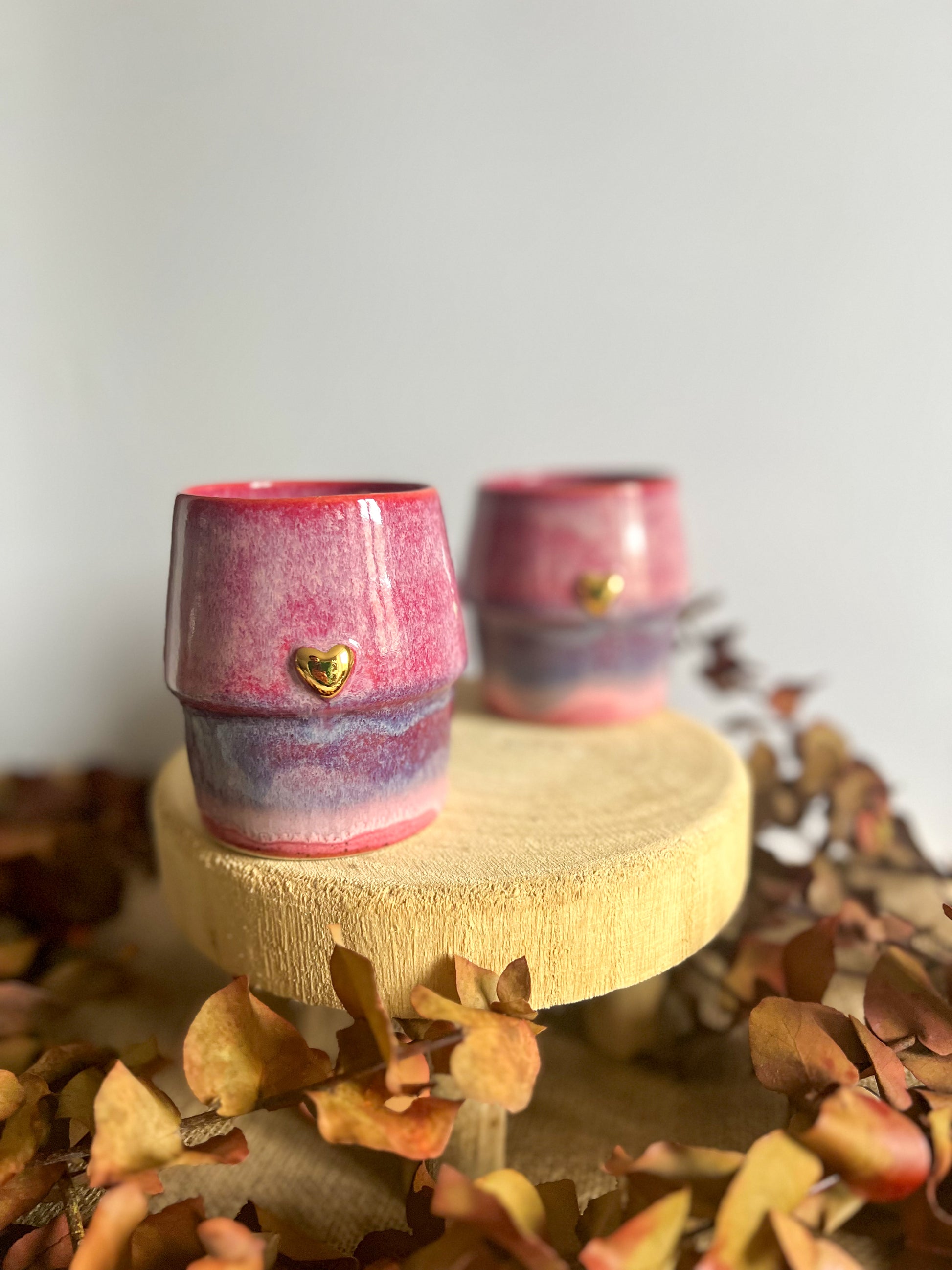 Tasse en grès, façonné à la main avec son petit cœur délicatement rehaussée d’or, qui se détache sur un superbe dégradé de couleurs mêlant rouges profonds, violets intenses et touches de rose.