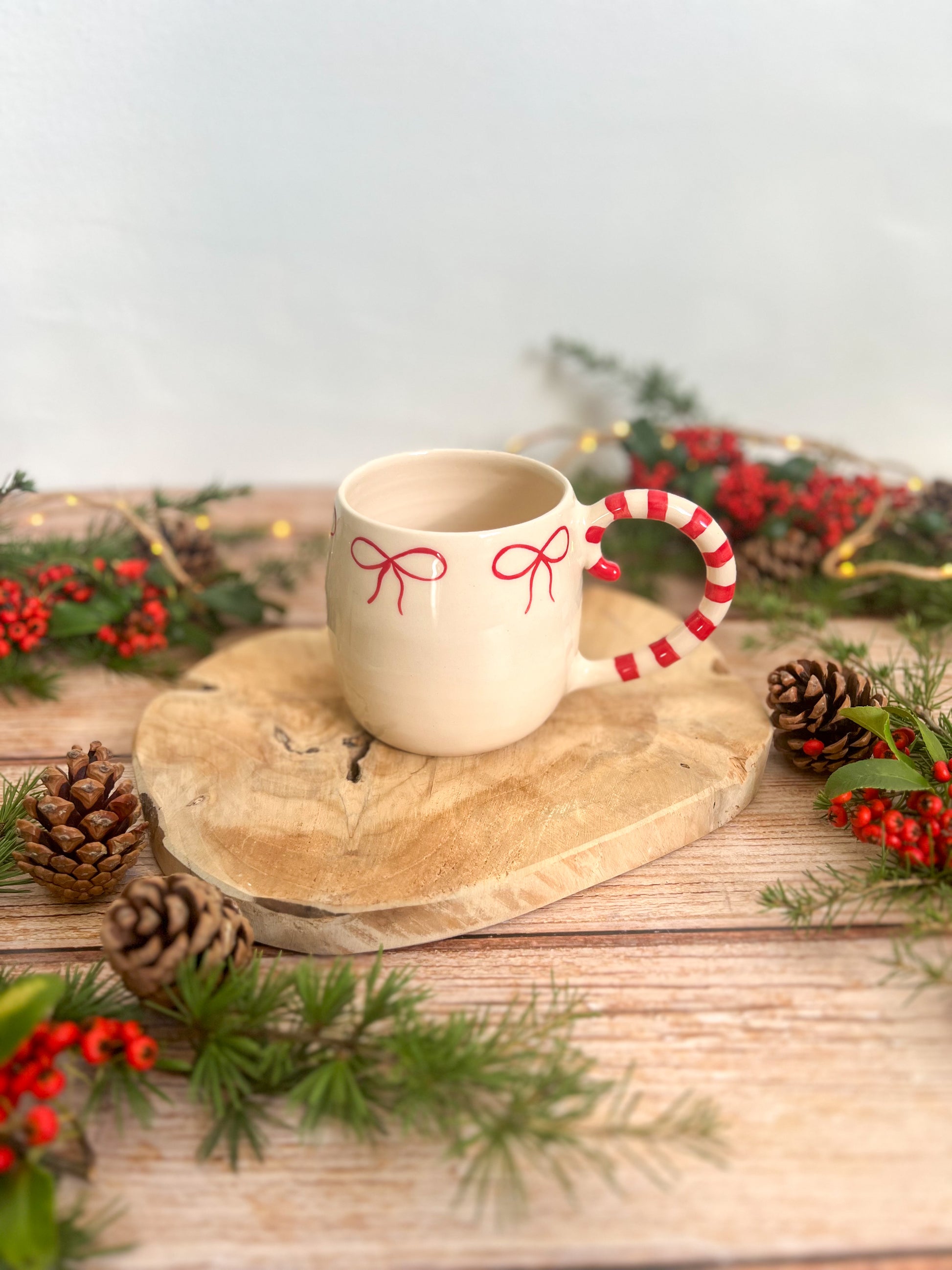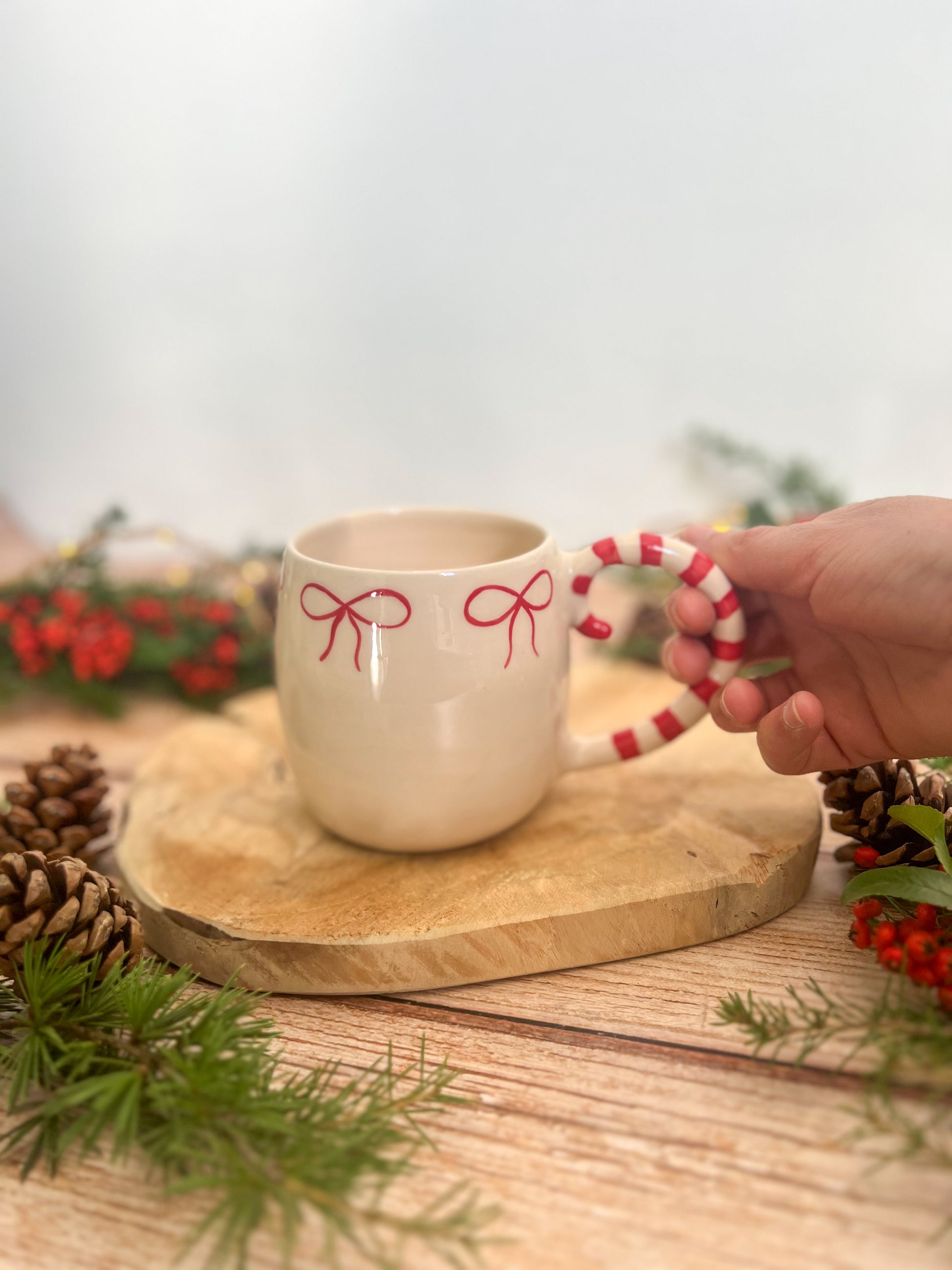 Une petite tasse de Noël pleine de charme, décorée à la main : des nœuds rouges peints tout autour… et une anse façon sucre d’orge rouge et blanc 🍭🎀