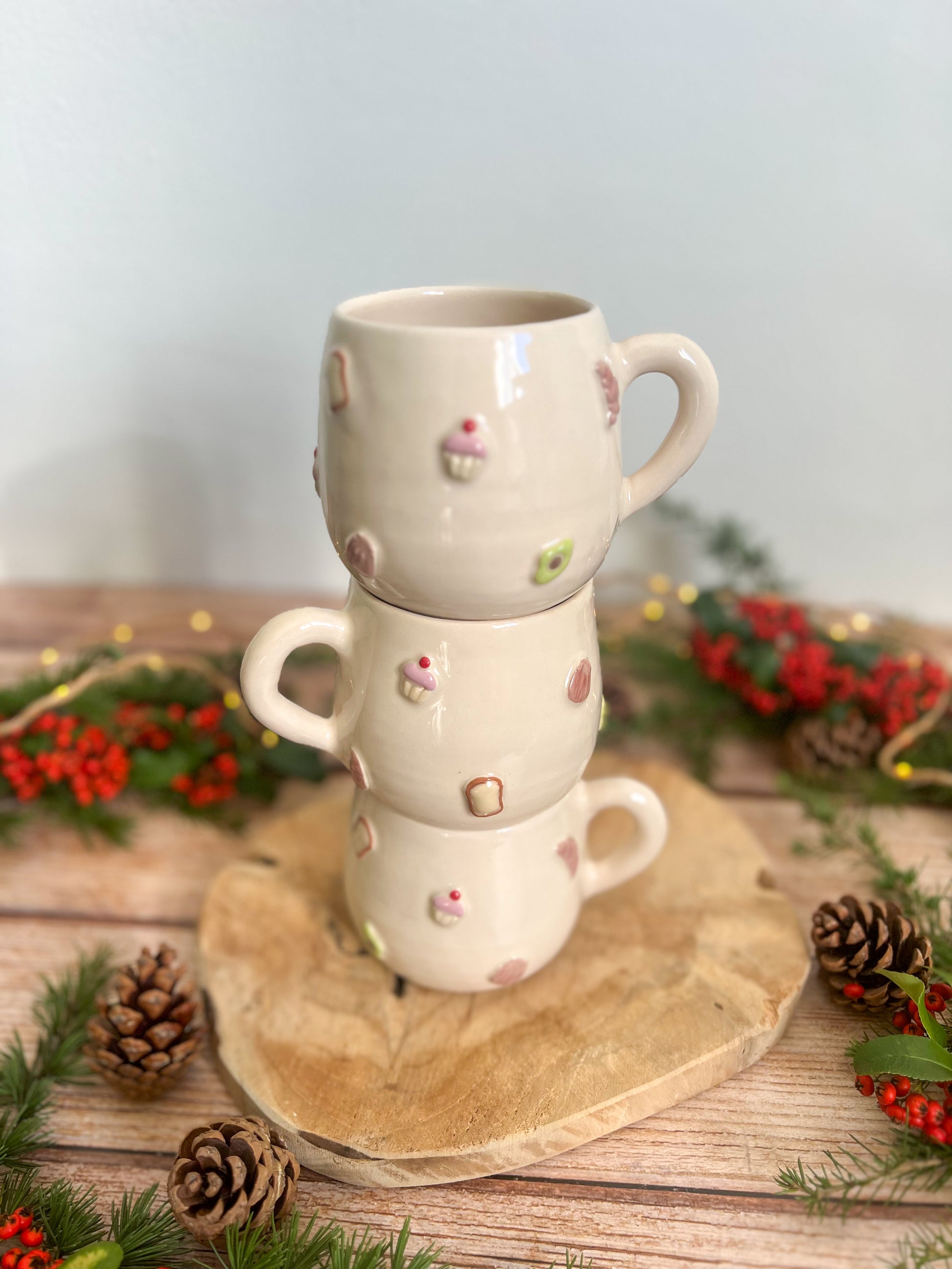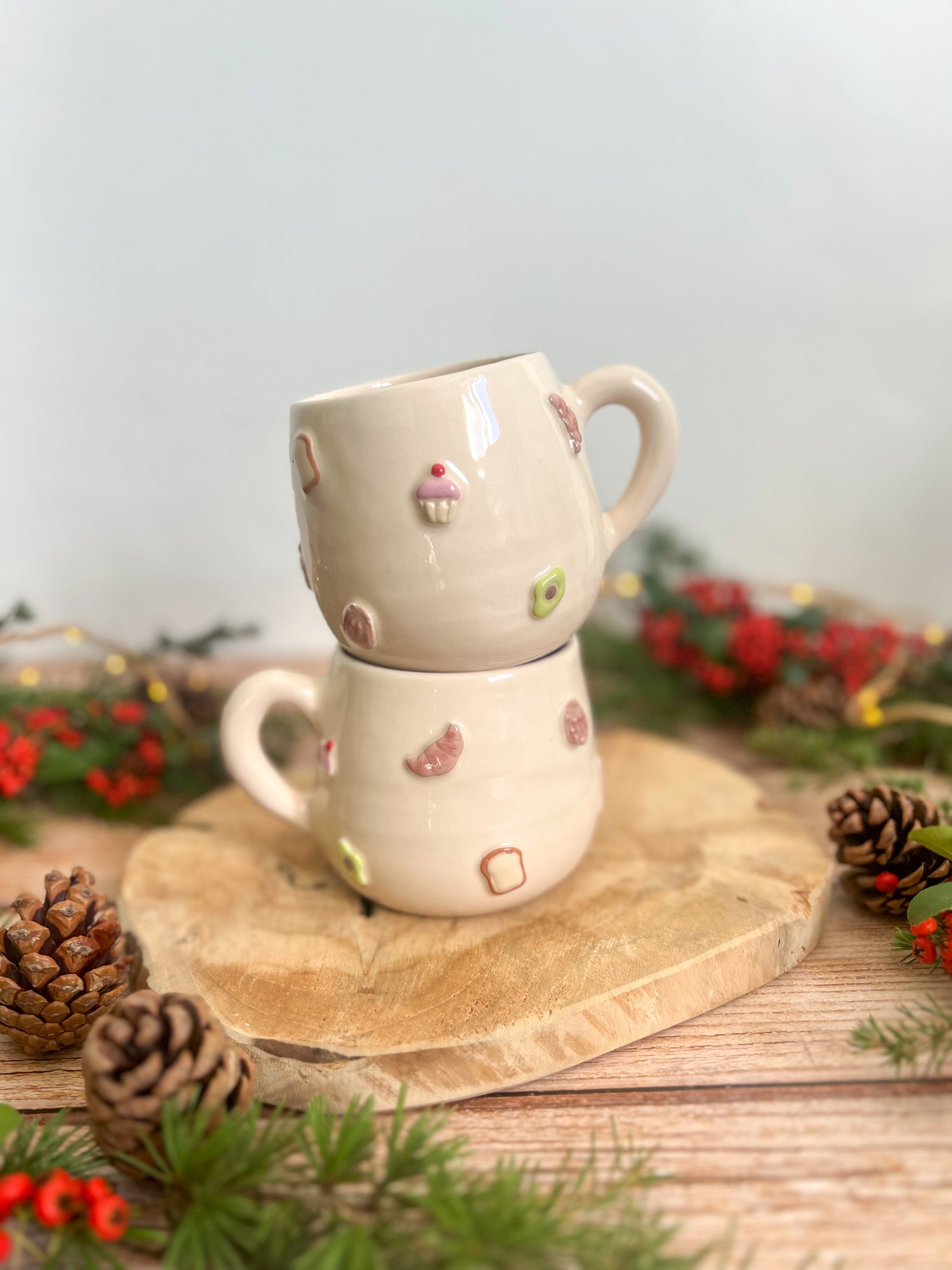 Tasse décorée en relief de petites gourmandises du matin : croissant, tartine, cupcake… et autres petits délices peints à la main 🥐🍞🍫