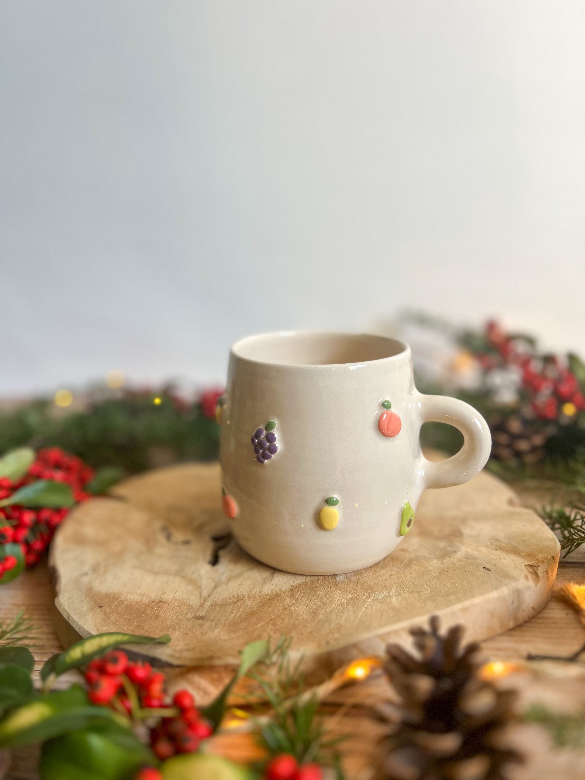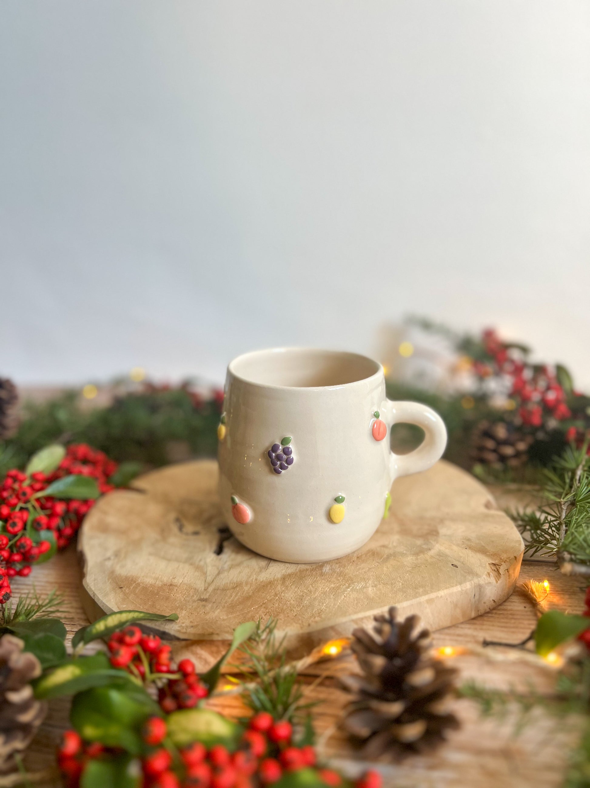 Tasse décorée de petits fruits en relief tout autour : raisin, avocat, citron, oranges 🍇🥑🍋🍊