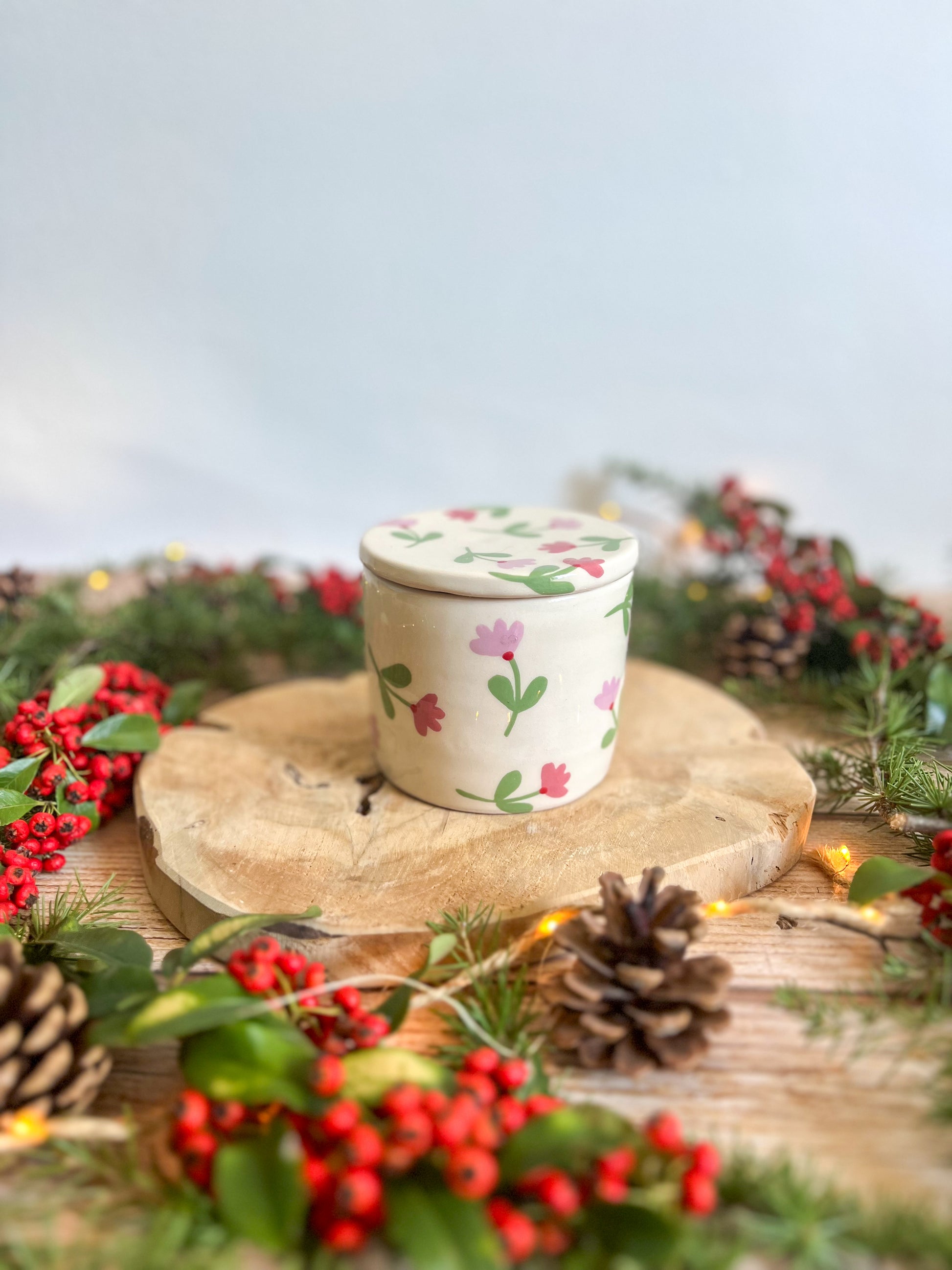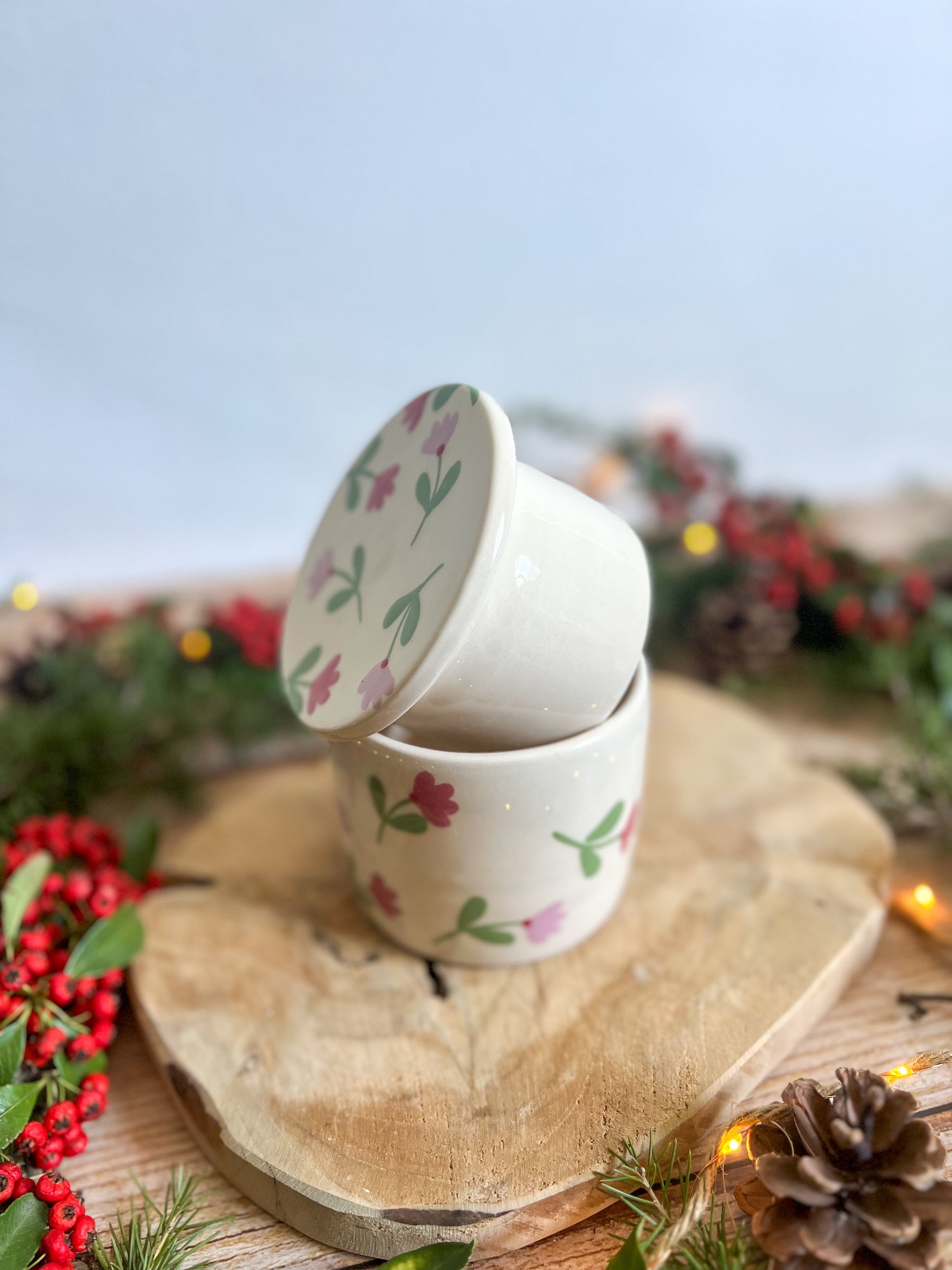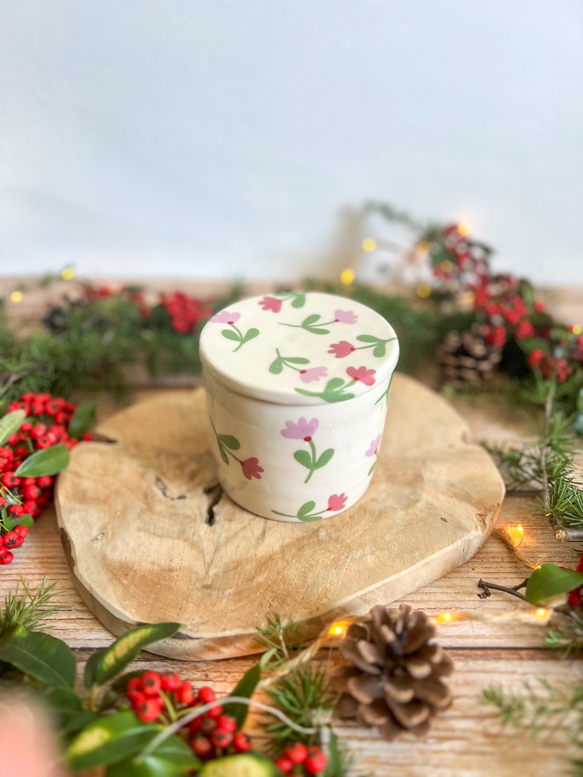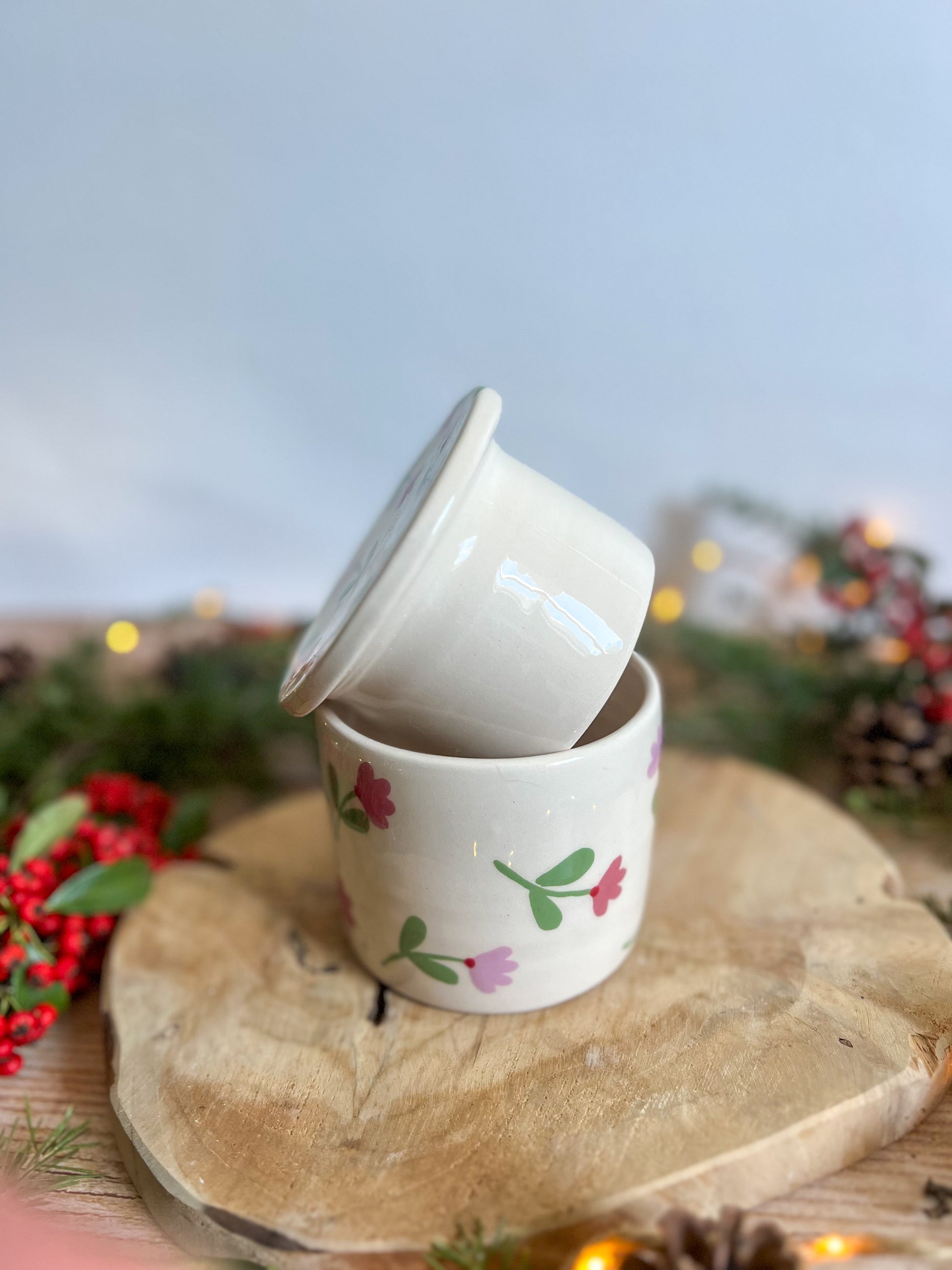 Beurrier à eau décoré de fleurs rouges et roses, qui en font une pièce douce et poétique 🌸