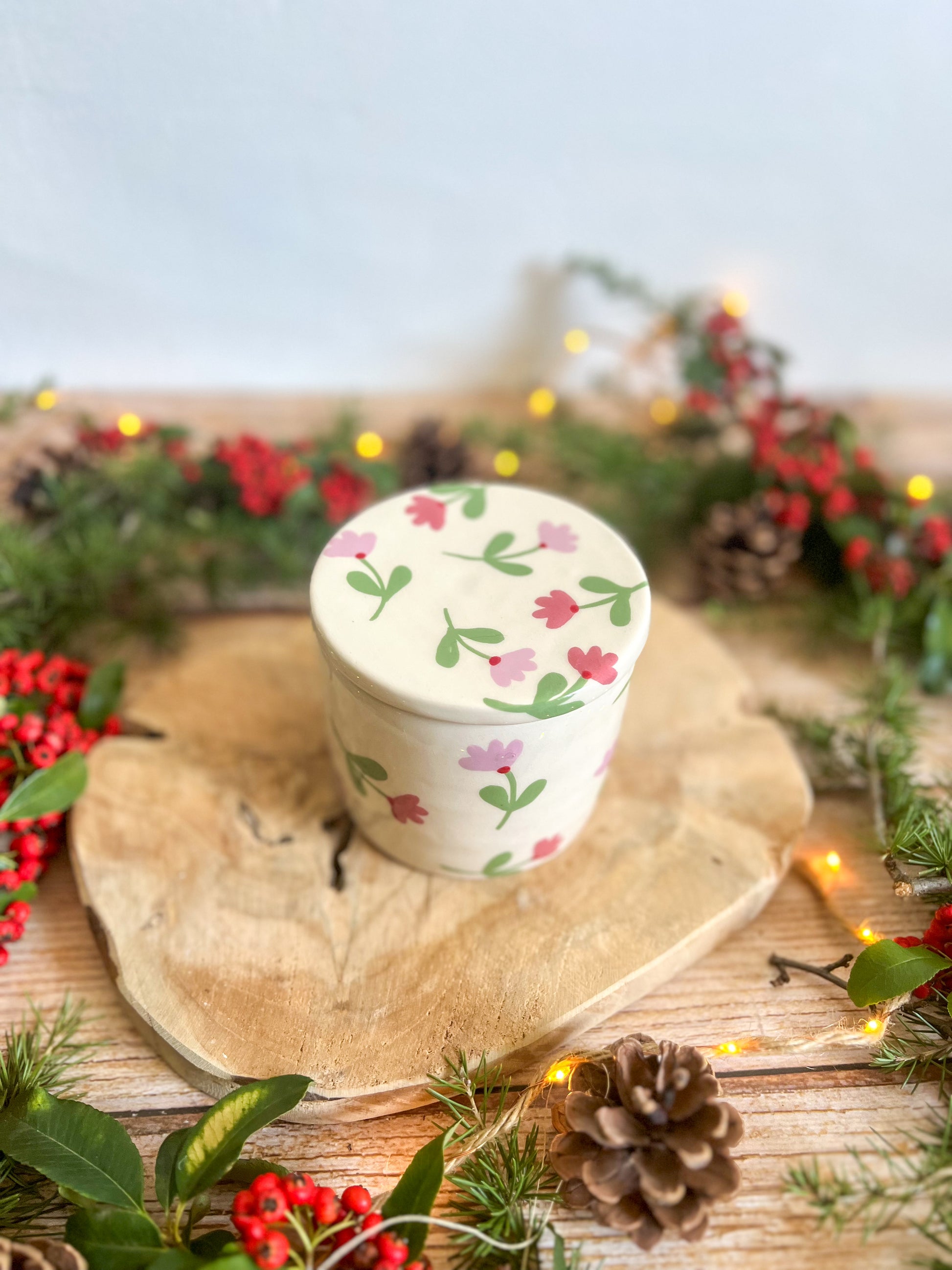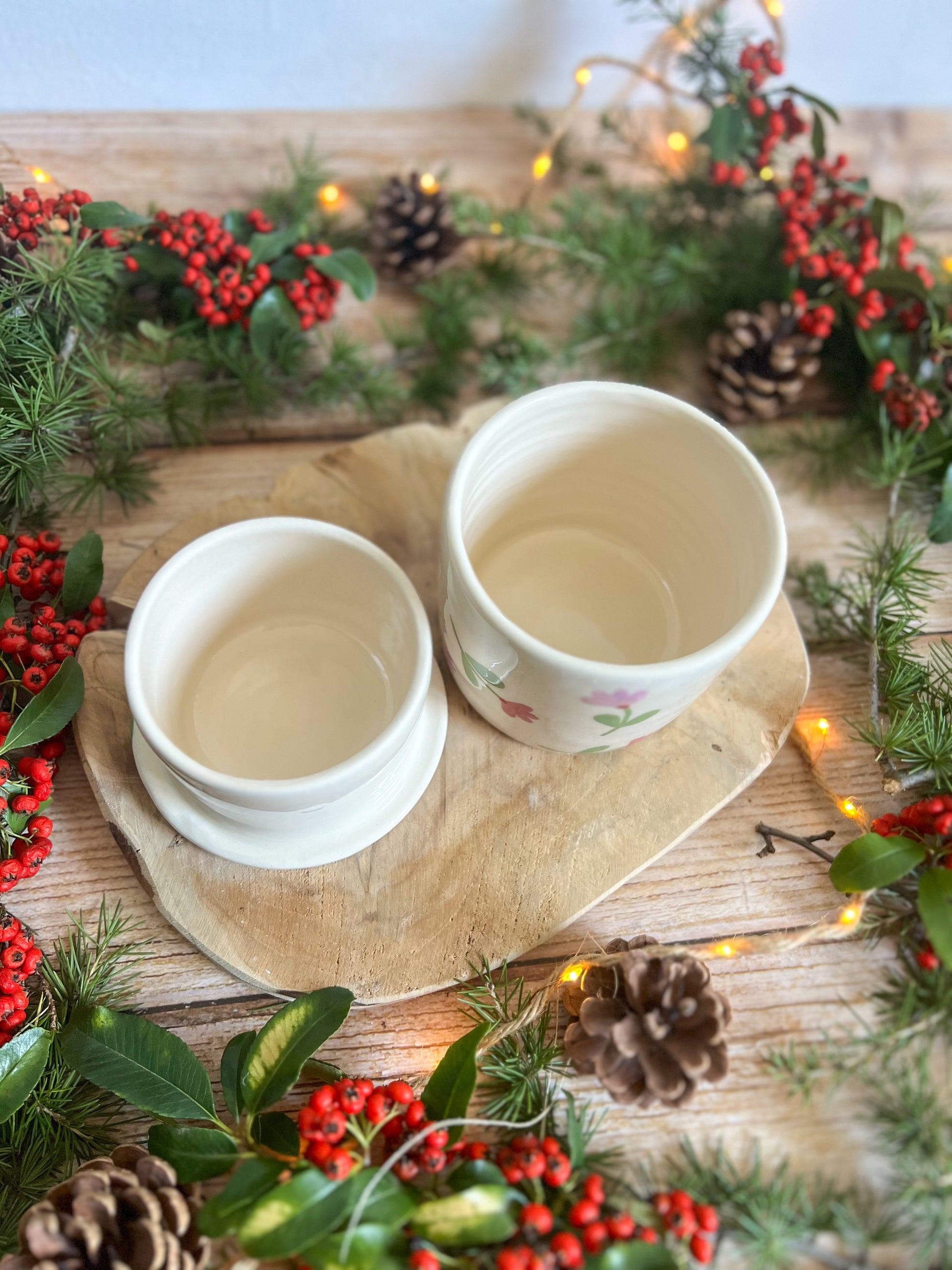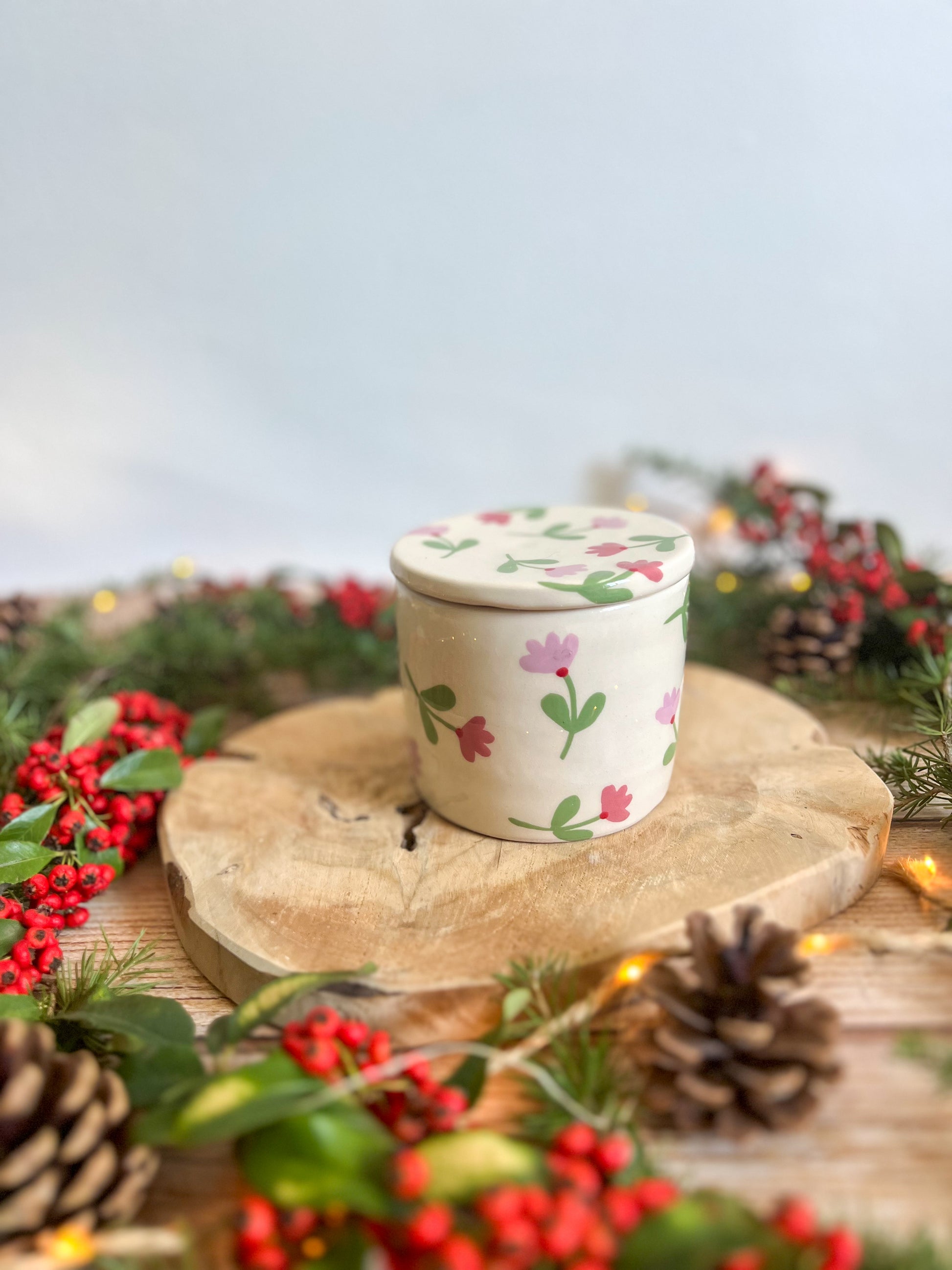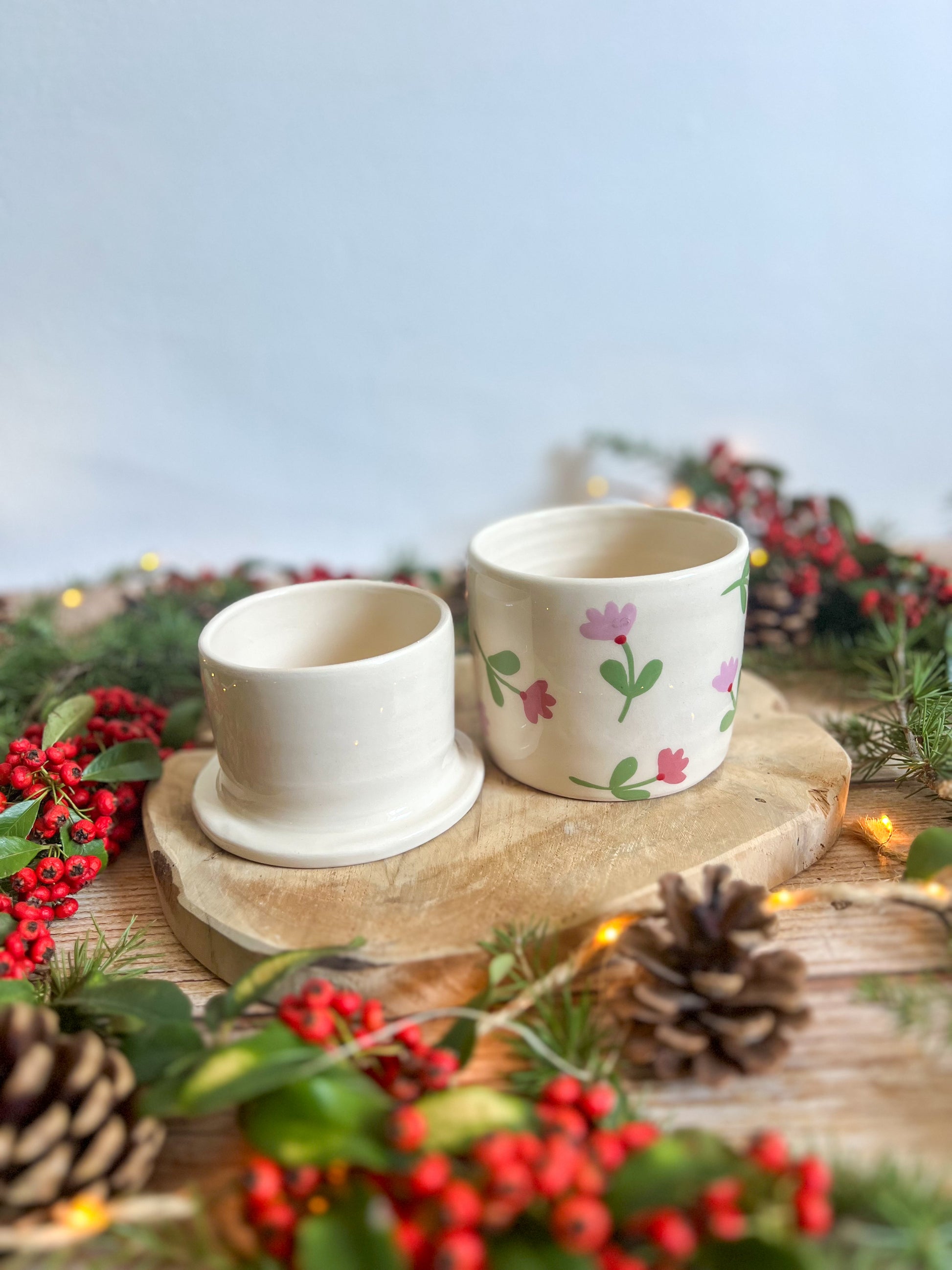 Beurrier à eau décoré de fleurs rouges et roses, qui en font une pièce douce et poétique 🌸