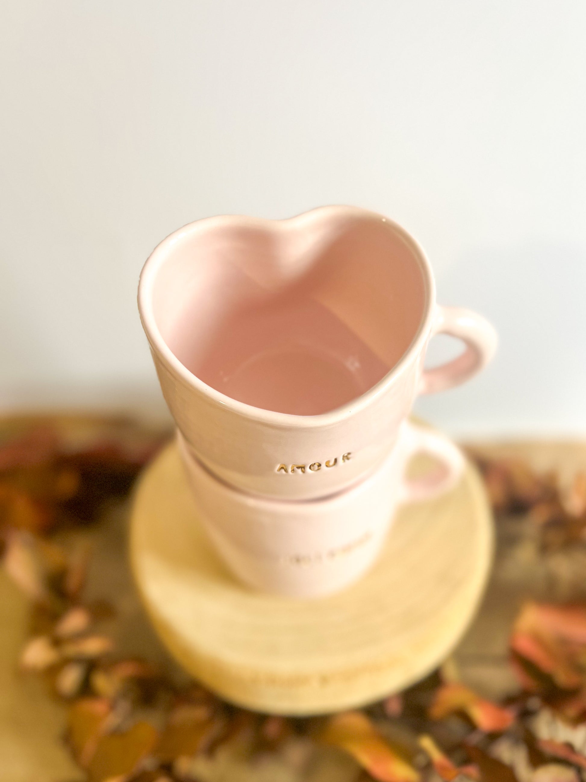 Ce mug en faïence, façonné à la main et entièrement émaillé en rose, est orné de petits mots doux « Joli Cœur » ou « Amour » en or. 💕