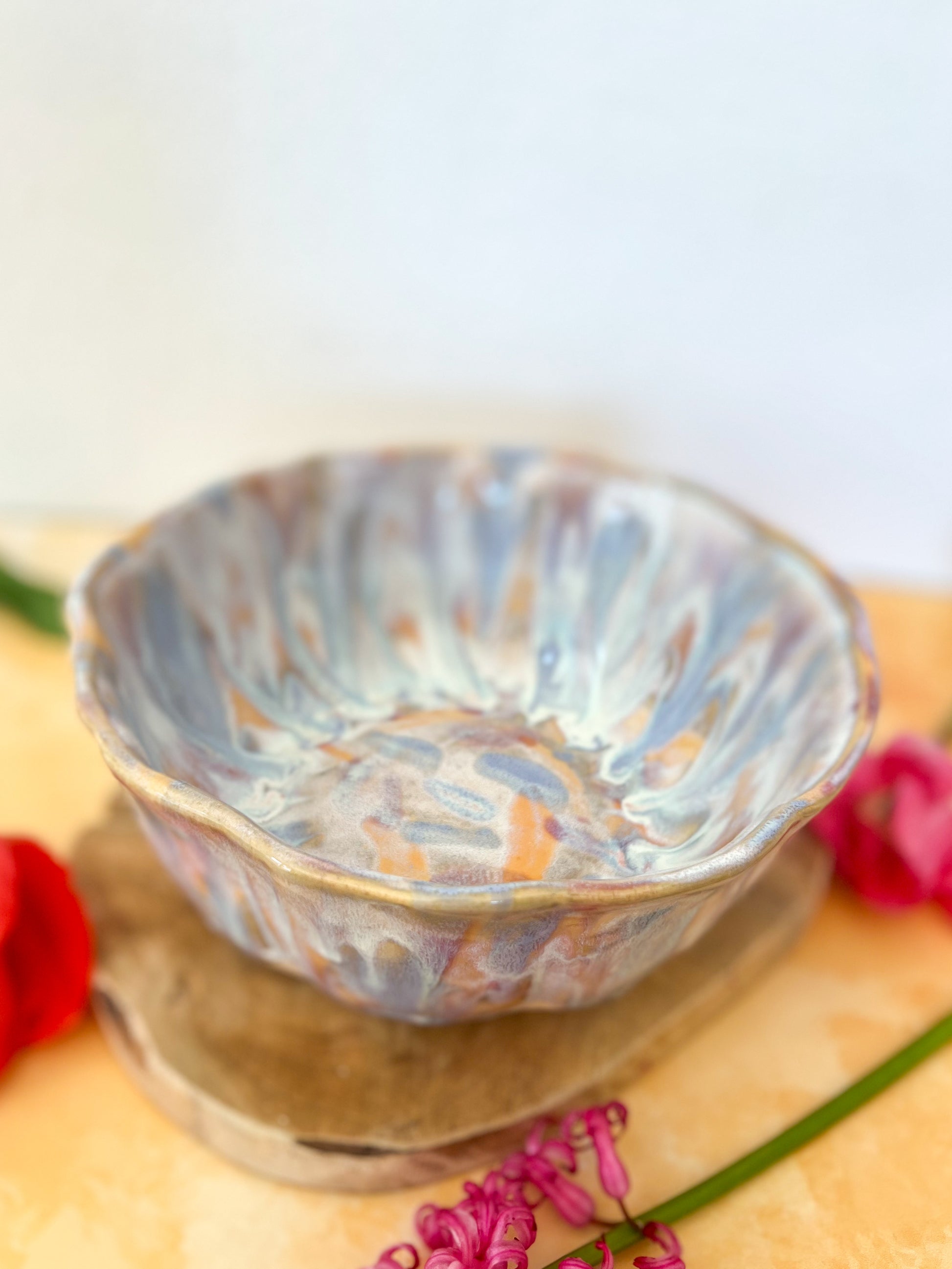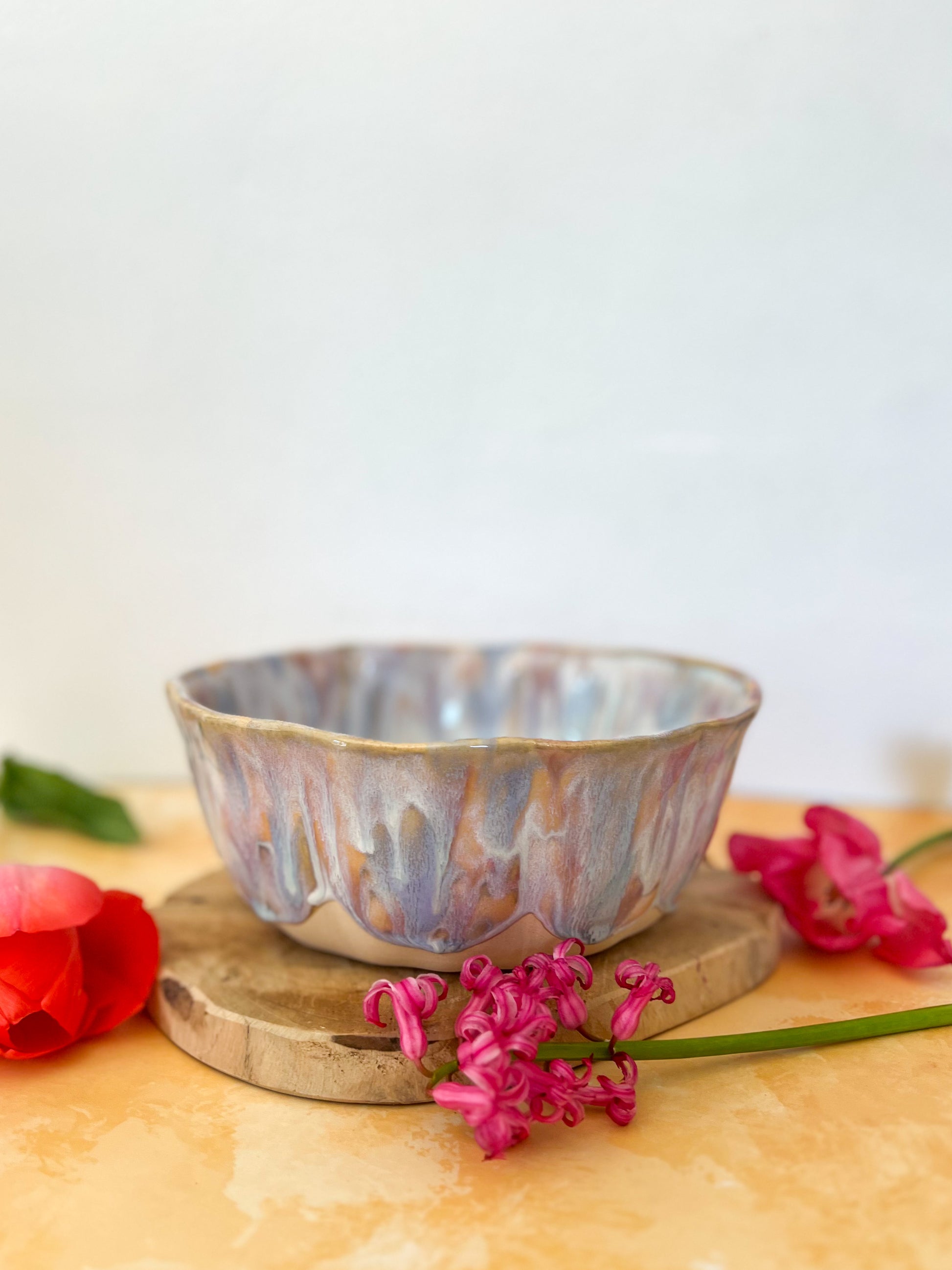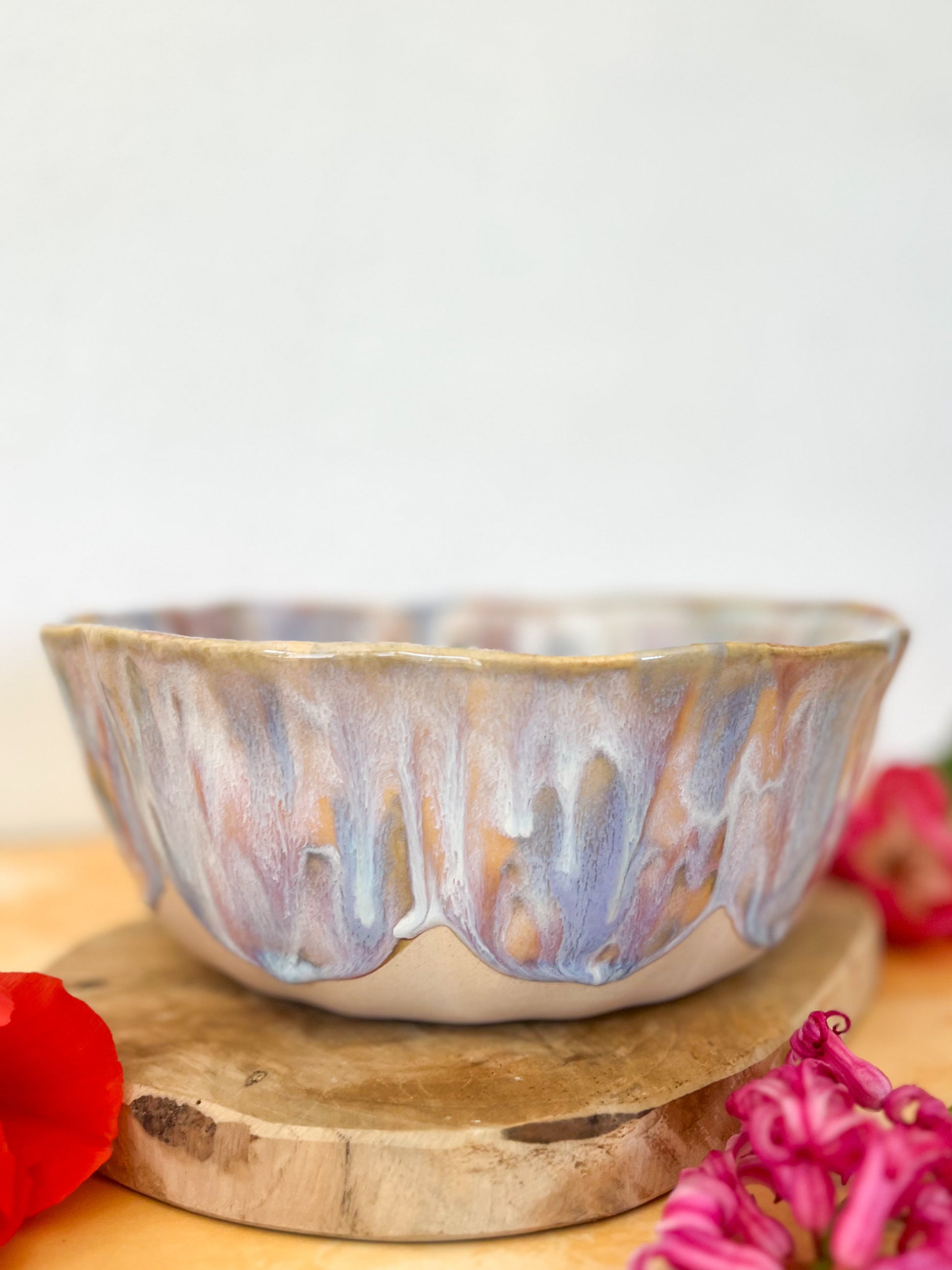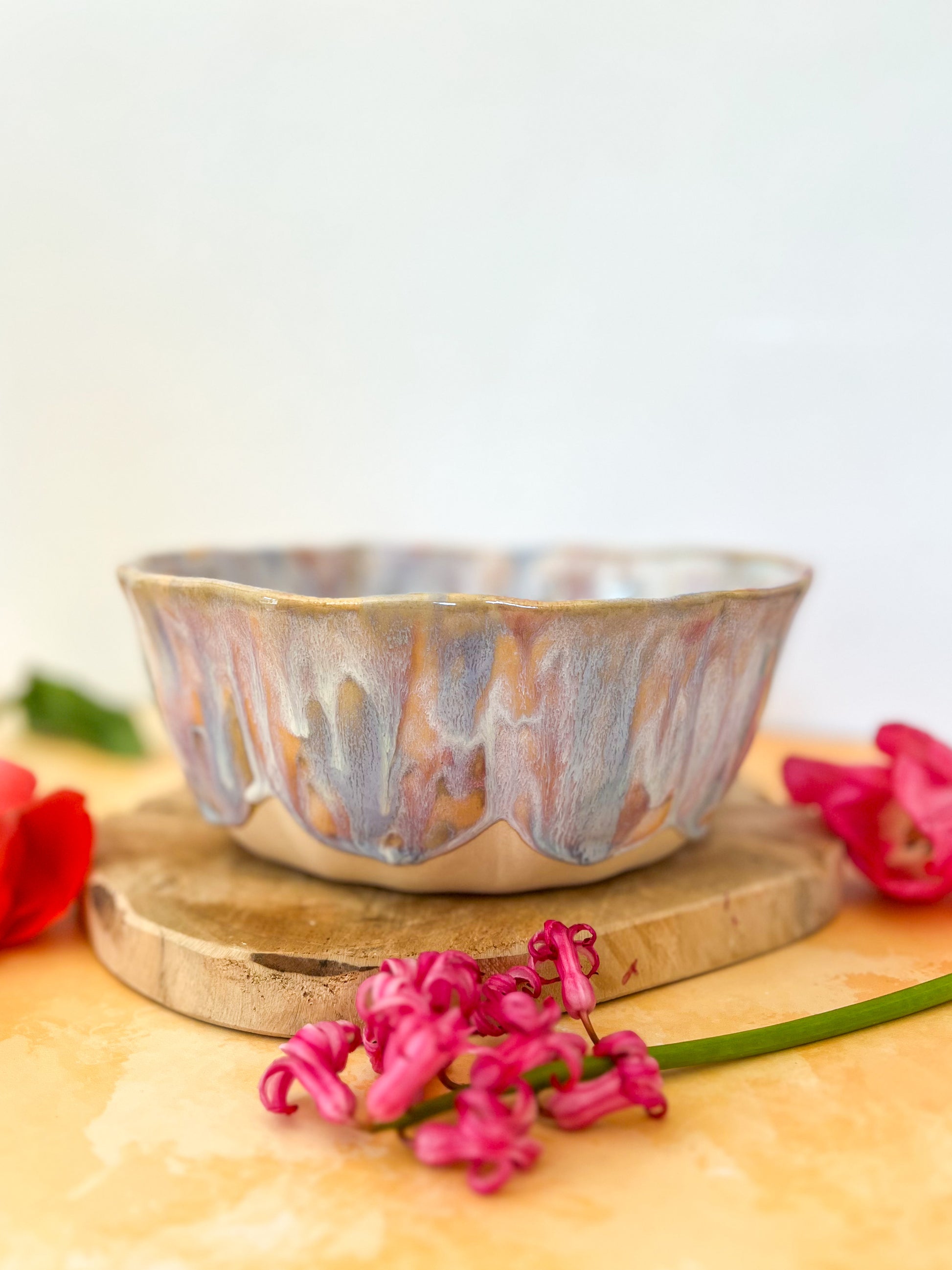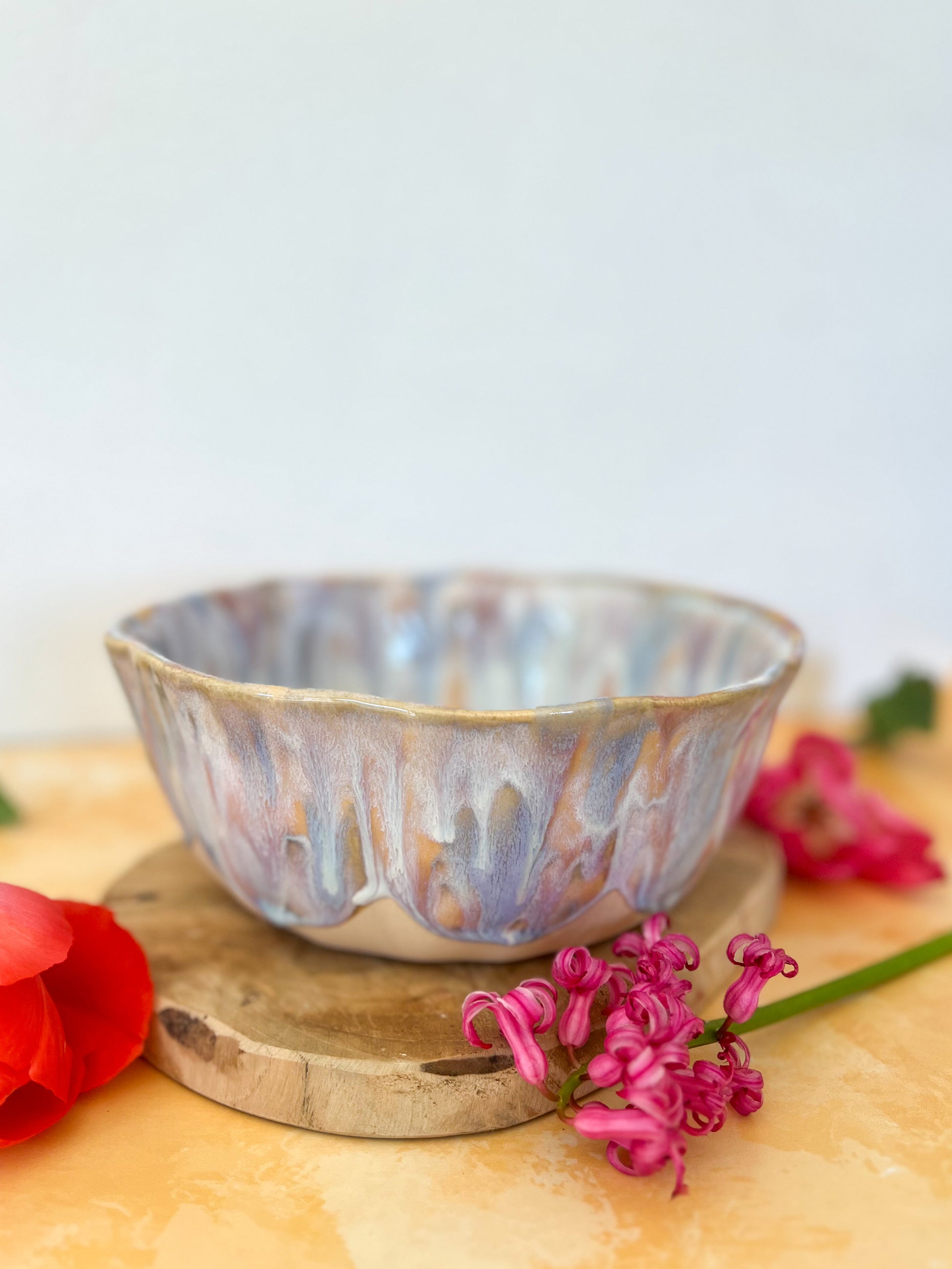 Inspiré par la douceur des fleurs et la poésie des couleurs en mouvement, ce grand saladier en grès présente des bords délicatement ondulés, sublimés par un dégradé lumineux de lilas, blanc, rose et rouge, créant un subtil effet arc-en-ciel.