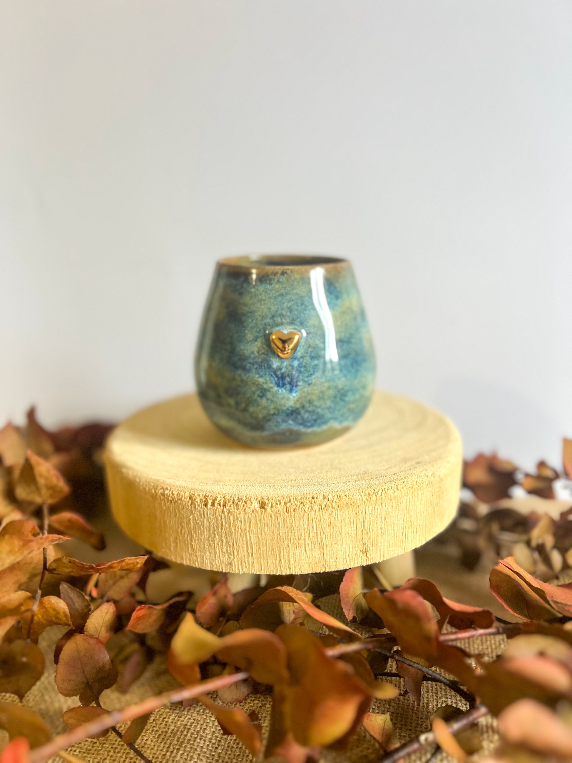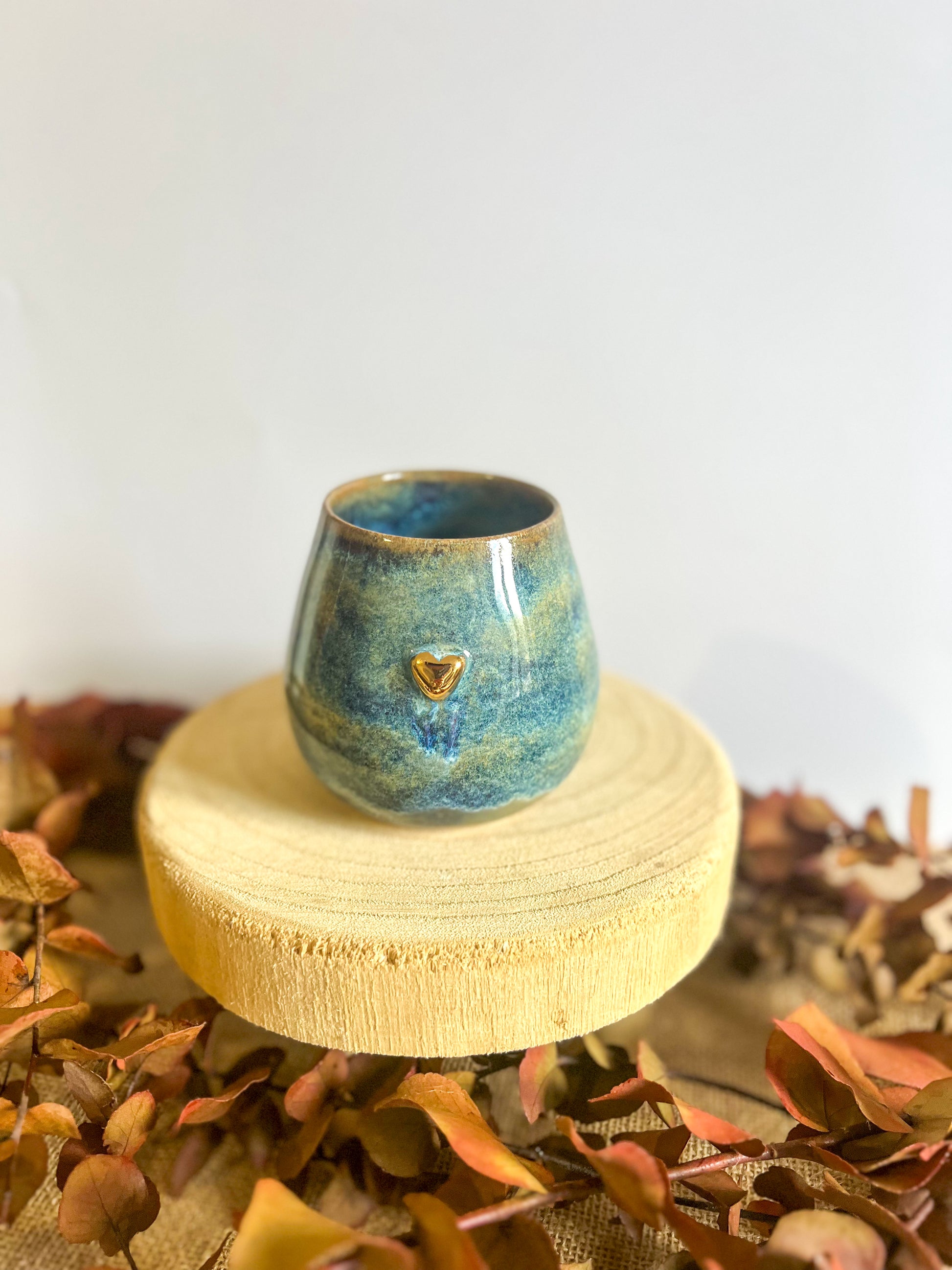 Tasse en grès, façonné à la main avec son petit cœur délicatement rehaussée d’or, qui se détache sur un superbe dégradé de couleurs mêlant rouges profonds, violets intenses et touches de rose.