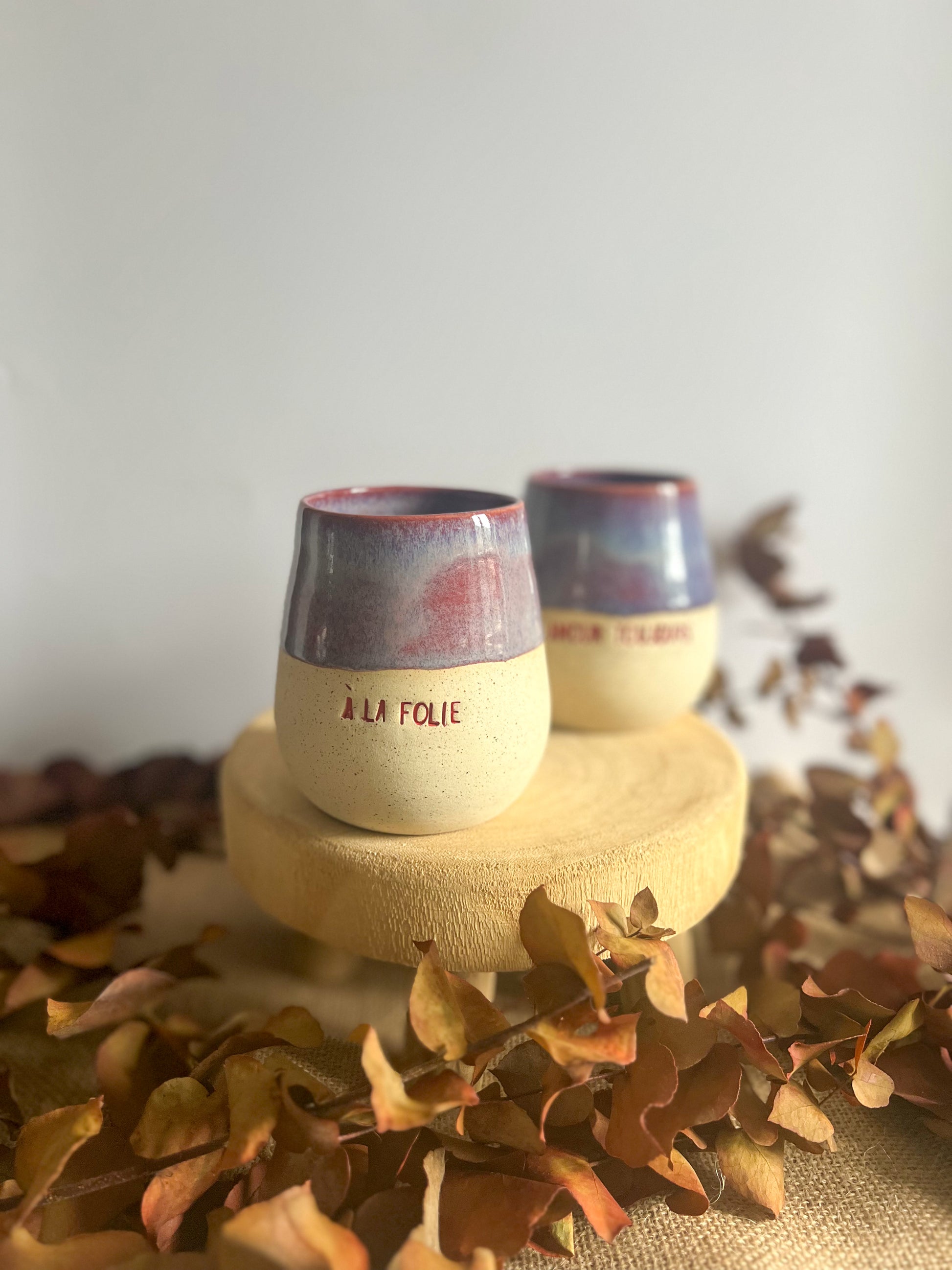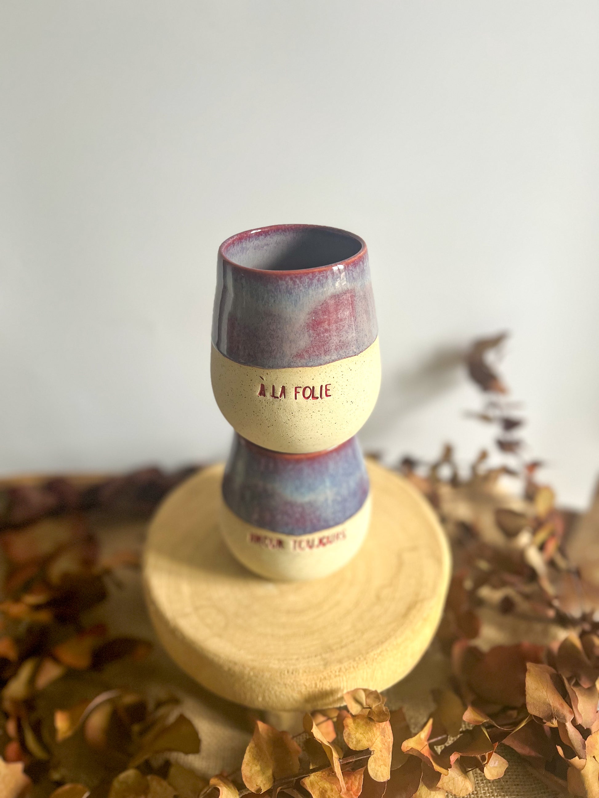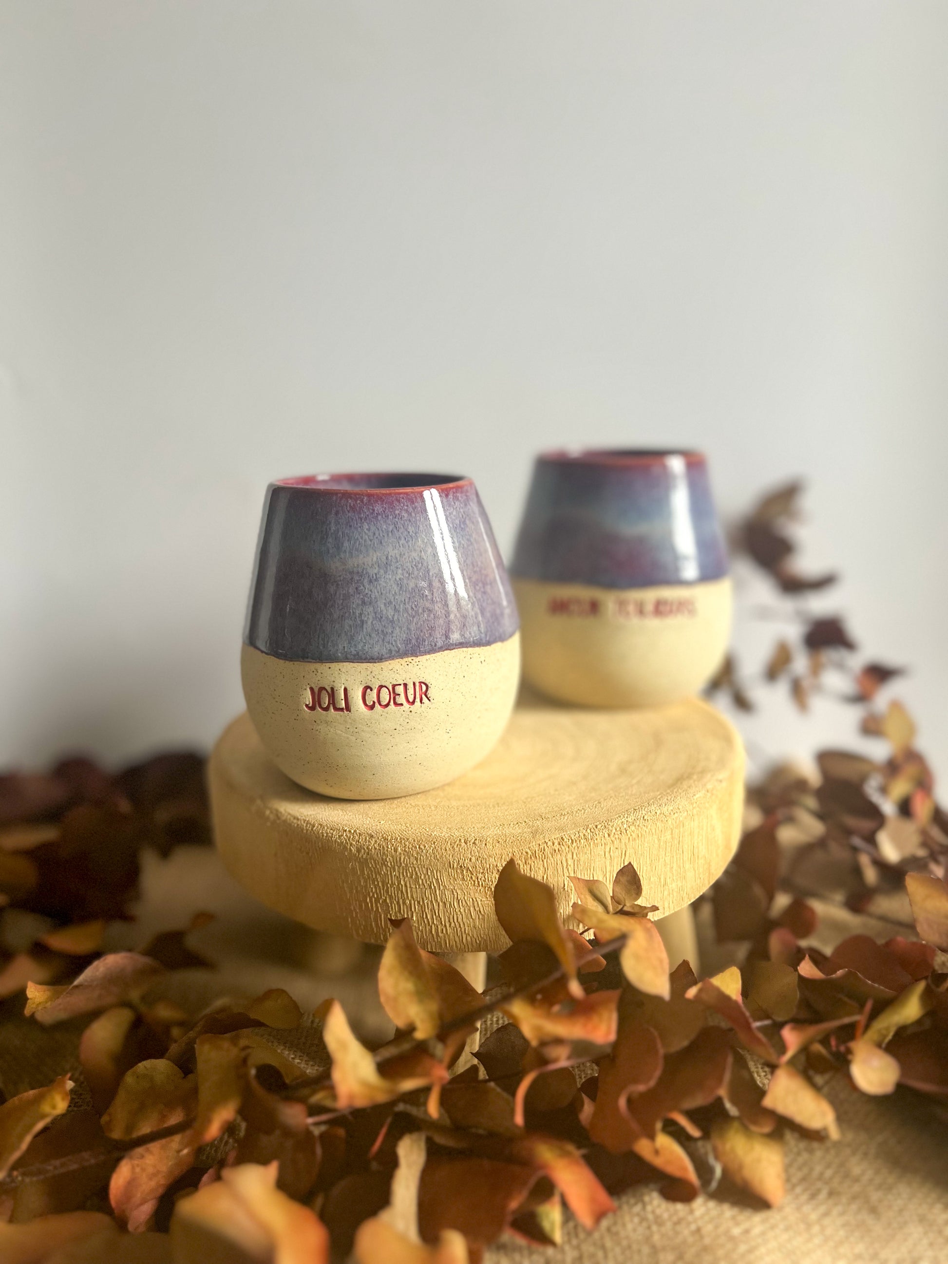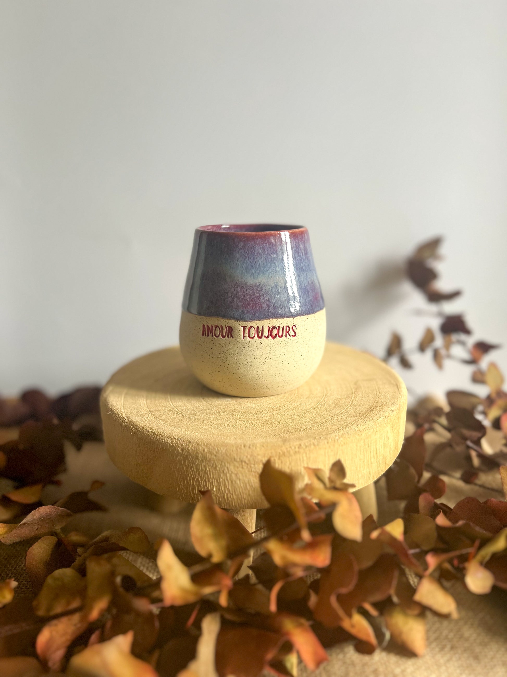Tasse en grès, façonné à la main avec son petit mot doux et son superbe dégradé de violet intense.