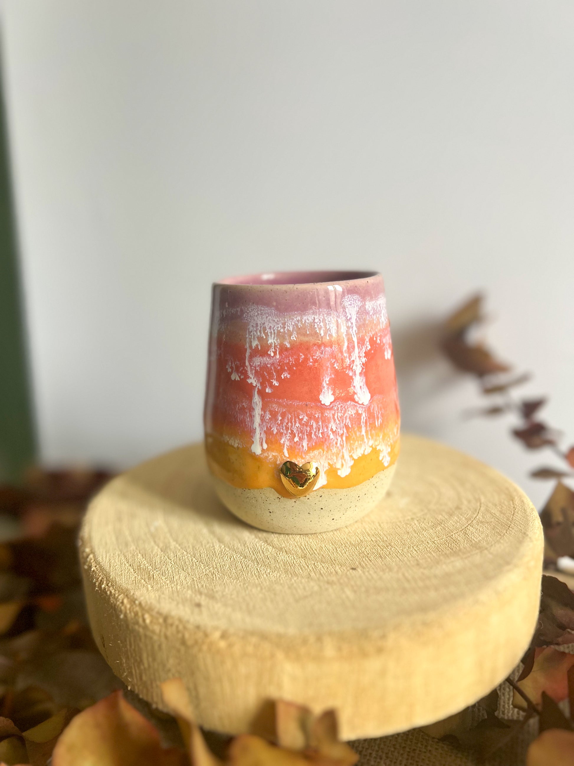 Tasse en grès, façonné à la main avec son petit cœur délicatement rehaussée d’or, qui se détache sur un superbe dégradé d’orange, violet et jaune intense.