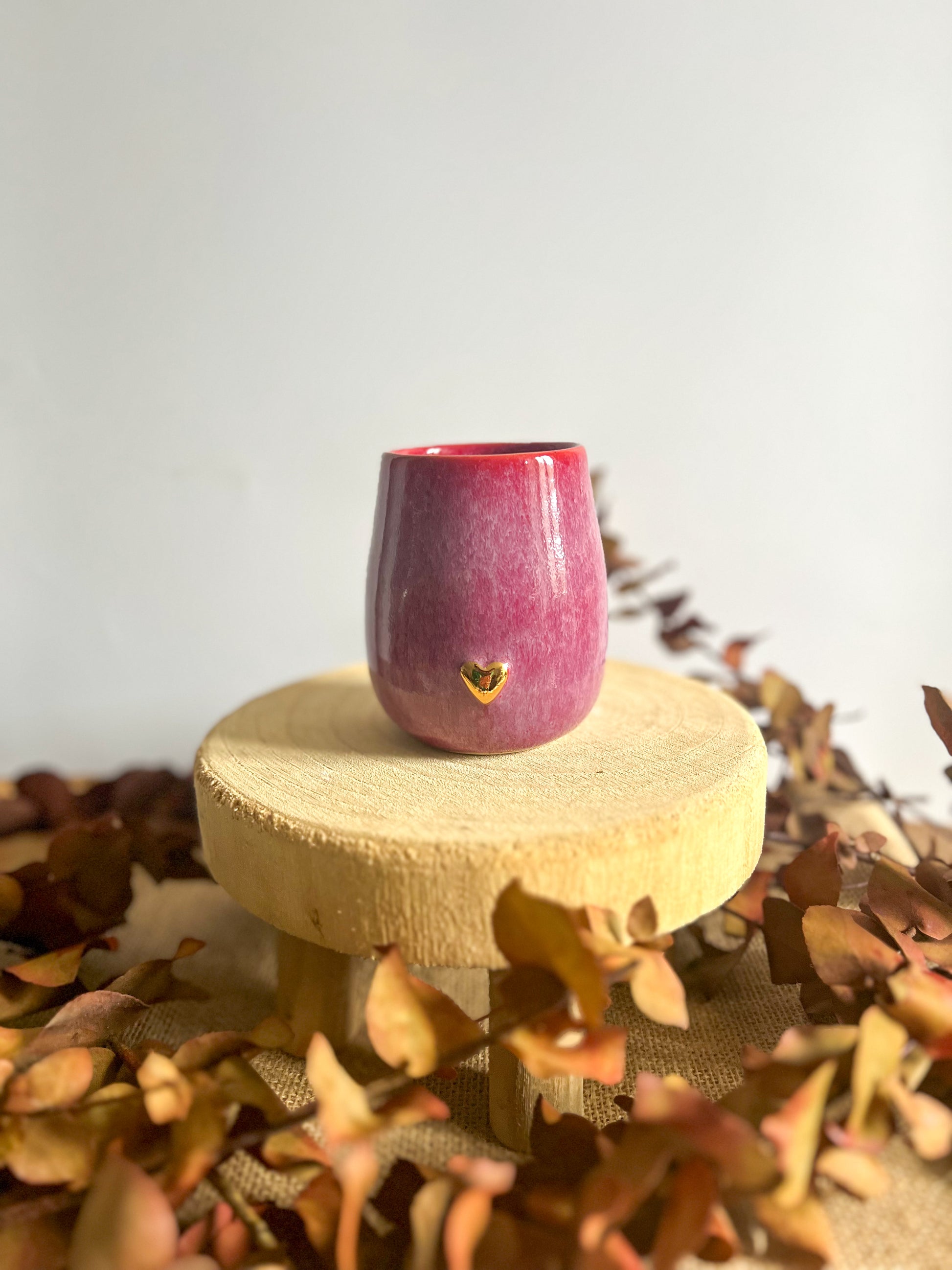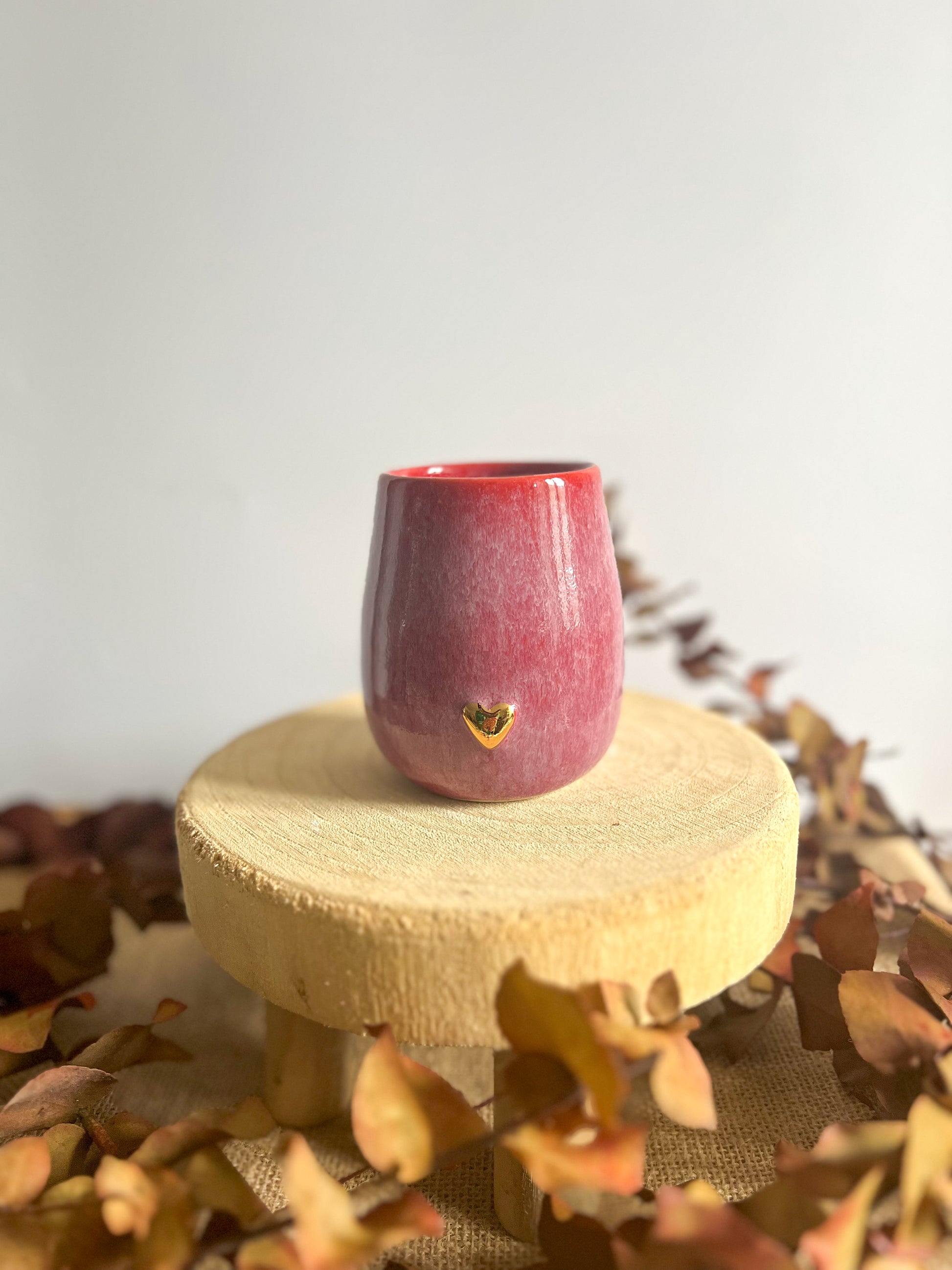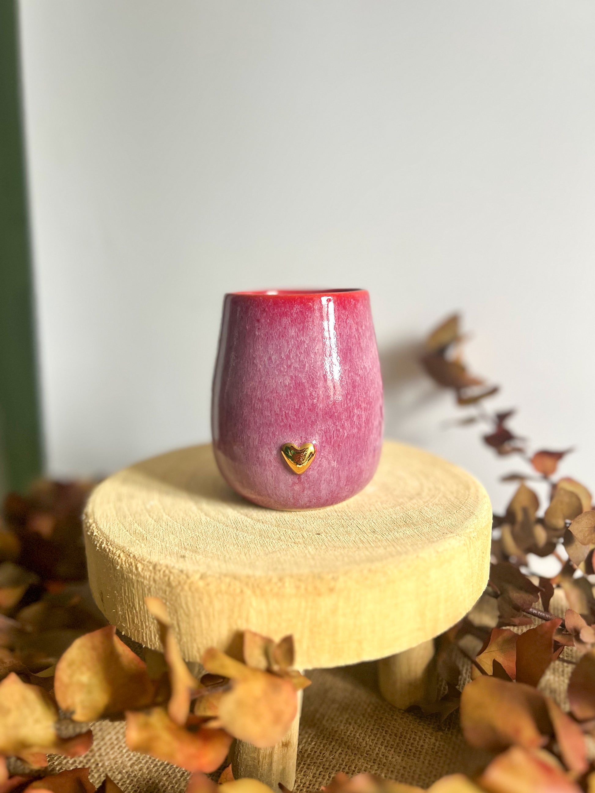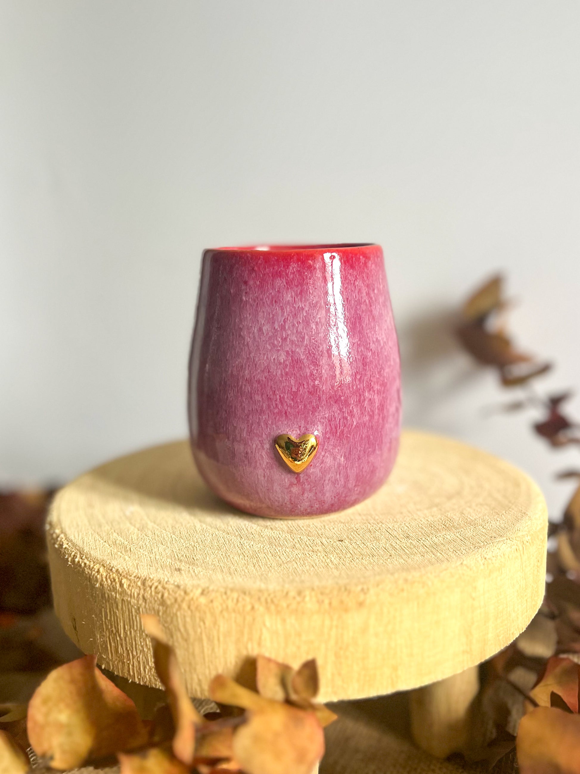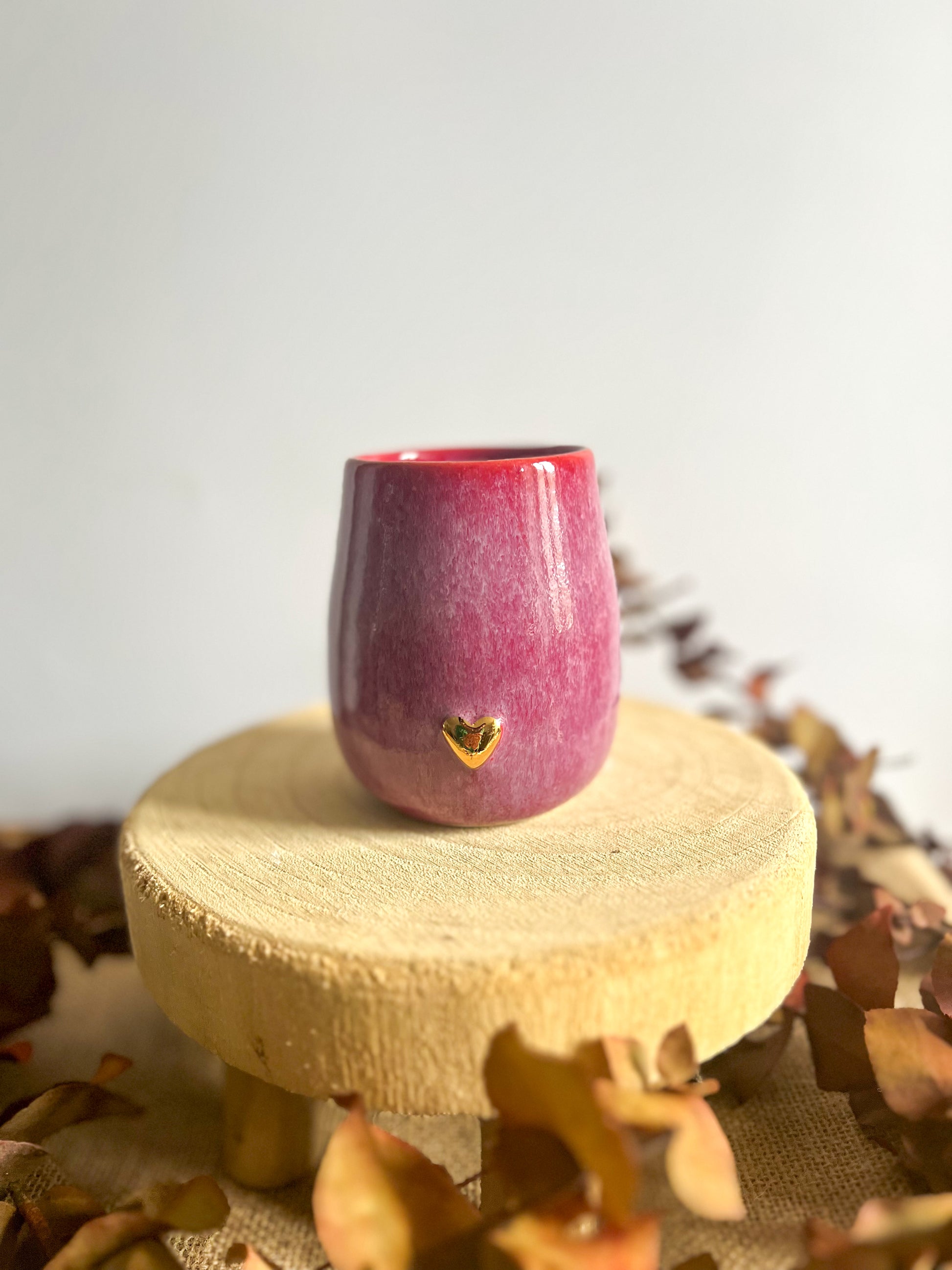 Tasse en grès, façonné à la main avec son petit cœur délicatement rehaussée d’or, qui se détache sur un superbe dégradé de rouges/violets profonds.