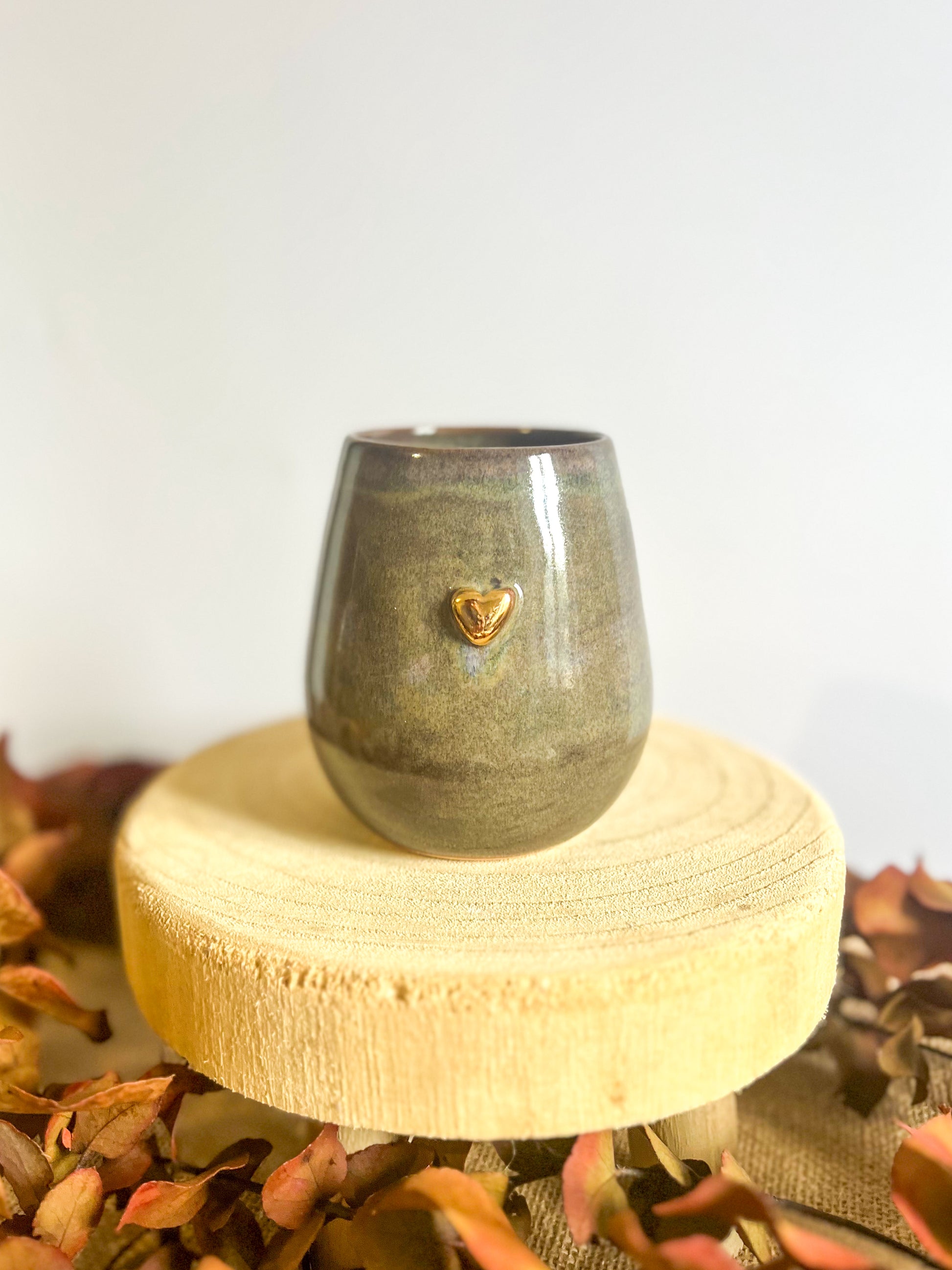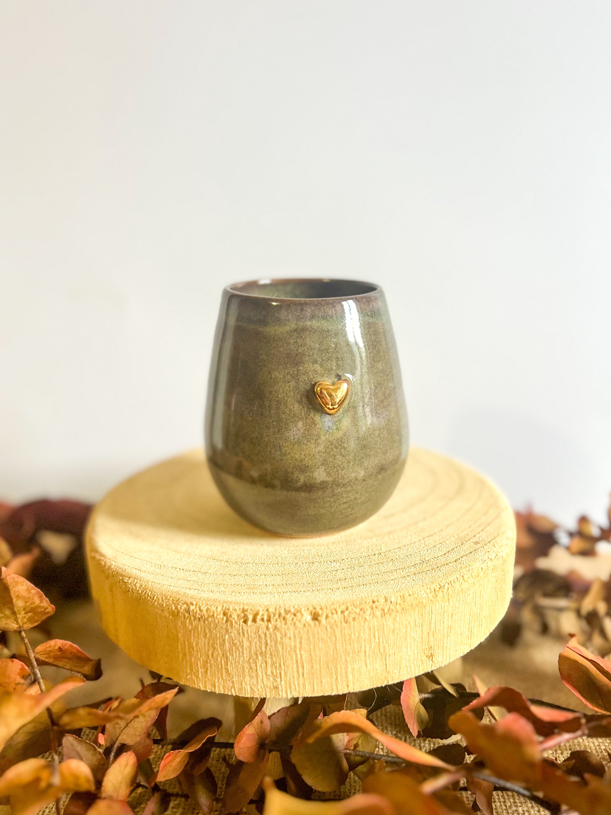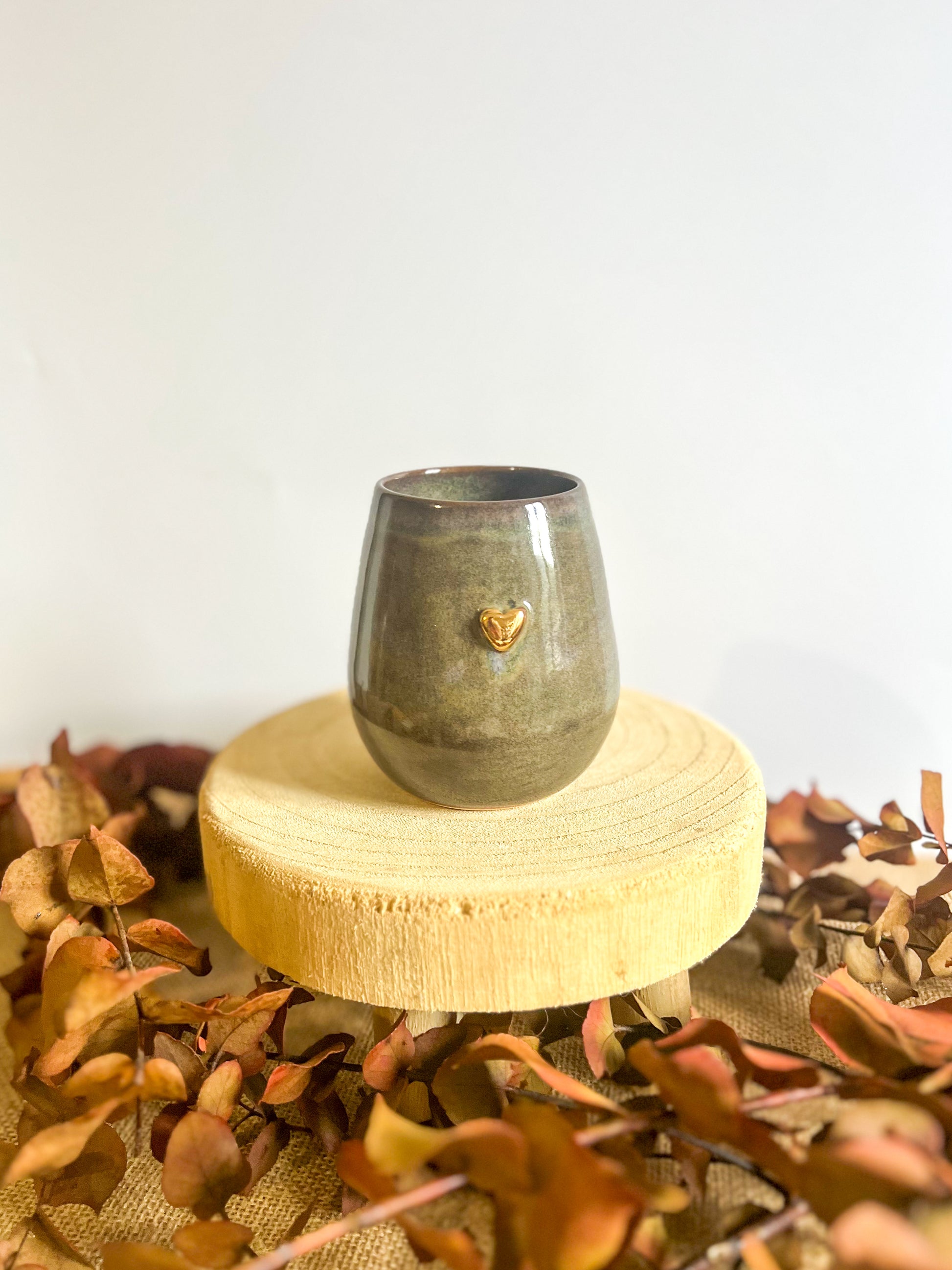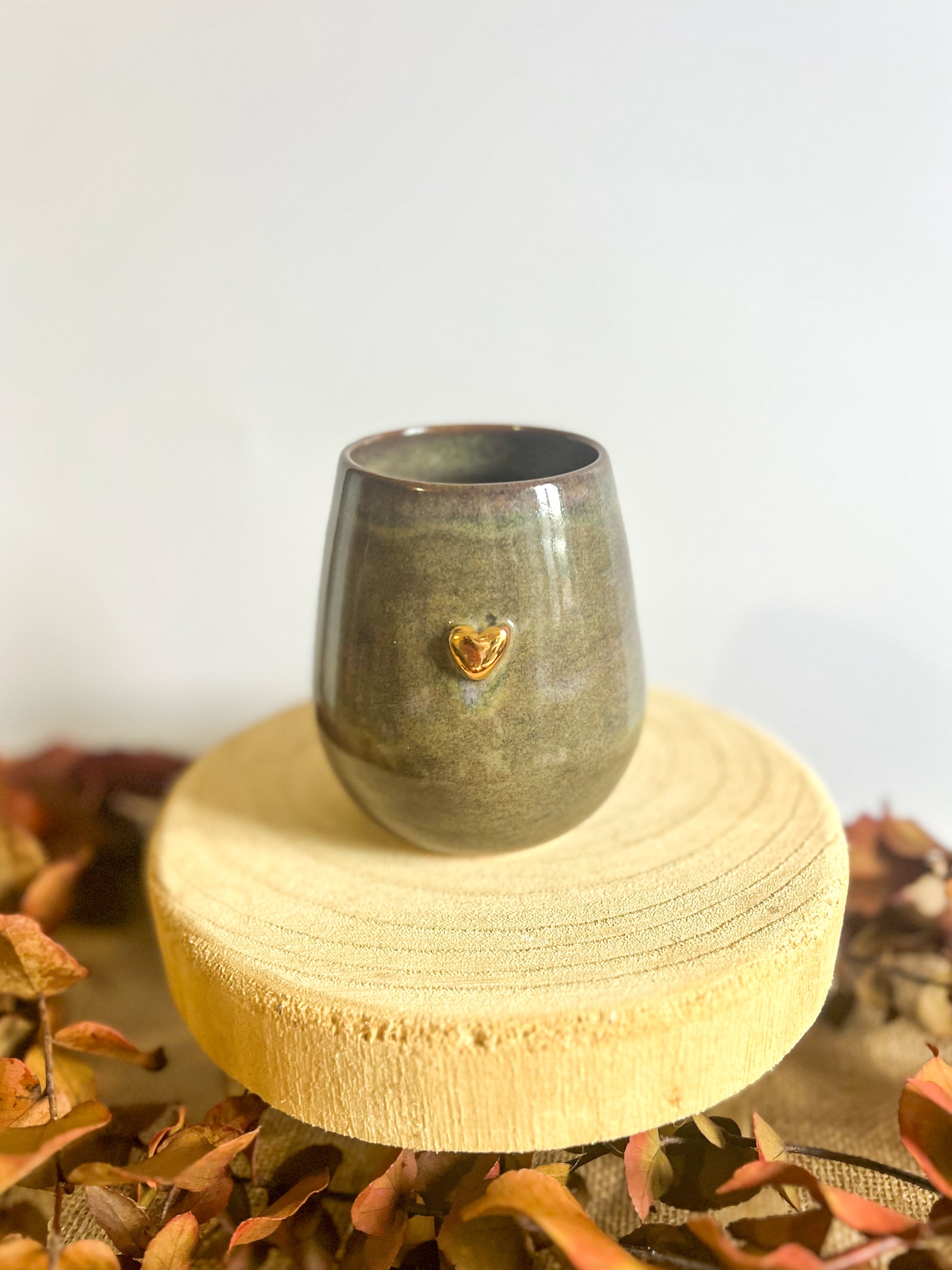 Tasse en grès, façonné à la main avec son petit cœur délicatement rehaussée d’or, qui se détache sur un superbe dégradé de couleurs mêlant rouges profonds, violets intenses et touches de rose.