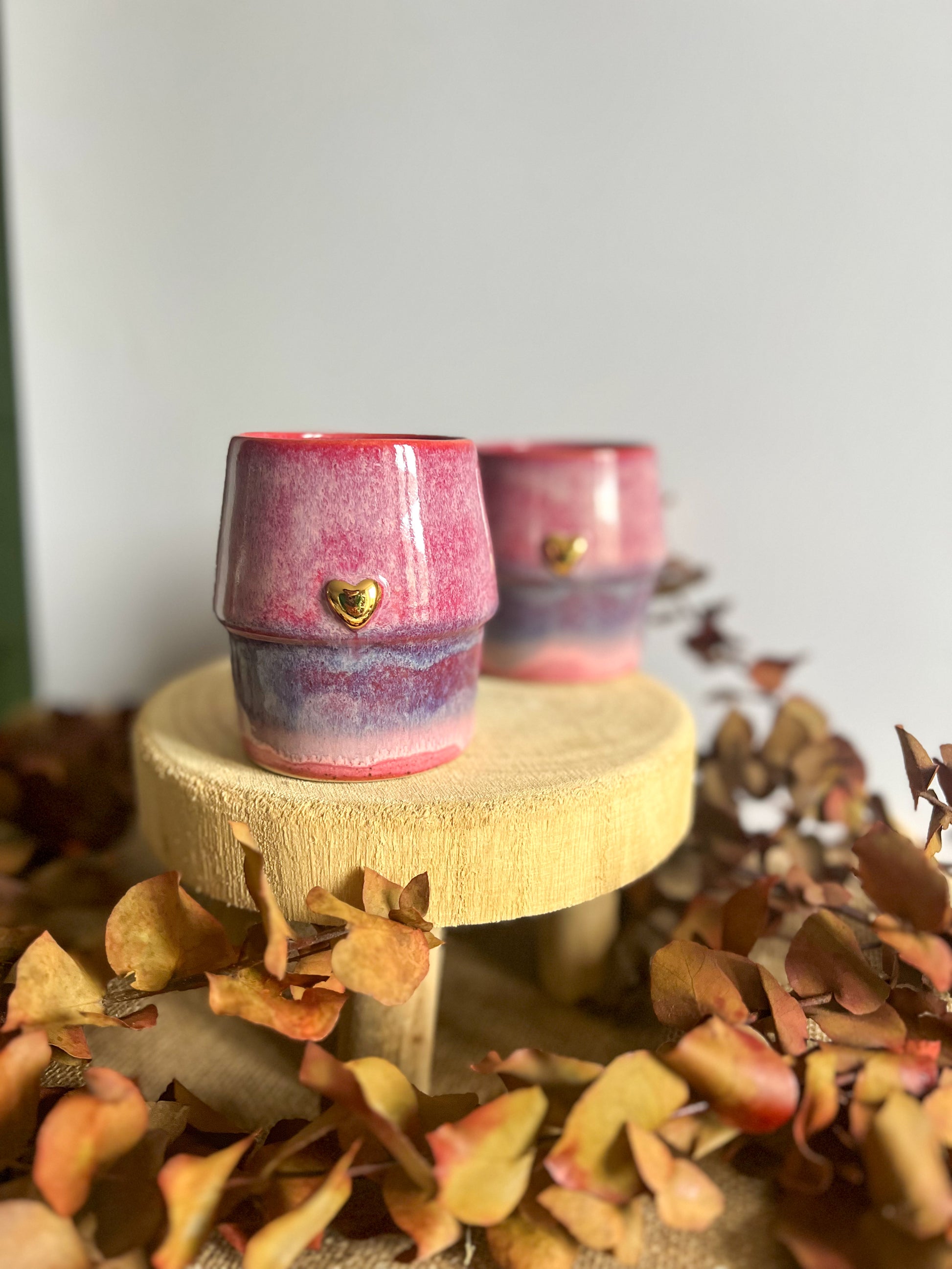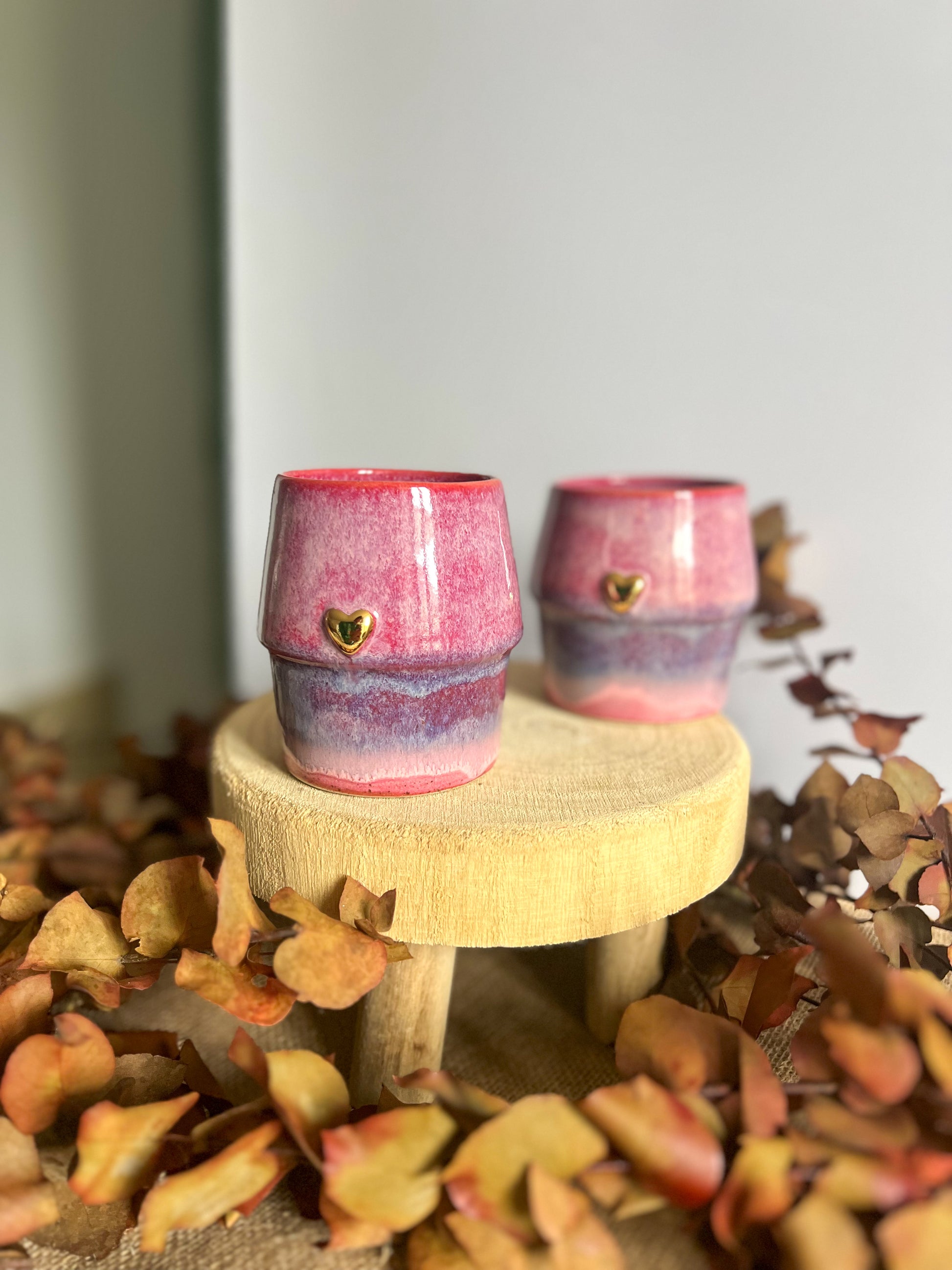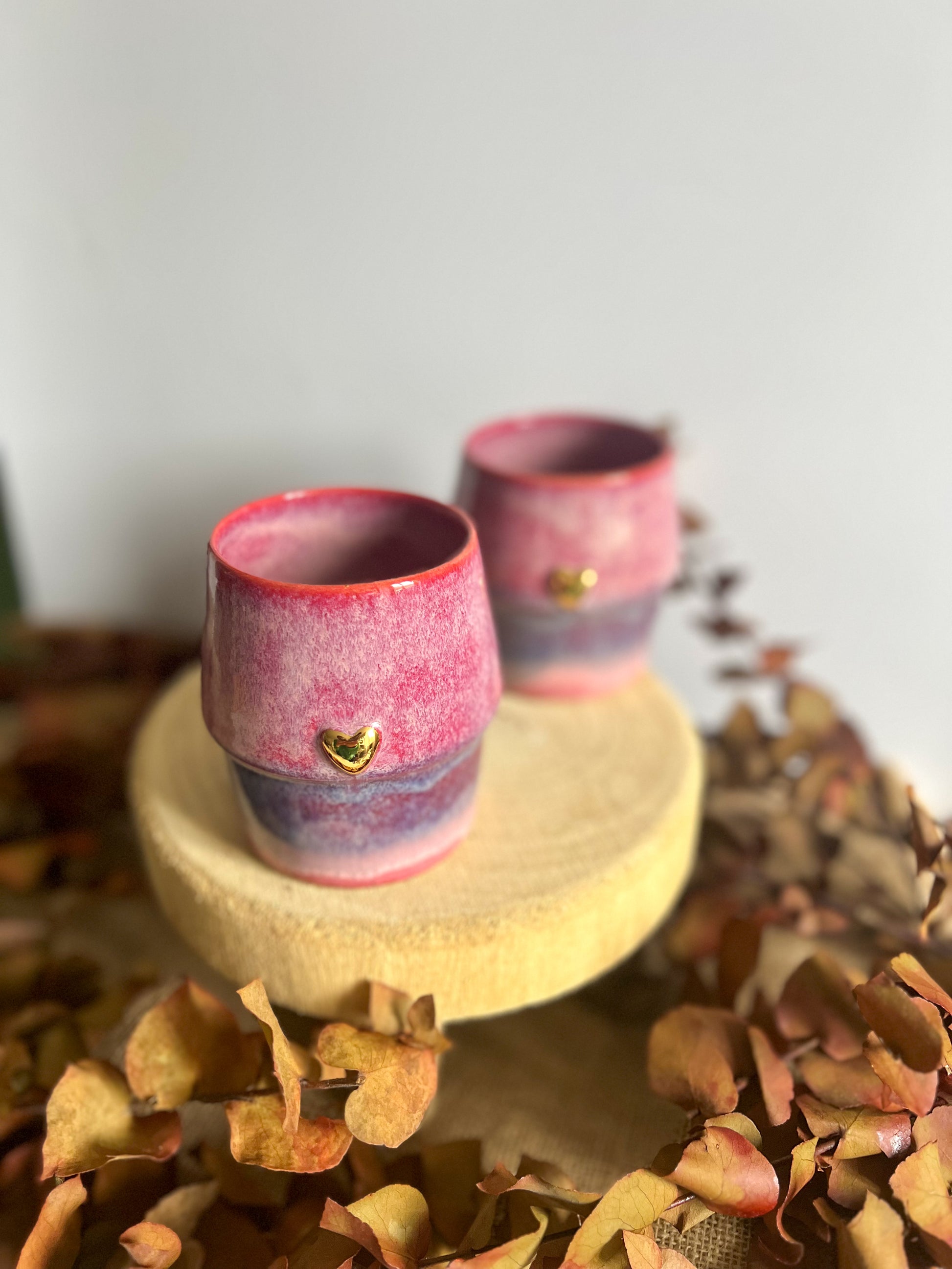Tasse en grès, façonné à la main avec son petit cœur délicatement rehaussée d’or, qui se détache sur un superbe dégradé de couleurs mêlant rouges profonds, violets intenses et touches de rose.